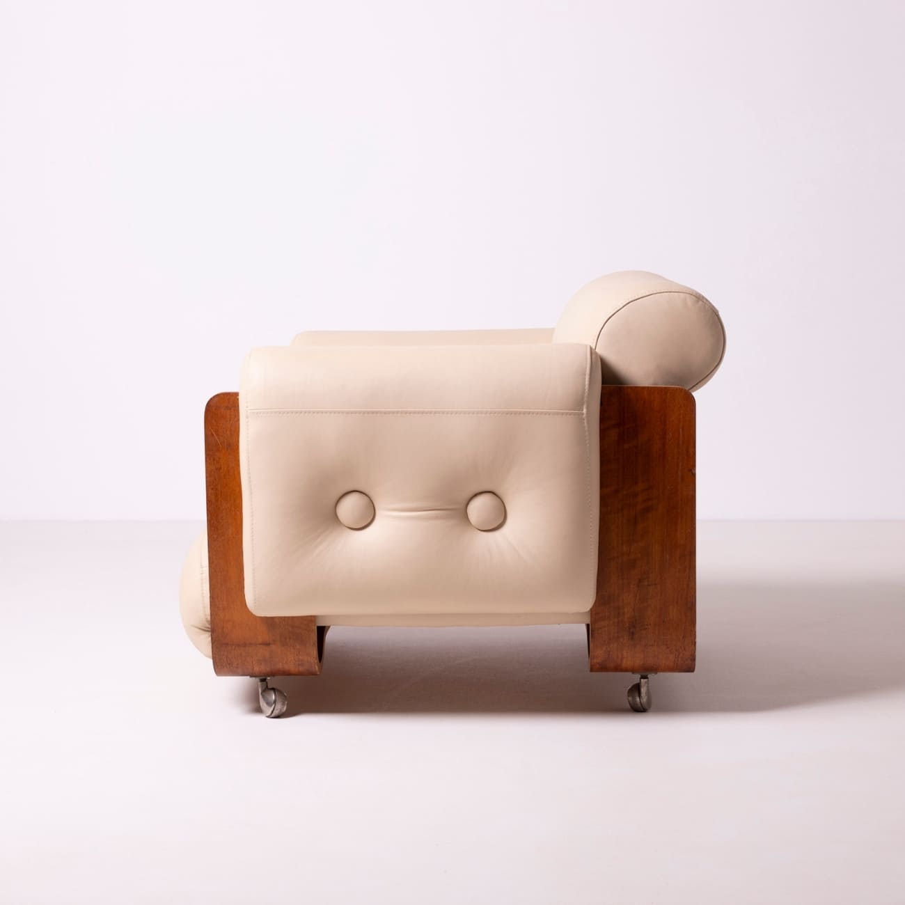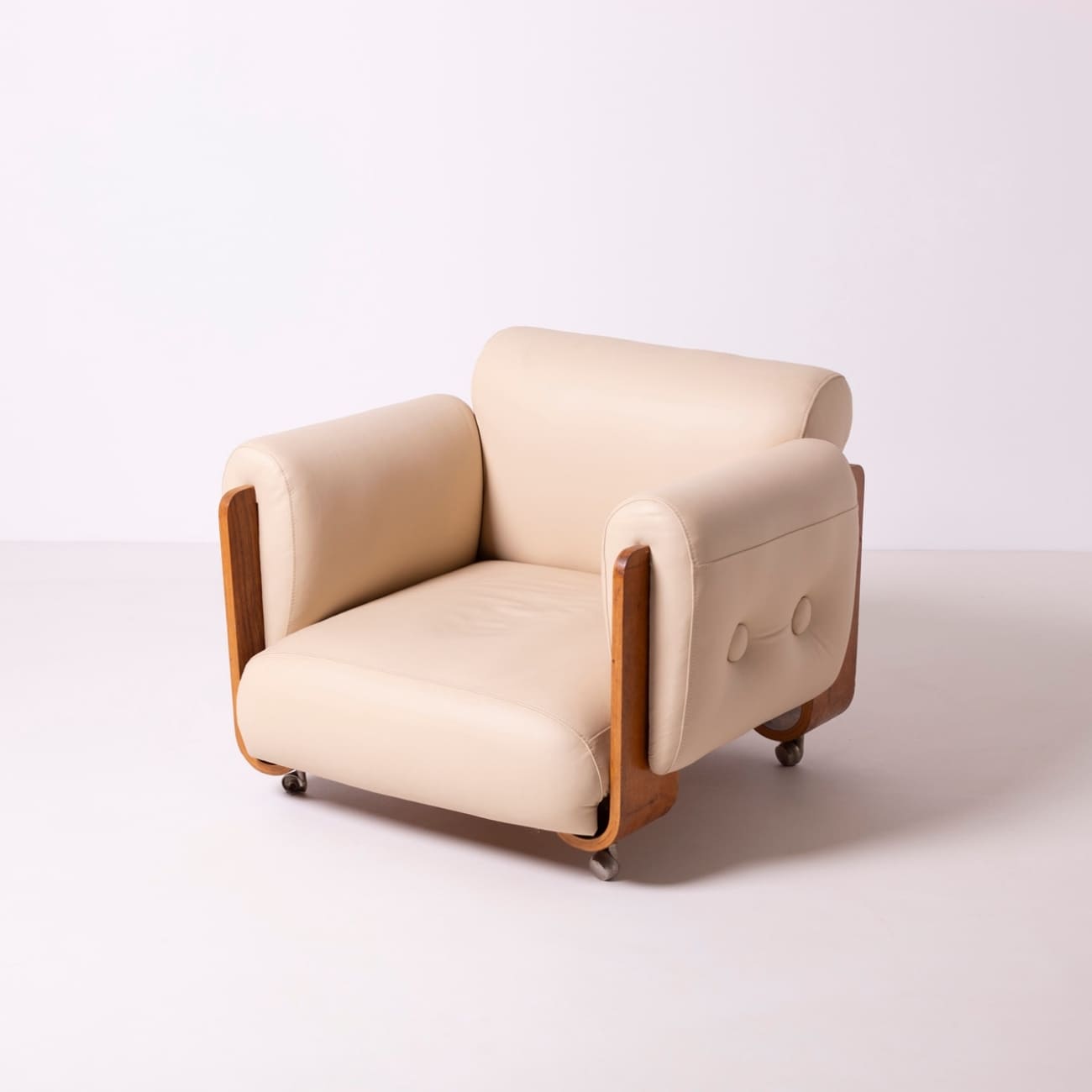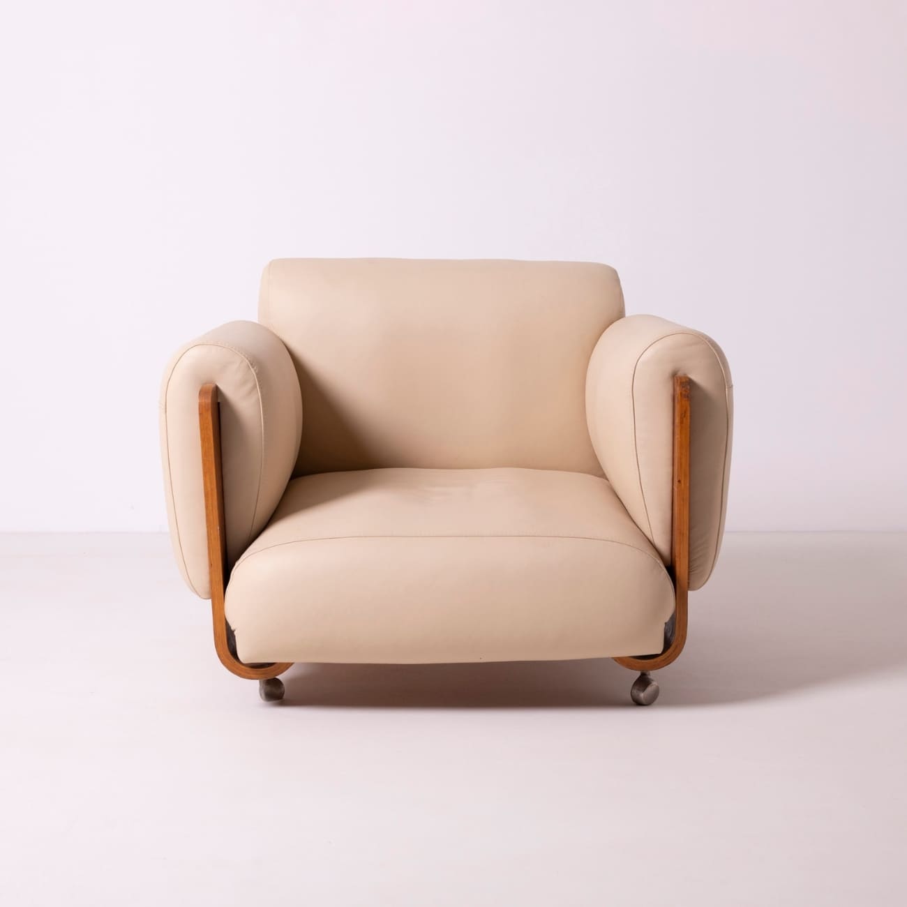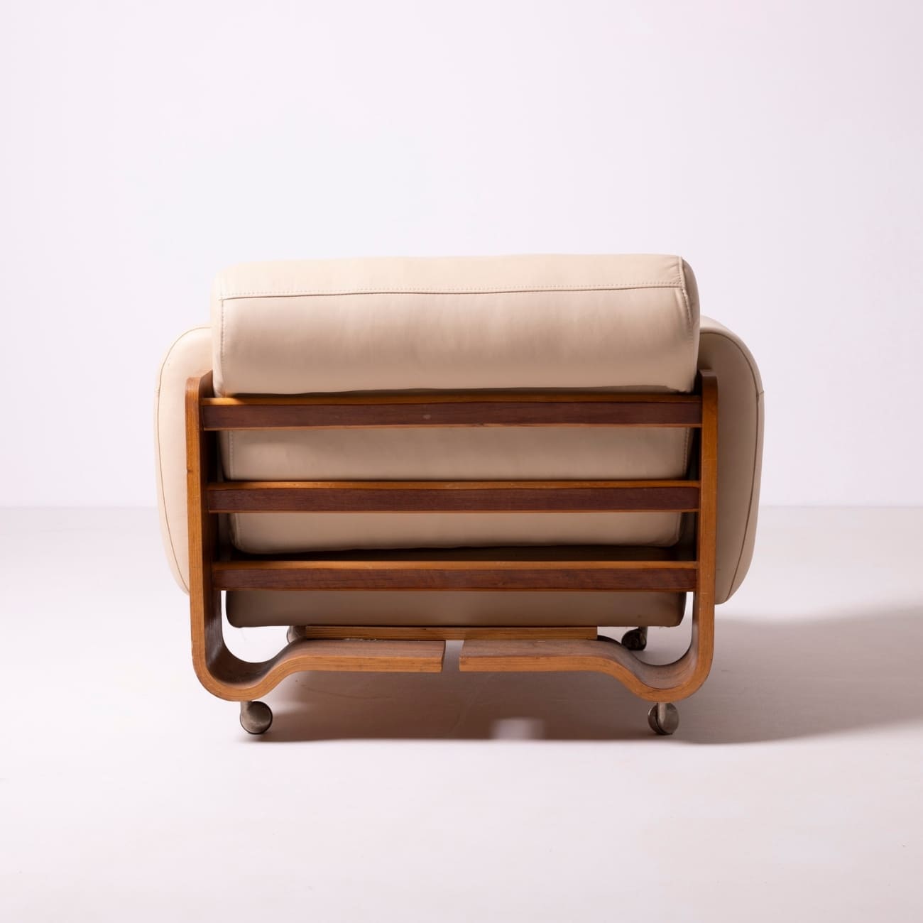 Kremowa skóra w połączeniu z giętym drewnem tworzy harmonijną, surową, a jednocześnie elegancką kompozycję. Fotel stanowi doskonały przykład czeskiego wzornictwa lat 70., łącząc estetykę brutalistyczną z codzienną funkcjonalnością i wyrafinowanym rzemiosłem.
