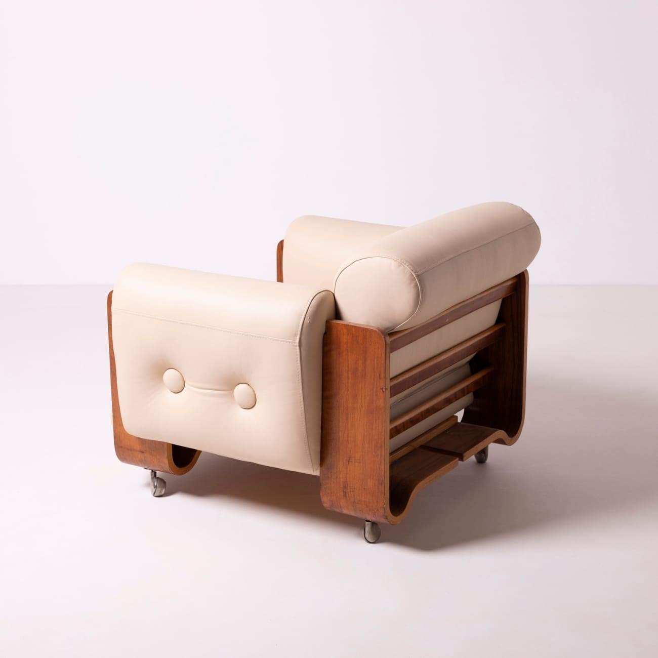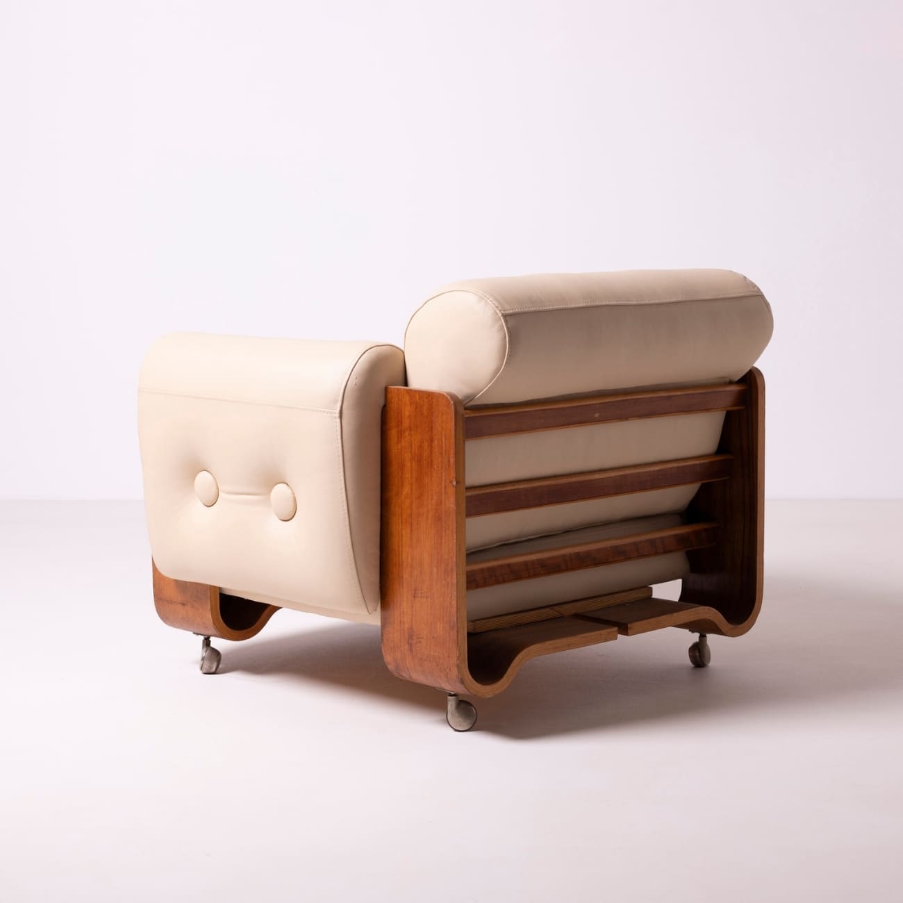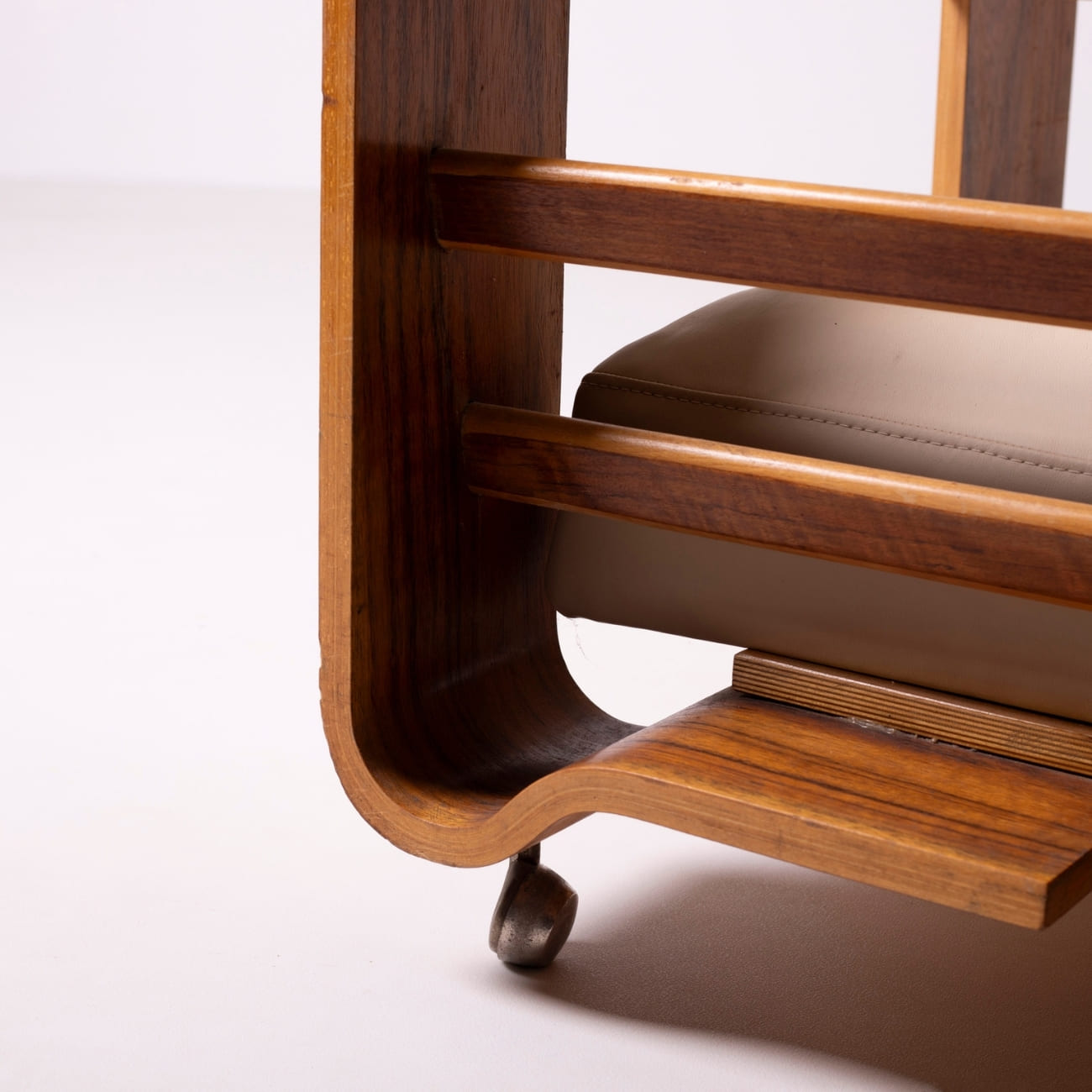 Prezentowany egzemplarz pochodzi z Czechosłowacji i został wyprodukowany przez Drevopodnik Holesova. Rama wykonana ze sklejki, wykończona na górze mahoniem, zachowana jest w oryginalnym stanie, natomiast tapicerka została odnowiona przy użyciu skóry w kolorze bardzo zbliżonym do pierwotnego. Niskie siedzisko oraz konstrukcja na kółkach nadają fotelowi wyjątkowy charakter użytkowy.