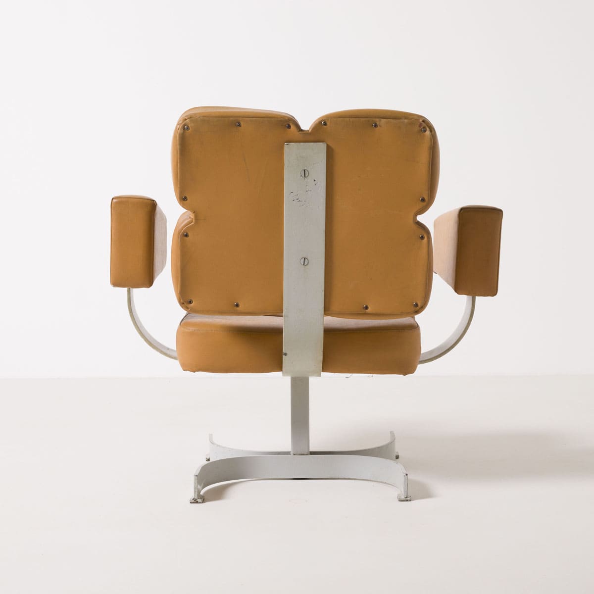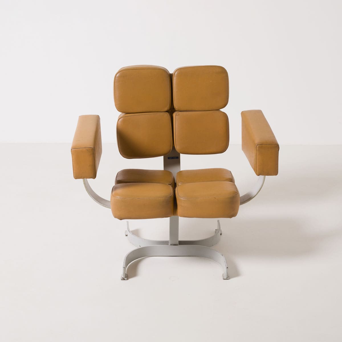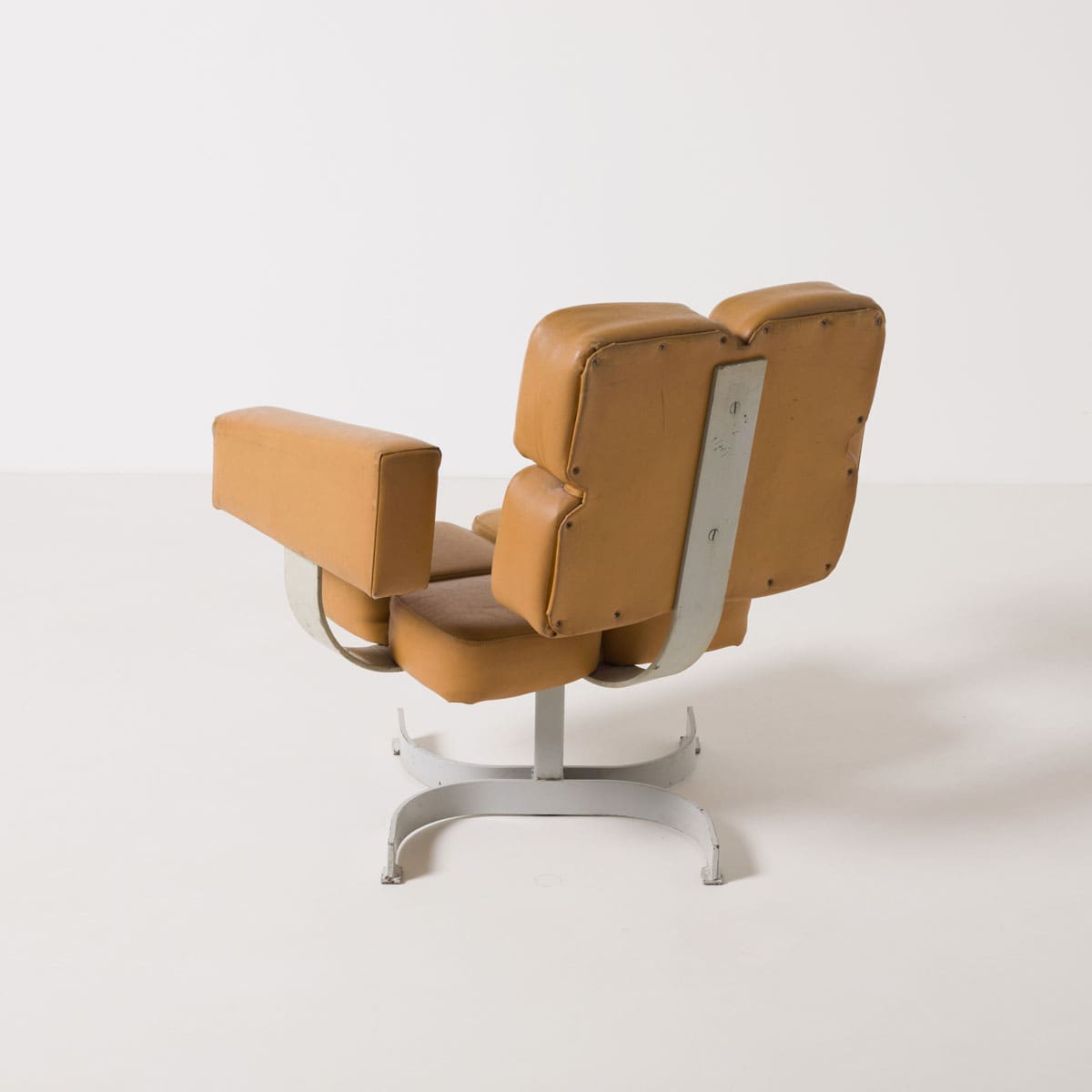 Bryła fotela oparta jest na masywnej stalowej podstawie obrotowej. Siedzisko i oparcie tworzy modułowy układ tapicerowanych segmentów, zapewniających czytelny podział ergonomiczny i wizualny. Podłokietniki mają formę prostych, zamkniętych bloków, konsekwentnych z brutalistycznym językiem lat 70. Całość zachowuje surowy, architektoniczny charakter typowy dla wyposażenia przestrzeni administracyjnych i reprezentacyjnych epoki.