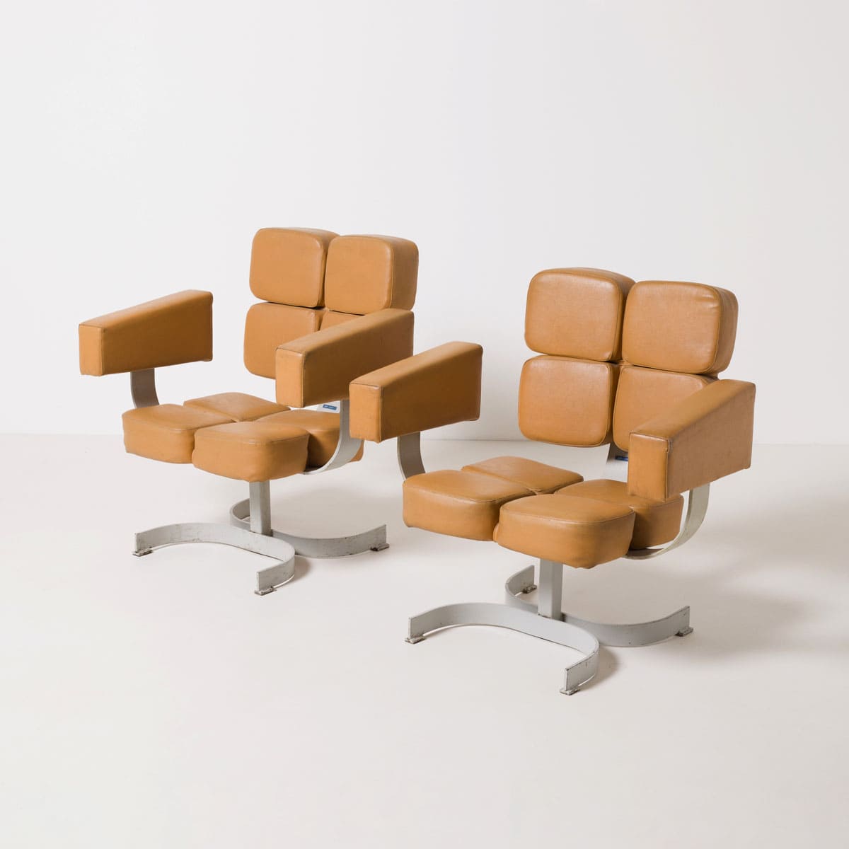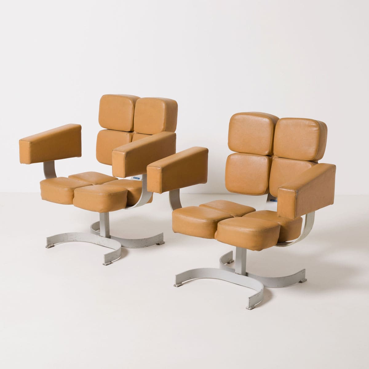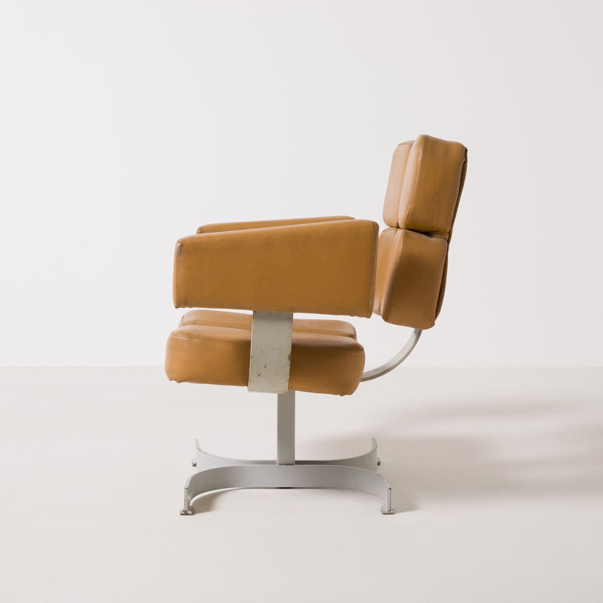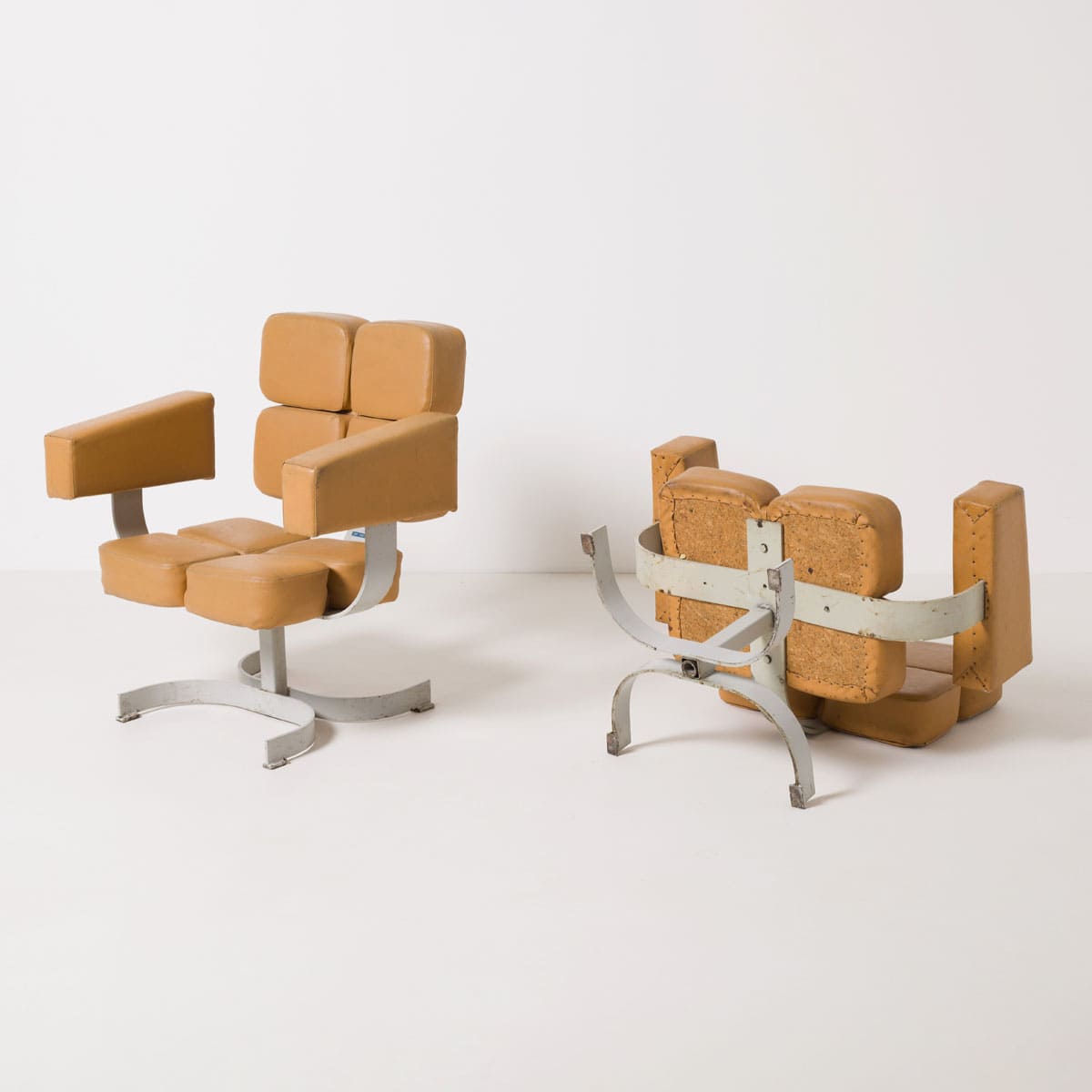 Bryła fotela oparta jest na masywnej stalowej podstawie obrotowej. Siedzisko i oparcie tworzy modułowy układ tapicerowanych segmentów, zapewniających czytelny podział ergonomiczny i wizualny. Podłokietniki mają formę prostych, zamkniętych bloków, konsekwentnych z brutalistycznym językiem lat 70. Całość zachowuje surowy, architektoniczny charakter typowy dla wyposażenia przestrzeni administracyjnych i reprezentacyjnych epoki.
