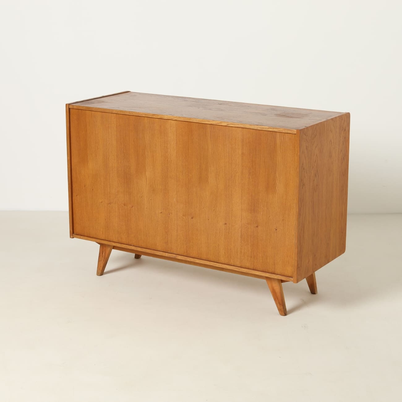 Forma pozostaje oszczędna i dobrze wyważona. Horyzontalna bryła oparta na lekko rozstawionych nogach daje poczucie stabilności. Podziały są klarowne, uchwyty zredukowane do prostych wycięć. To sposób projektowania obecny w Europie Środkowej lat 60., w którym forma pozostaje podporządkowana funkcji i skali wnętrza.