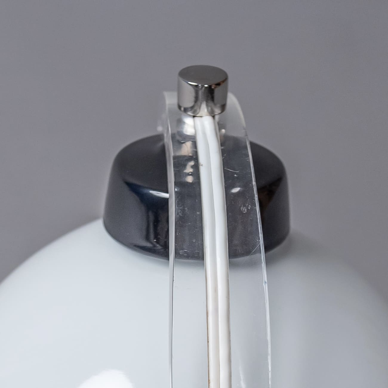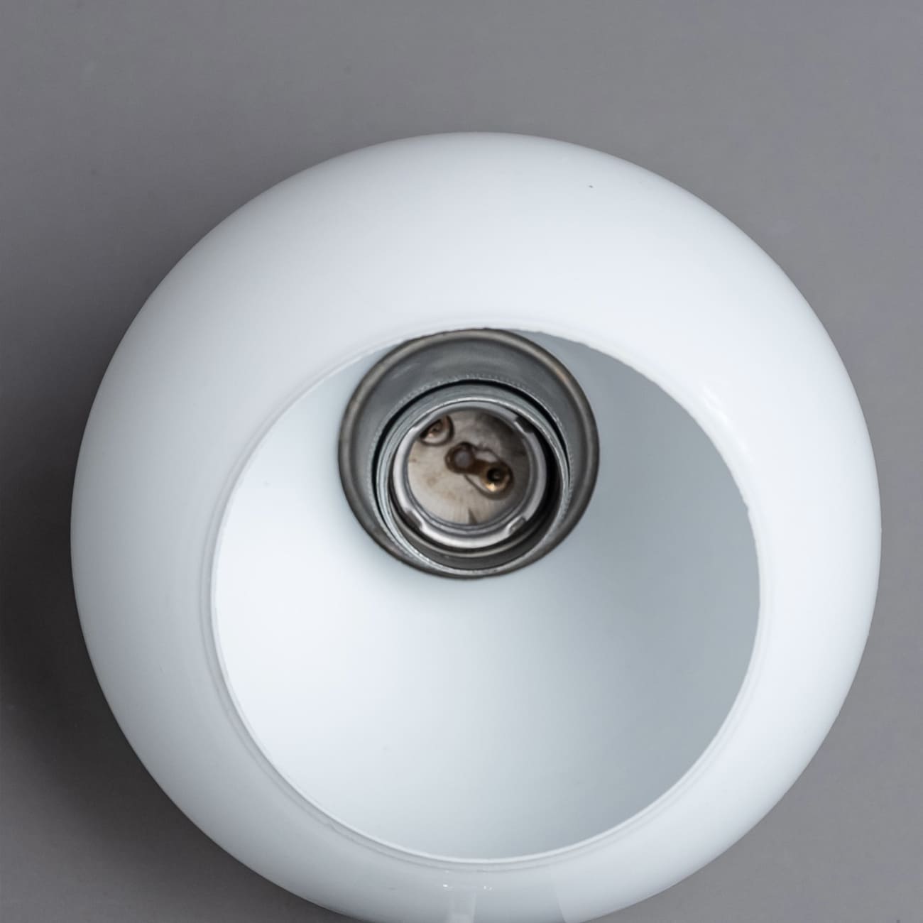 Klosz ze szkła hutniczego w odcieniu mlecznej bieli – charakterystyczny dla modeli katalogowanych w „1001 drobiazgów”, wydaniu 1971 – został poddany precyzyjnemu oczyszczeniu, ujawnia typową dla epoki jednolitą, satynową dyfuzję światła. Tak zachowane egzemplarze należą do nielicznych ocalałych świadectw polskiego wzornictwa powojennego, powstałego w zakładach, które nie istnieją już od dekad. Ich trwałość i klarowność formy czynią je dziś autonomicznymi obiektami kolekcjonerskimi, a ich odrestaurowanie zapewnia im dalszą, bezpieczną obecność w przestrzeniach współczesnych.