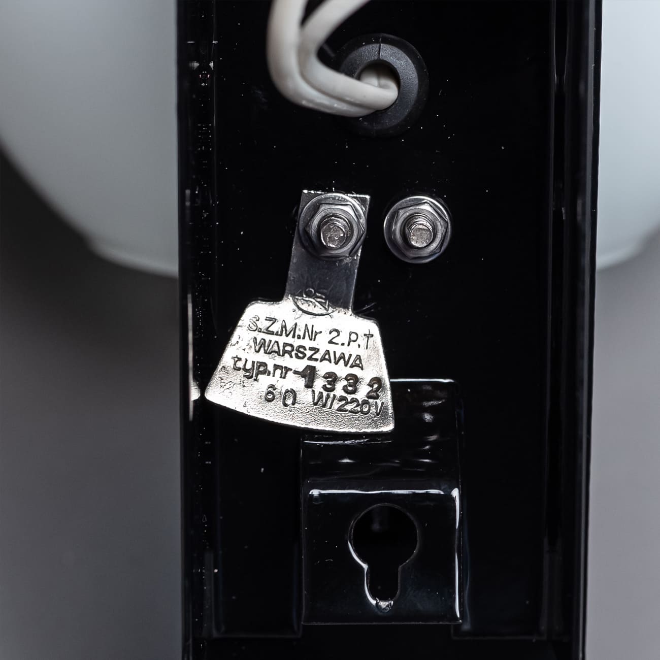 Powstały w Warszawie w latach 60.–70., ta lampa ścienna ścienny stanowi przykład polskiego modernizmu użytkowego, tj. nurtu, w którym krajowe zakłady oświetleniowe tworzyły własne, rozpoznawalne idiomy stylistyczne, rozwijane w pełni analogowych procesach manufakturowych. Stołeczne Zakłady Metalowe SZM nr 2, producent modelu 1332, należały do kluczowych ośrodków rodzimego wzornictwa powojennego, a ich projekty współtworzyły język wizualny polskich wnętrz drugiej połowy XX wieku. Forma oparta na cylindrycznym, mlecznym kloszu i charakterystycznym metalowym module nośnym jest świadectwem estetyki epoki, w której funkcjonalna oszczędność łączyła się z dyscypliną konstrukcyjną.