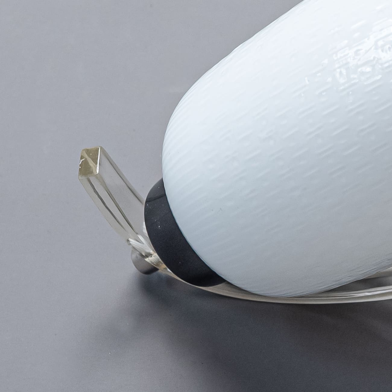 Model 1332 wyróżniał się ascetyczną geometrią. Szklany, warstwowy klosz o charakterystycznej tłoczonej fakturze był wytwarzany w procesach hutniczych, wymagających precyzji i doświadczenia rzemieślnika. Jego forma była elementem optycznym, równomiernie rozpraszała światło, nadając wnętrzu miękkość i spokojny rytm. To język projektowy charakterystyczny dla modernizmu Europy Środkowej: surowy, konsekwentny, oparty na idei światła jako podstawowego budulca przestrzeni.