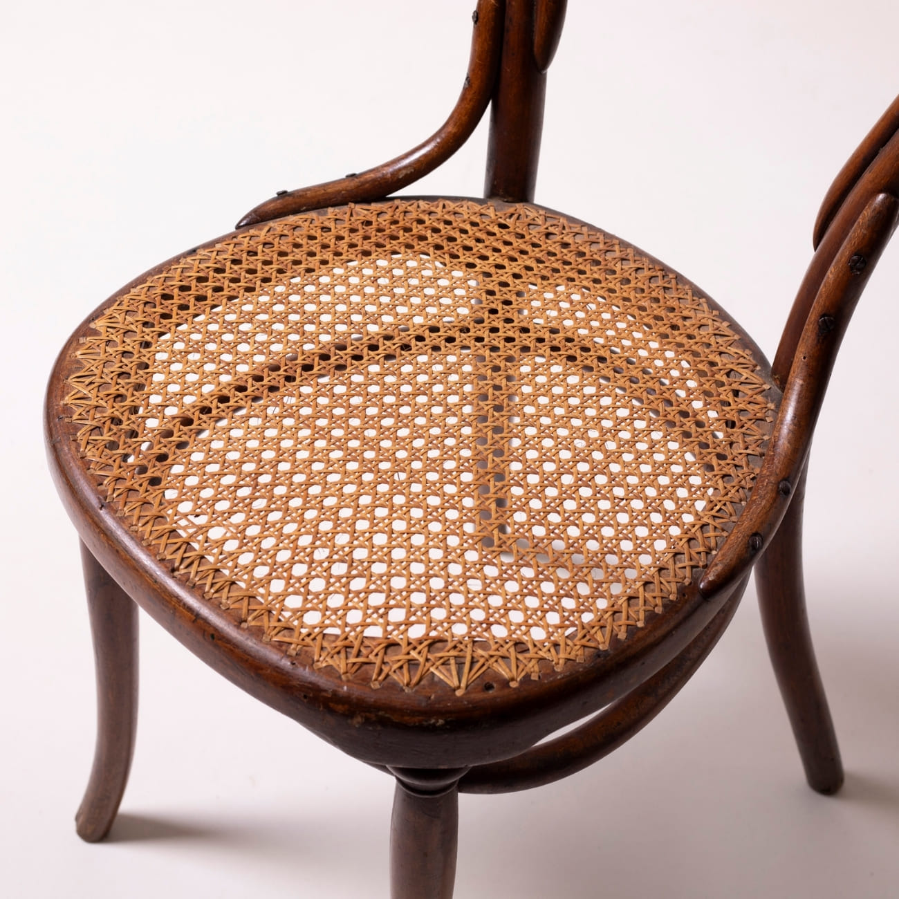 Prezentowany egzemplarz pochodzi z Austrii, z około 1900 roku. Wykonany z giętego drewna bukowego, z siedziskiem z naturalnej trzciny. Mebel zachowany w oryginalnym stanie, nieodrestaurowany, z piękną, autentyczną patyną – świadectwem ponadstuletniej historii. Trzcinowe siedzisko mogło zostać wymienione wiele lat temu. Na spodzie widoczne wypalone logo THONET, potwierdzające pochodzenie i autentyczność.