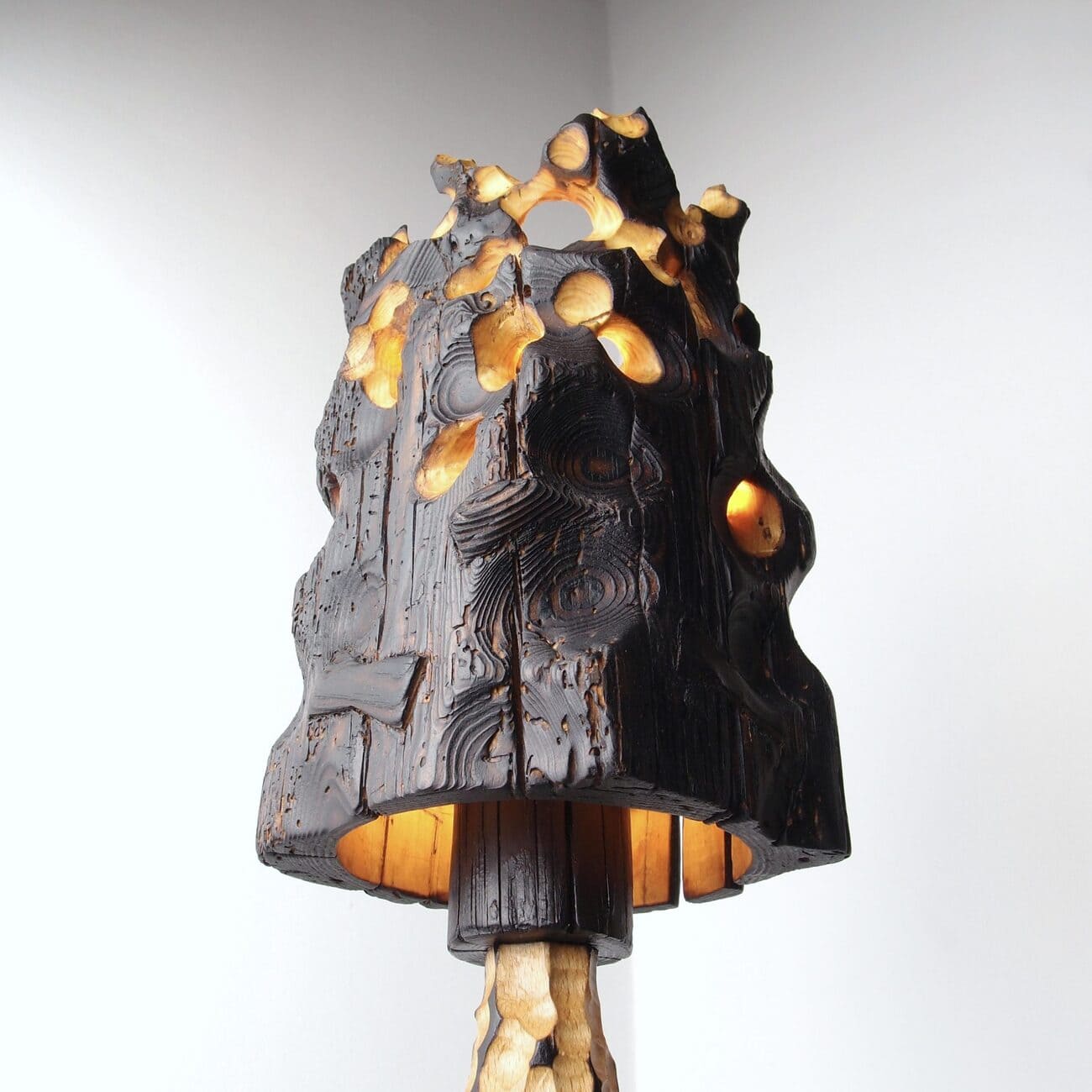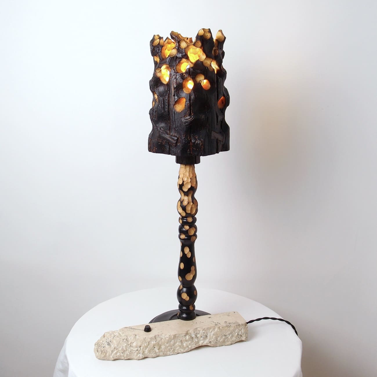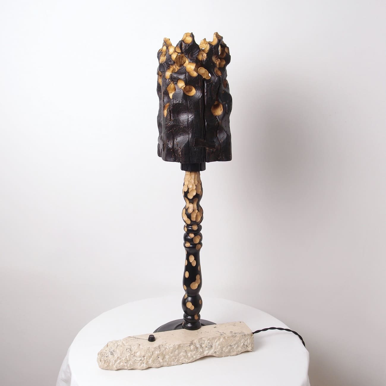 Lampa stołowa Torch Lighting z kolekcji Erosion, drewno i wapień, proj. Gábor Góbi, Węgry, 2024.