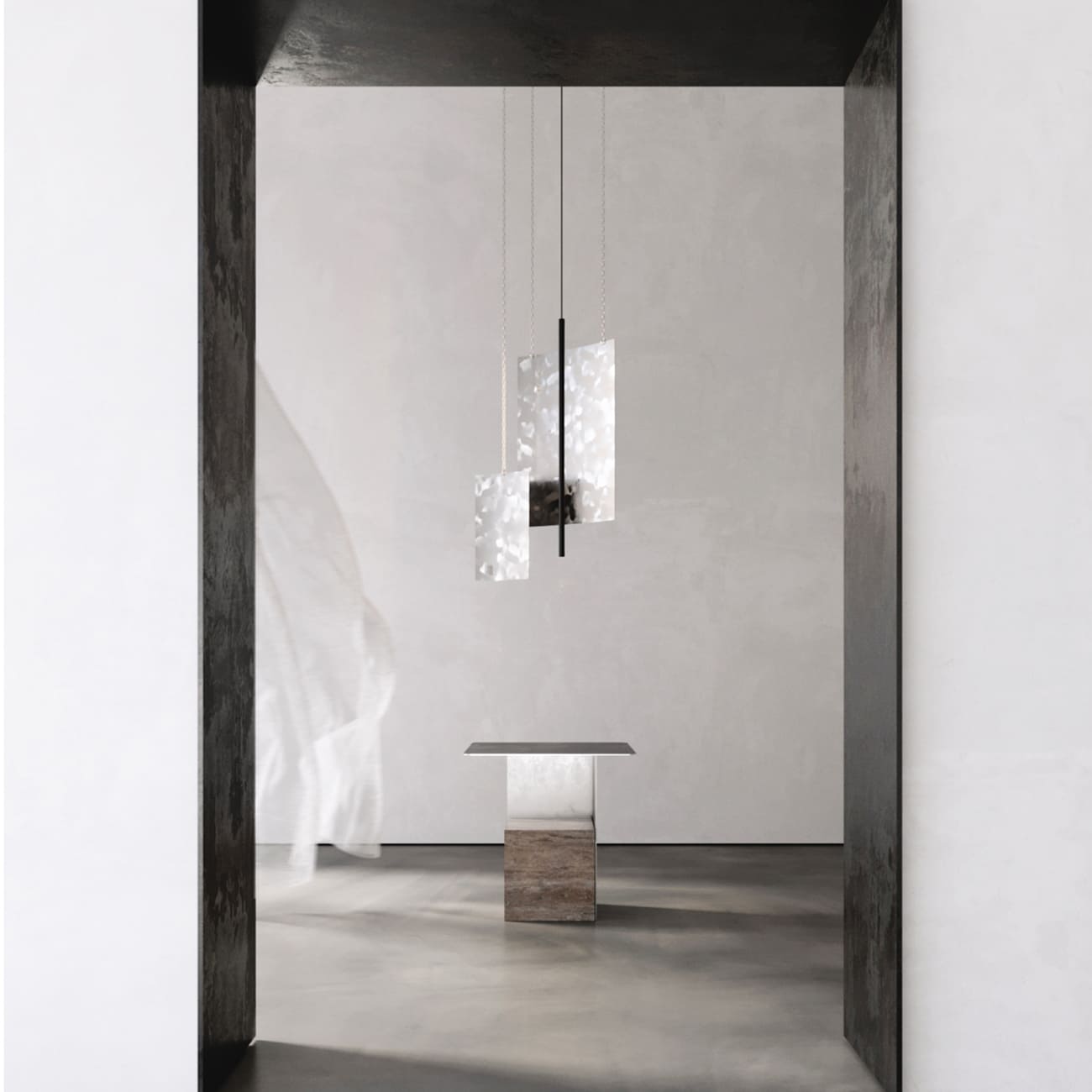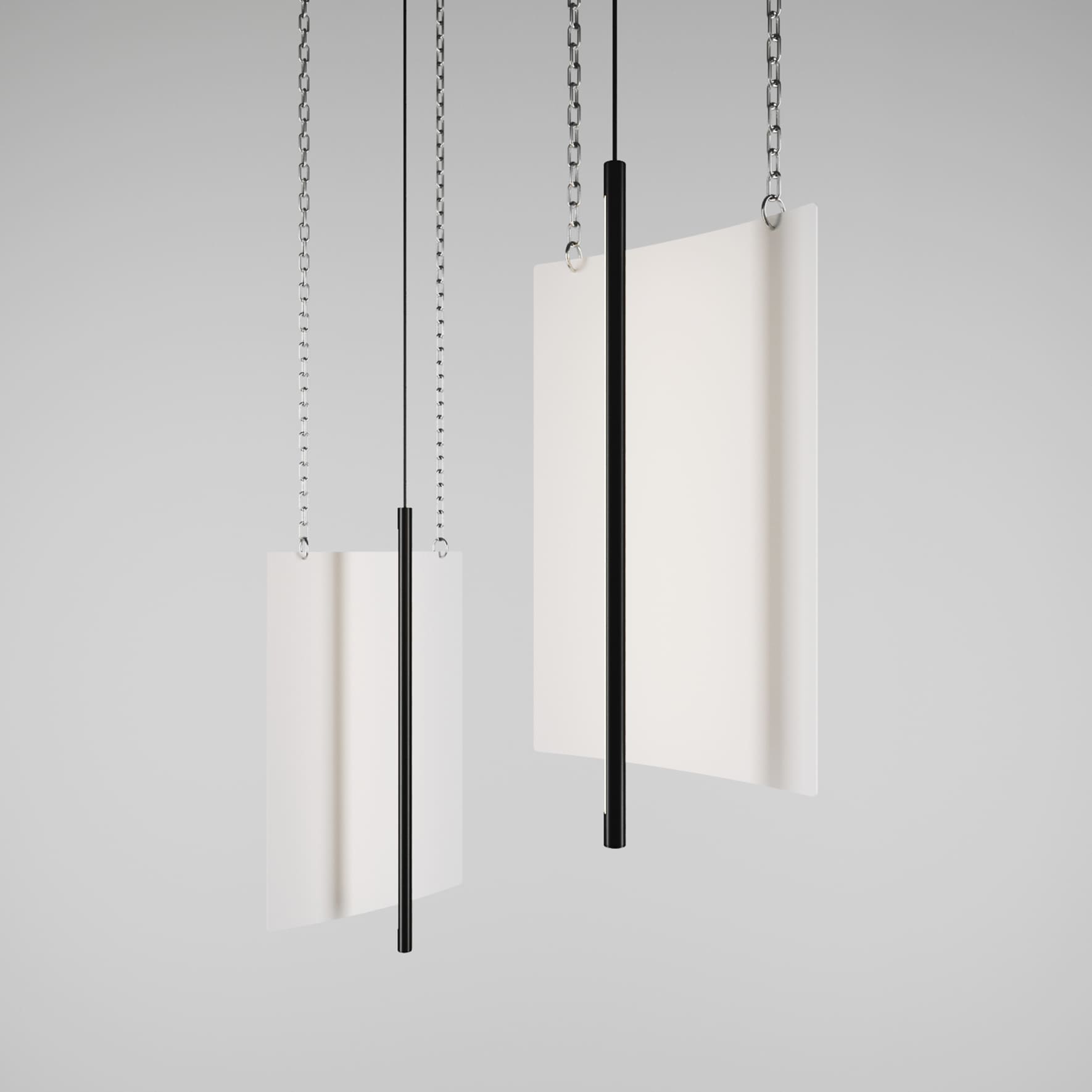 Lampa wisząca Svitlotin M rozwija myślenie o świetle jako o materiale, który buduje strukturę wizualną przestrzeni. Projekt Artema Zakharchenki opiera się na radykalnym uproszczeniu formy: pojedyncza, zawieszona tafla stali tworzy rodzaj pionowej „przegrody świetlnej”, a linearne źródło światła pracuje wzdłuż jej krawędzi. W efekcie obiekt działa niezupełnie jak klasyczna lampa, ale jako jeden z najistotniejszych elementów projektu wnętrza.