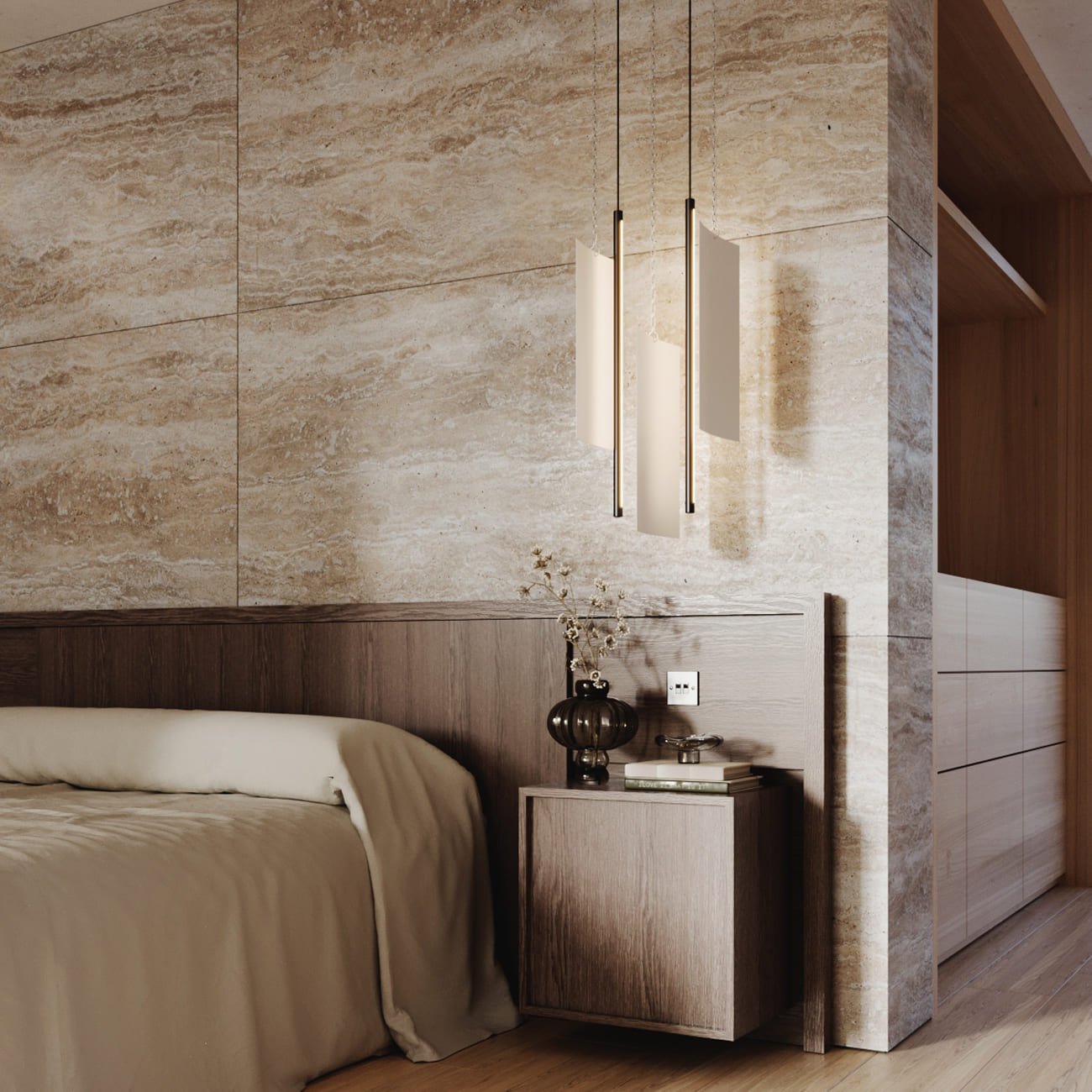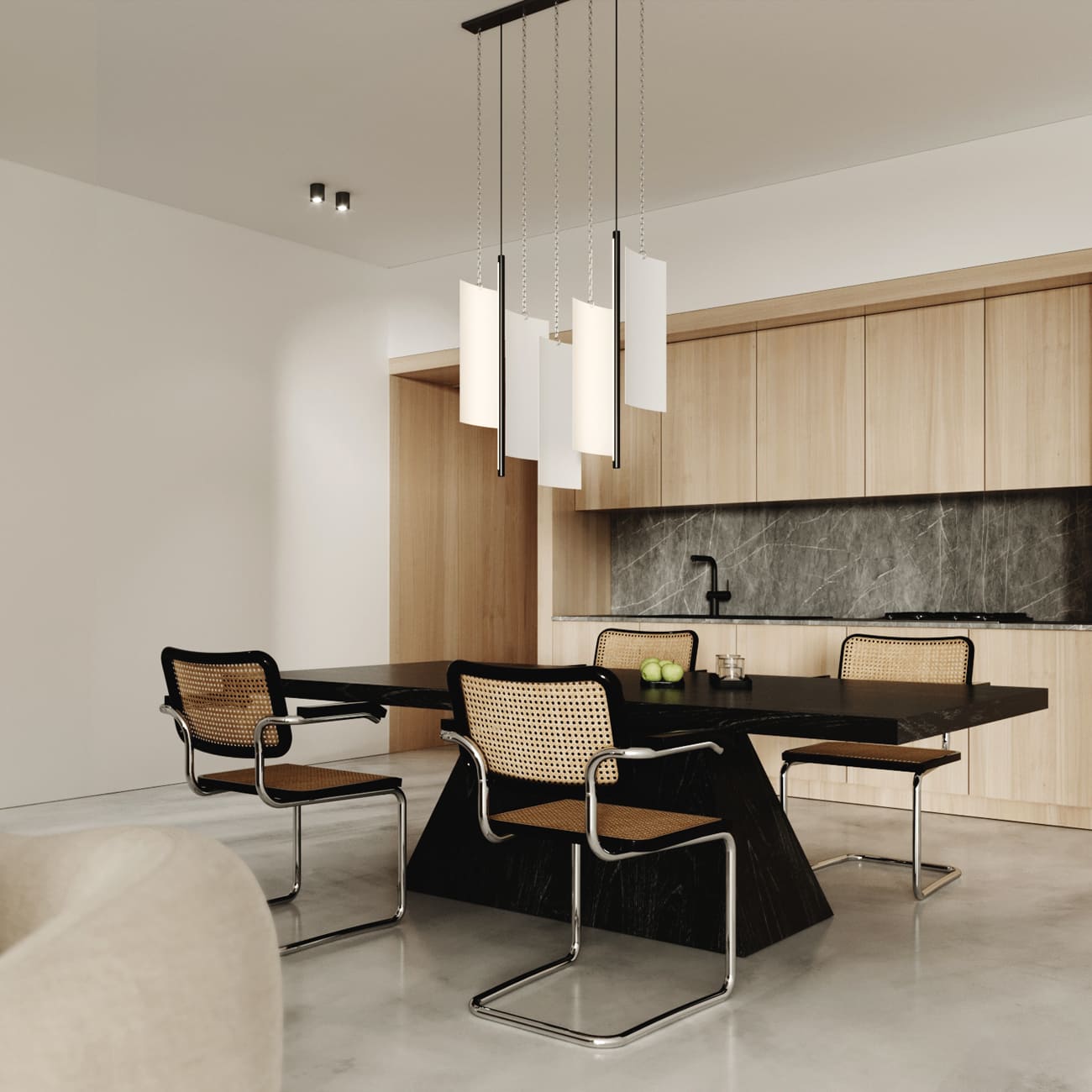 W formacie M Svitlotin działa w skali całego pomieszczenia, wyznaczając pionową oś kompozycji: nad stołem, wyspą, strefą wejściową lub w przestrzeniach o większej wysokości. Lampa czytelnie porządkuje układ wnętrza i buduje hierarchię oświetlenia bez nadmiaru formy. Jej obecność jest wyraźna, ale nie dominuje: punkt ciężkości przesuwa się z kształtu na interakcję między światłem a metalem.
