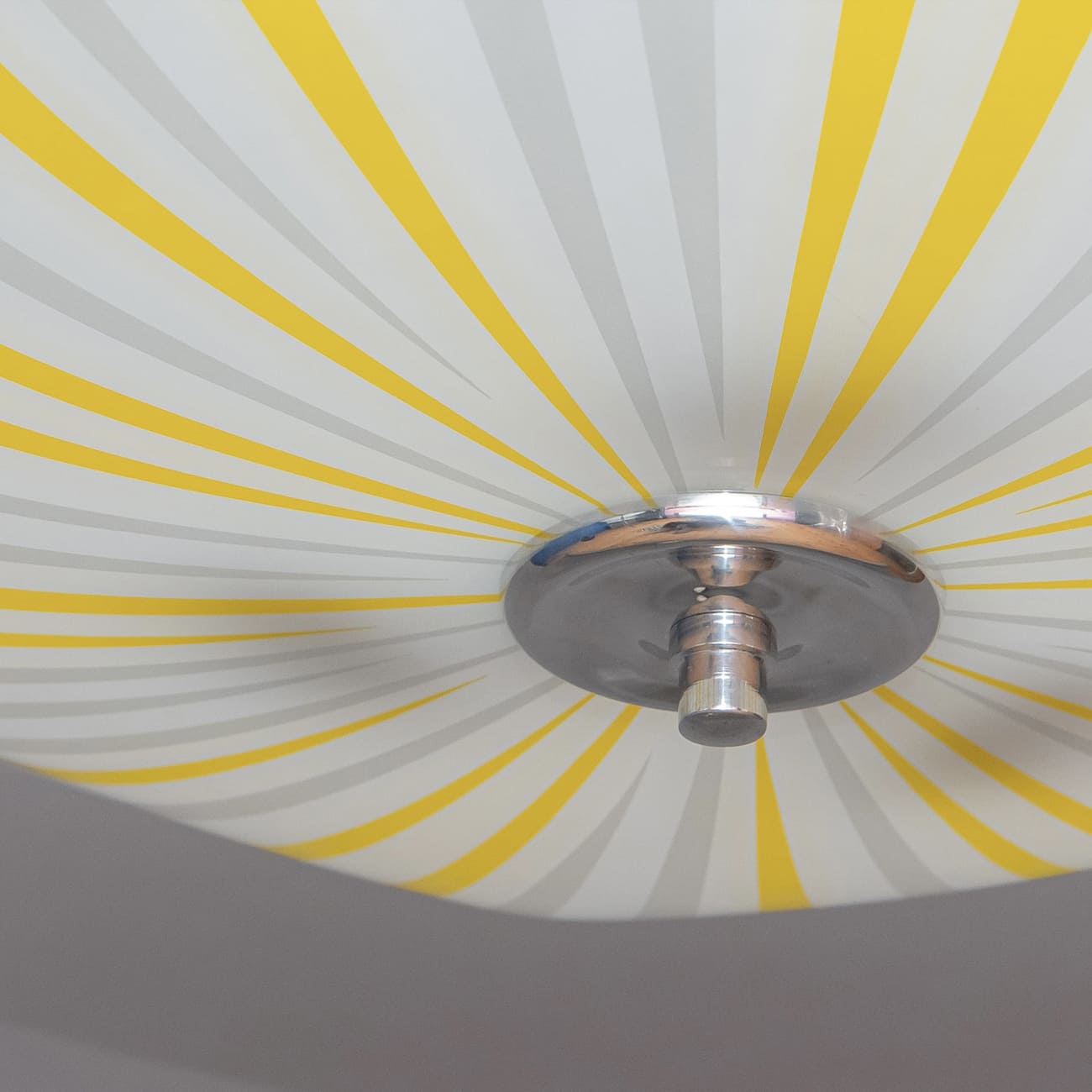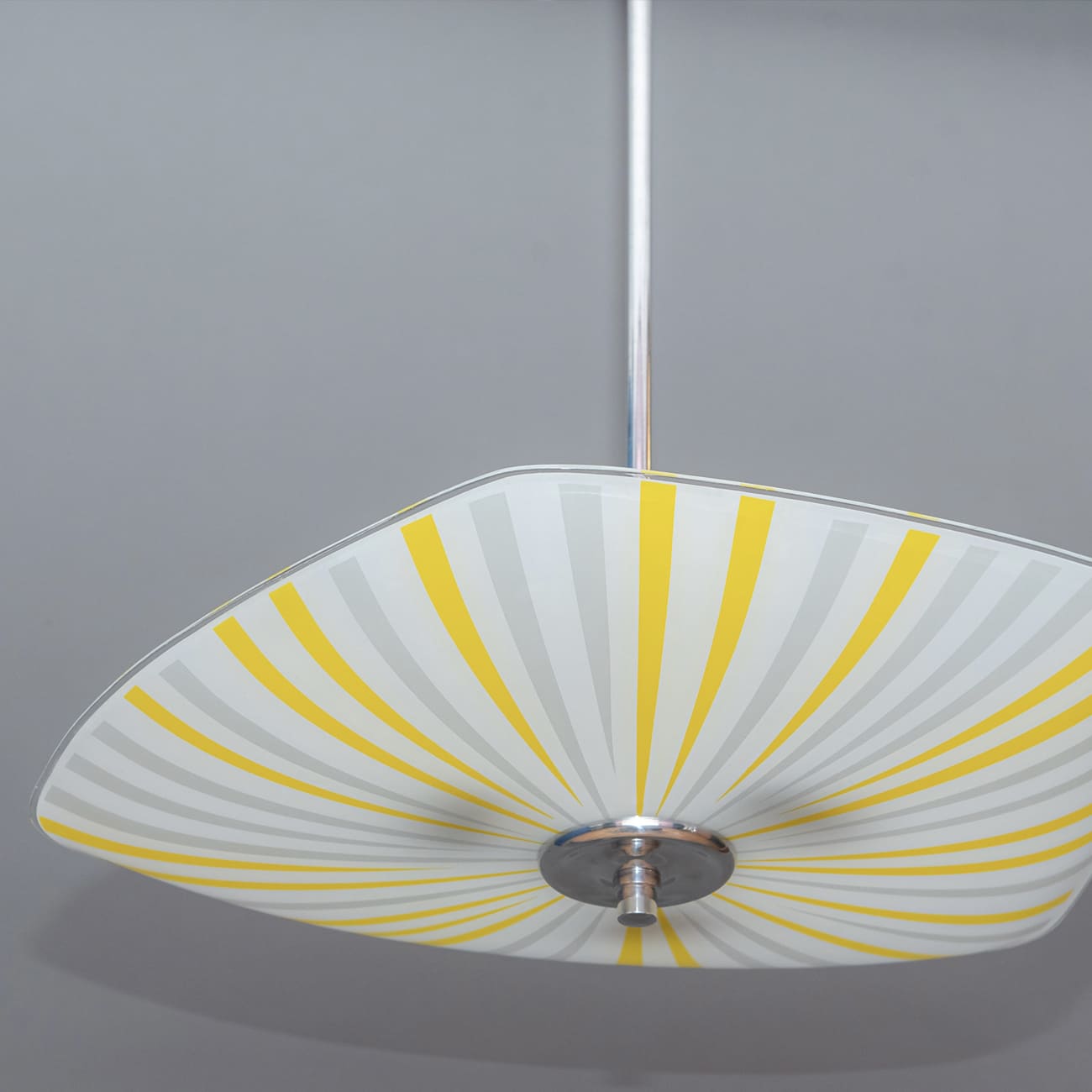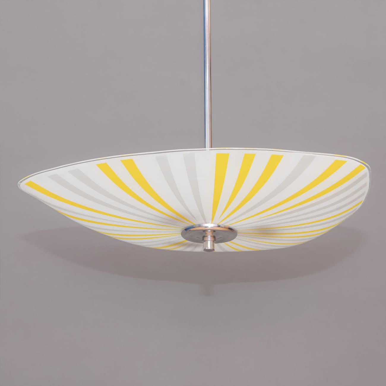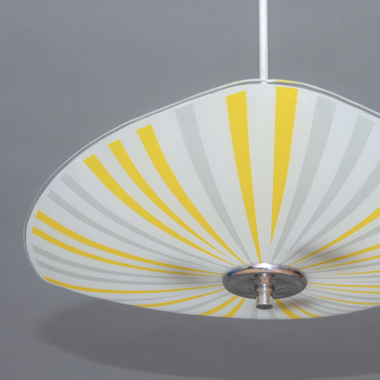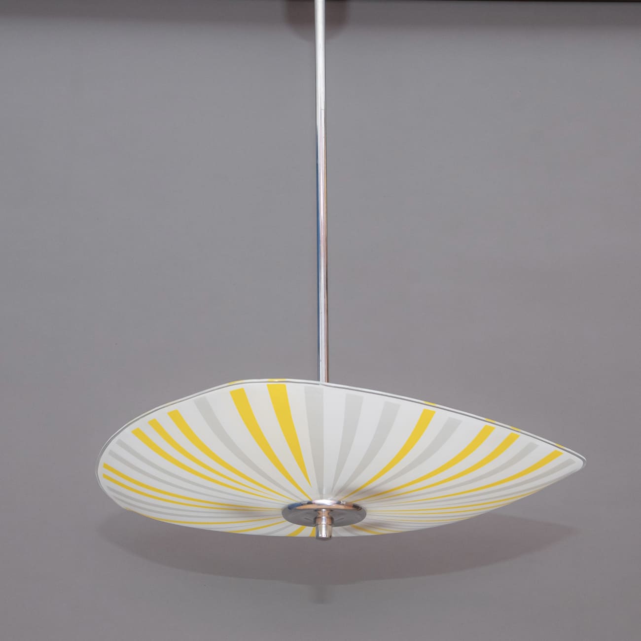 Wyprodukowana w Czechosłowacji w latach 60., lampa wisząca typ 1103 ukazuje jedną z najbardziej rozpoznawalnych strategii formalnych modernizmu użytkowego regionu: syntezę geometrii i światła, w której dekor staje się narzędziem kształtowania percepcji przestrzeni. Promienisty układ pasów, naniesiony ręcznie na szkło opalowe, operuje rytmem i kierunkowością, tworząc iluzję wirującego, „rozchodzącego się” światła — efekt szczególnie poszukiwany przez projektantów epoki, dążących do nadania płaskiej powierzchni dynamiki właściwej obiektom kinetycznym.