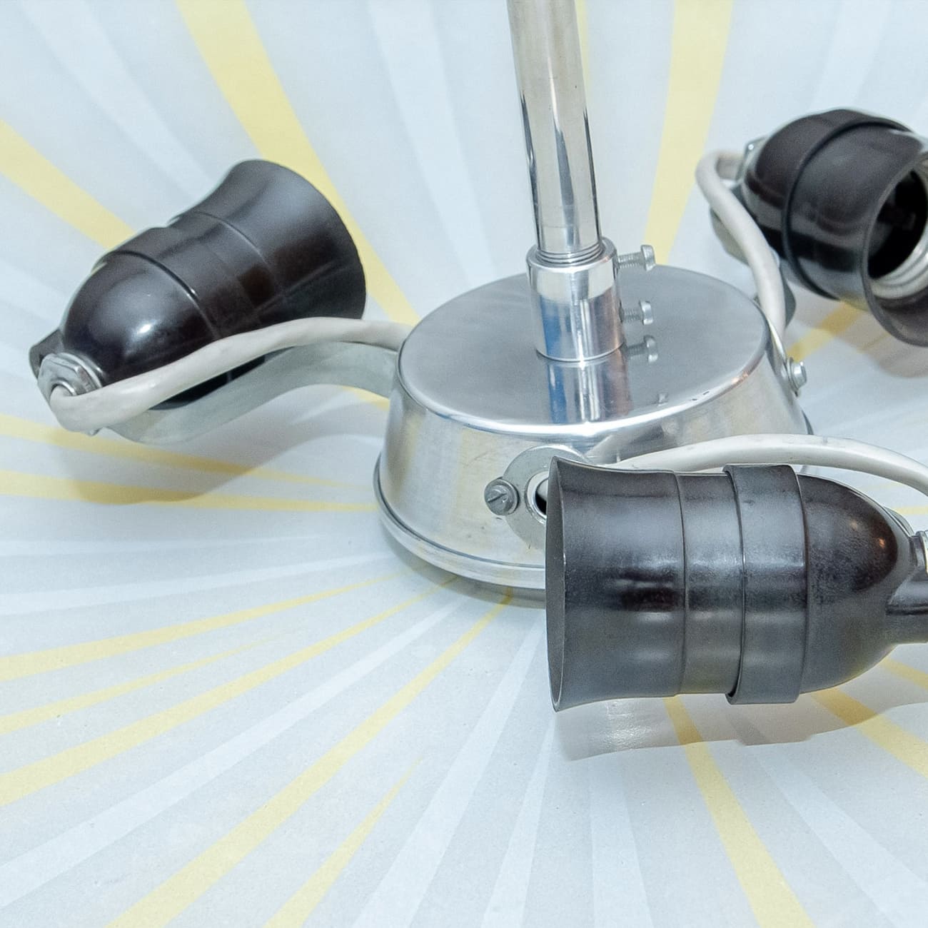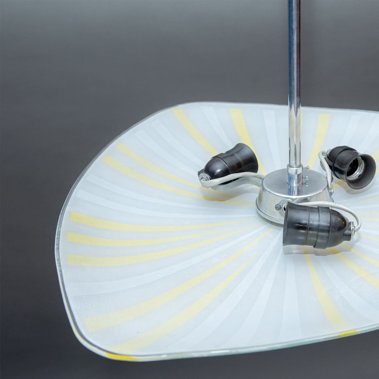 Napako, spółdzielnia oświetleniowa działająca od 1919 roku, była jednym z nielicznych zakładów Europy Środkowej zdolnych do konsekwentnego łączenia przemysłowej powtarzalności z rękodzielniczą precyzją. Wzory promieniste, takie jak w prezentowanym egzemplarzu, powstawały w procesach całkowicie analogowych, często z udziałem kilku rzemieślników. Każdy z nich odpowiadał za etap, który dziś nie istnieje już w realiach produkcji seryjnej. Subtelne różnice w szerokości i nasyceniu pasów czynią każdy klosz obiektem jednostkowym, a nie wyrobem fabrycznym sensu stricto.