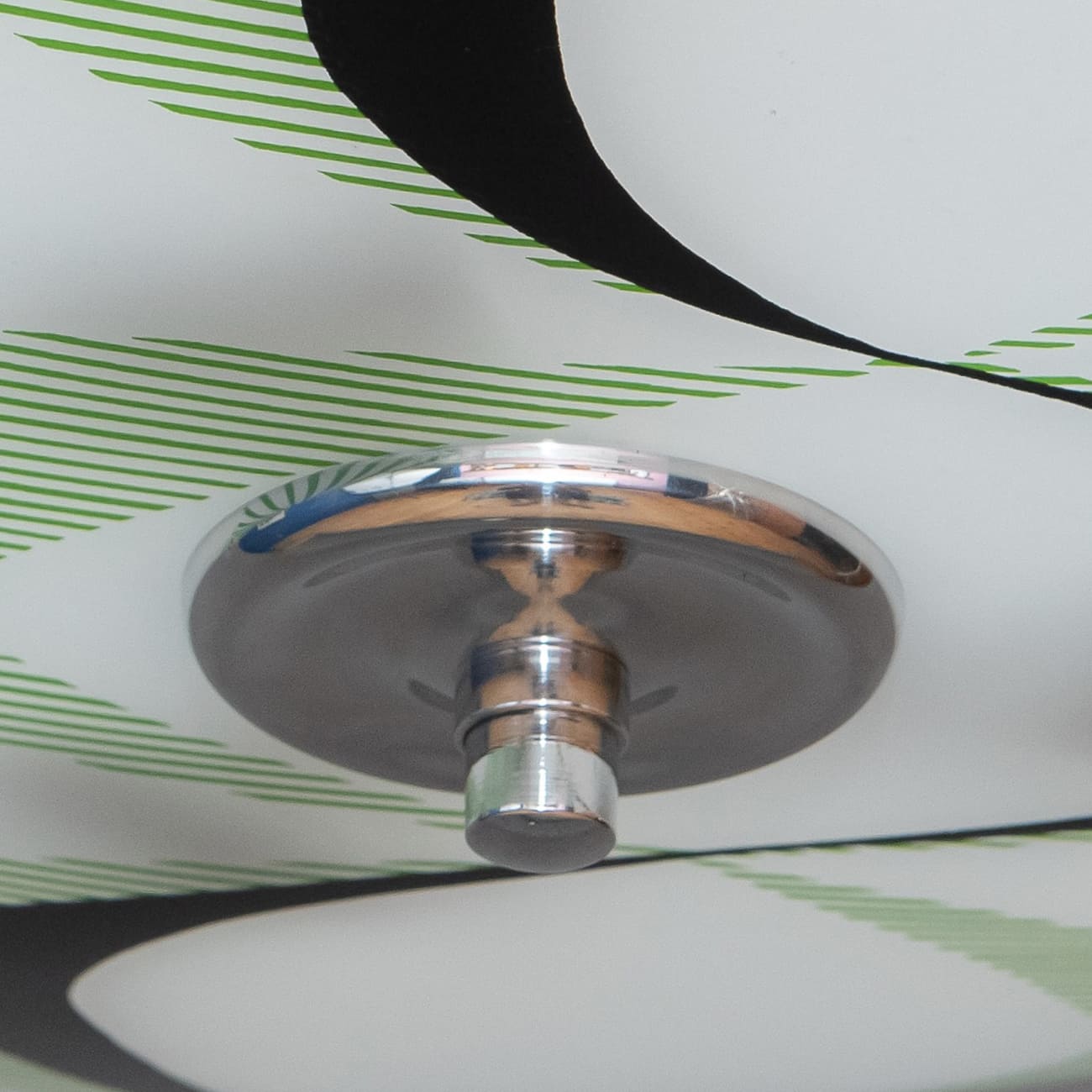 Szklany klosz w formie płaskiej misy został udekorowany graficznym ornamentem nanoszonym metodami całkowicie analogowymi. Zielone i czarne segmenty, zbudowane z gęstych linii o zmiennej gęstości, tworzą efekt optycznej wibracji charakterystyczny dla estetyki tamtego okresu. Każdy egzemplarz różnił się subtelnie sposobem nałożenia pigmentu, co dziś stanowi jedną z głównych wartości kolekcjonerskich lamp typ 1103.