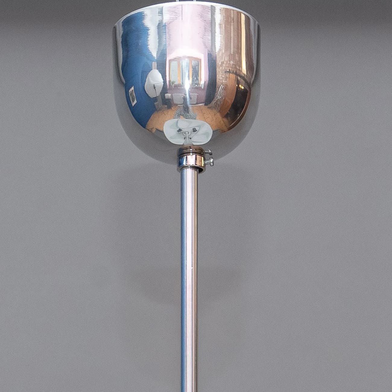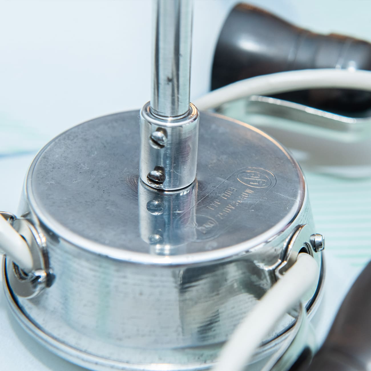Prezentowany model został poddany renowacji wykonanej w standardzie muzealnym. Elementy aluminiowe oczyszczono i wypolerowano, zachowując pierwotne założenia materiałowe oraz charakter powierzchni. Instalację elektryczną odtworzono z poszanowaniem oryginalnego układu, dzięki czemu lampa pracuje w trybie jedno- lub trójpunktowym. Wszystkie komponenty, włącznie z oprawami E27, pozostają autentyczne i zgodne z pierwotną specyfikacją Napako. Zachowana sygnatura producenta potwierdza historyczną proweniencję egzemplarza.