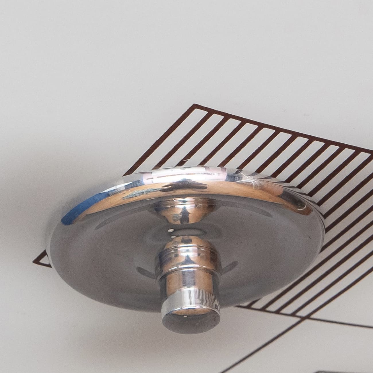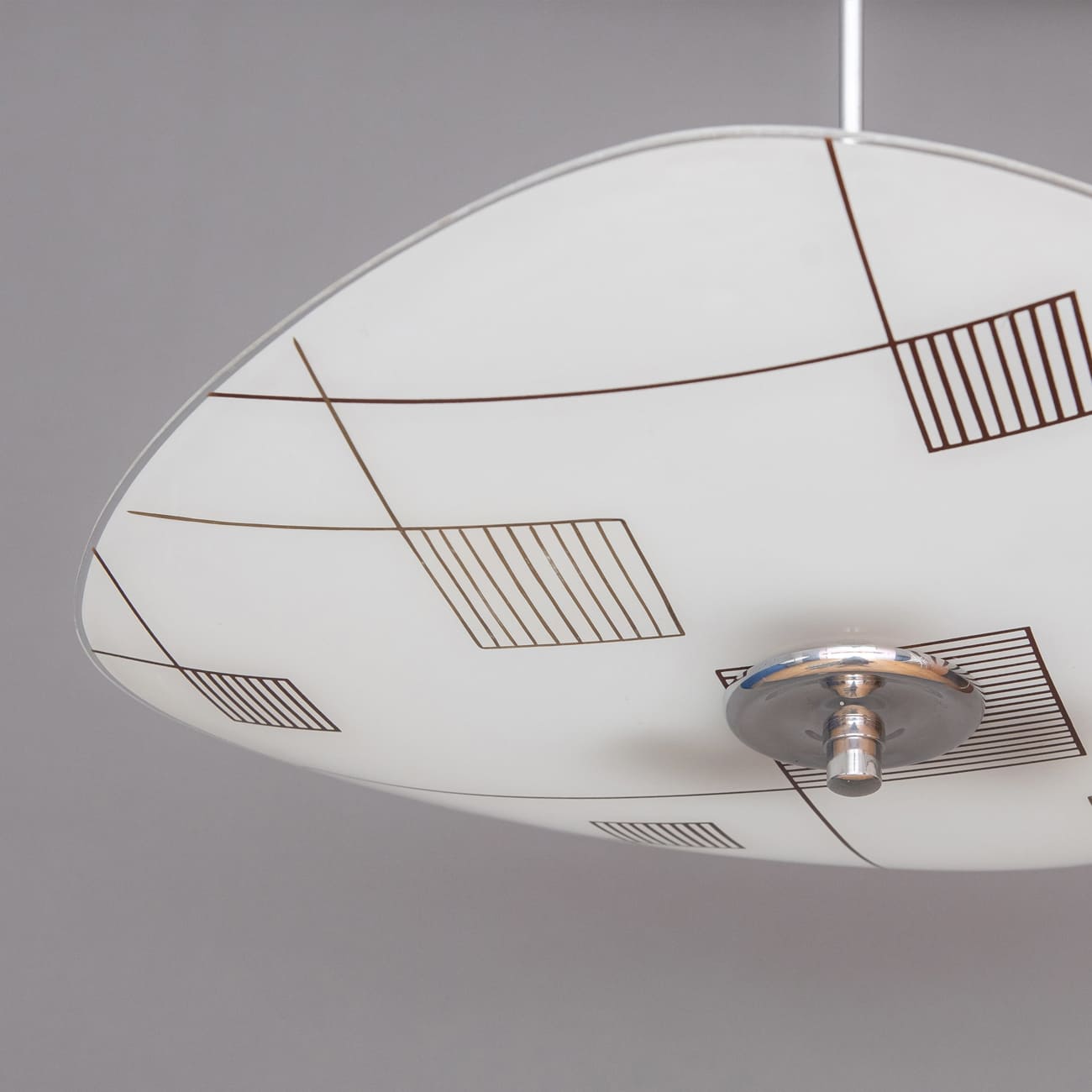 Powstała w Czechosłowacji w połowie lat 60., lampa typ 1103 reprezentuje jedno z najbardziej charakterystycznych dokonań środkowoeuropejskiego modernizmu użytkowego: próbę stworzenia nowego alfabetu wizualnego opartego na prostocie i dyscyplinie graficznej. Wzór naniesiony na szkło jest konstrukcyjną ideą, która wyróżniała projekty powstające w warsztatach Napako, jednej z najważniejszych manufaktur oświetlenia XX wieku.