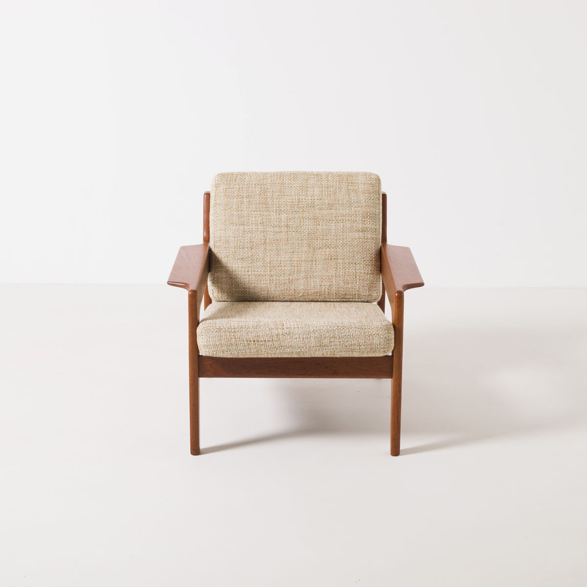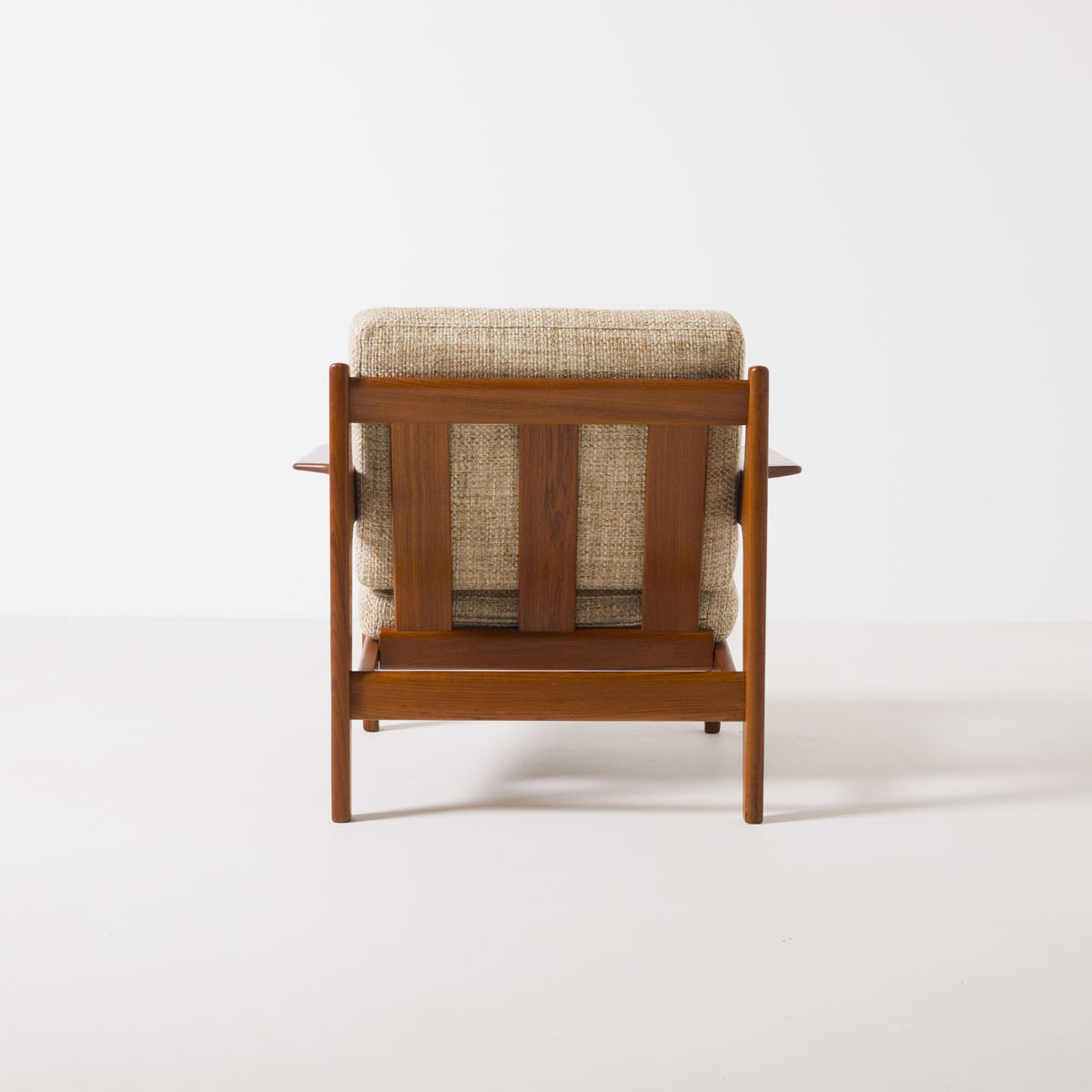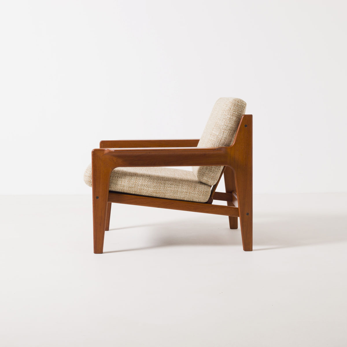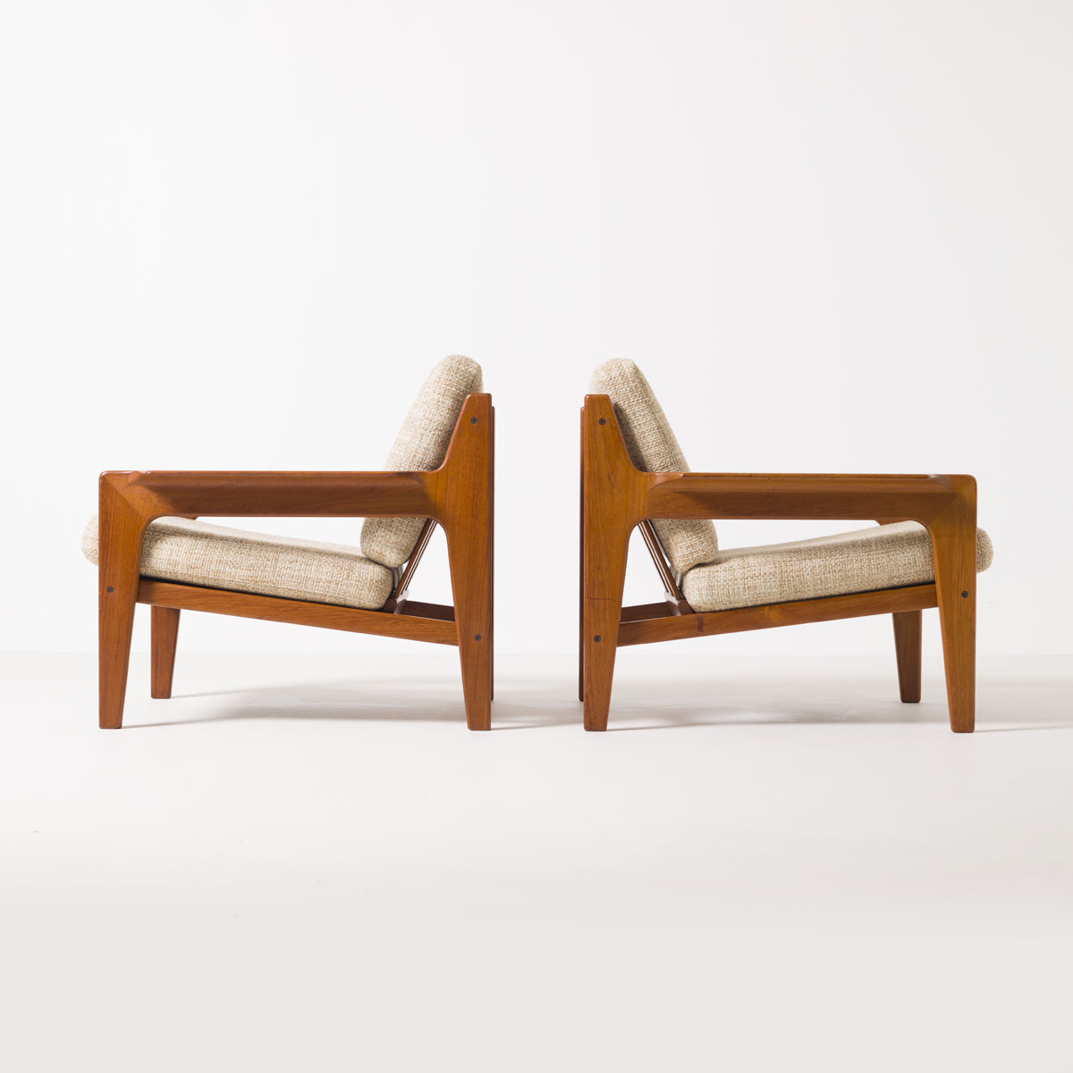 Konstrukcja oparta jest na litej ramie z drewna tekowego, materiału charakterystycznego dla skandynawskiego designu tamtej dekady, cenionego za stabilność wymiarową, odporność oraz głęboką, naturalną barwę. Geometria foteli jest wyważona i podporządkowana ergonomii. Szerokie podłokietniki oraz lekko cofnięte oparcie wskazują na projekt świadomie pomyślany jako mebel wypoczynkowy.