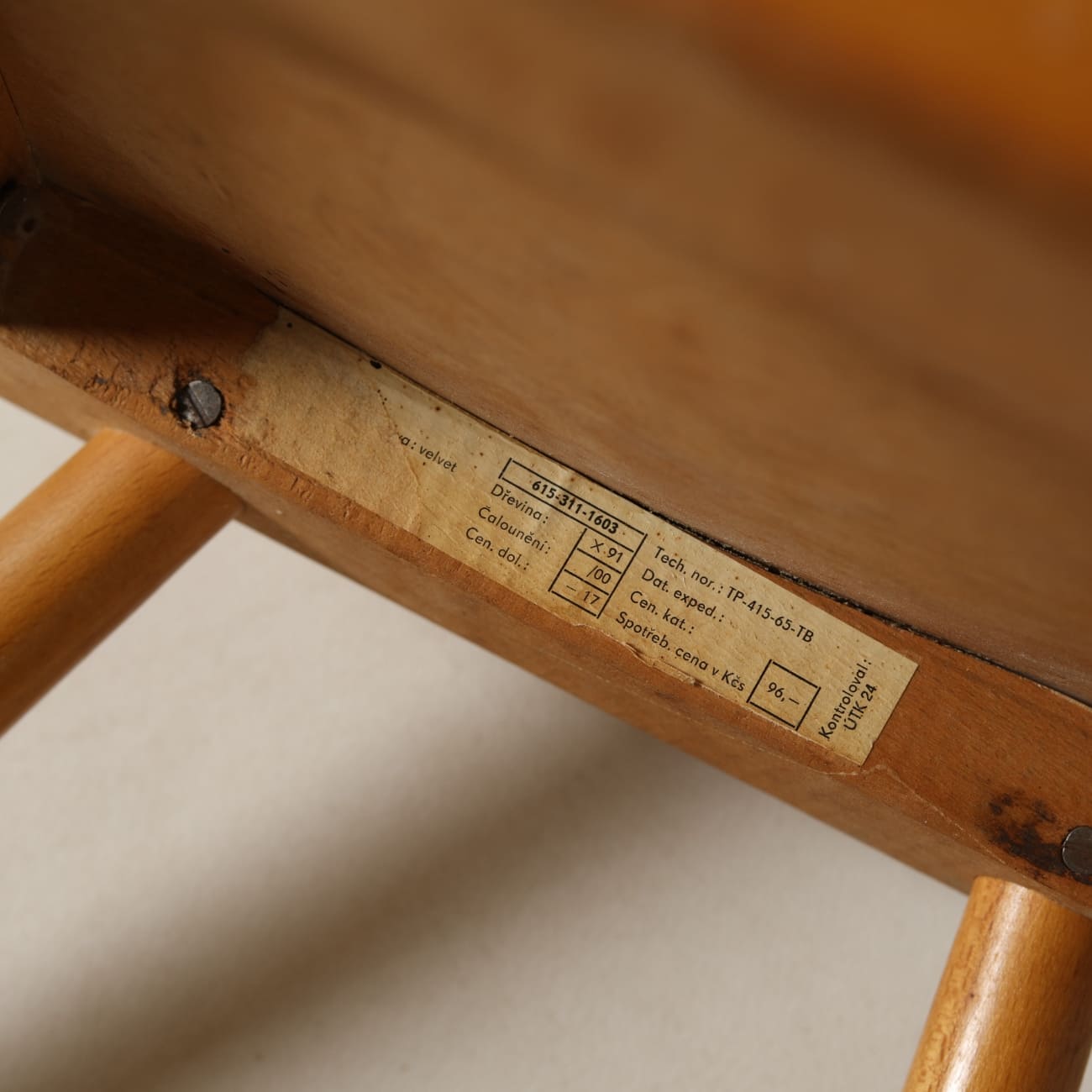 Zastosowanie drewna bukowego oraz formowanej sklejki wynika z logiki produkcji seryjnej. Buk odpowiada za stabilność konstrukcji, sklejka pozwala na uzyskanie cienkich, profilowanych płaszczyzn. W tej wersji powierzchnia siedziska została pokryta farbą, co wprowadza dodatkową warstwę wizualną i podkreśla użytkowy charakter obiektu.