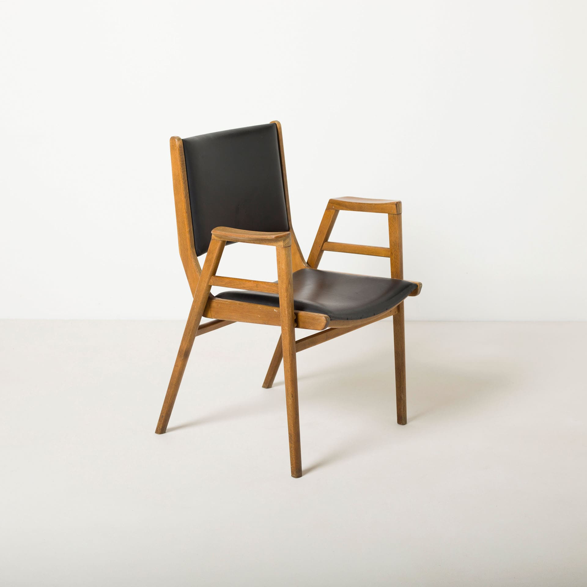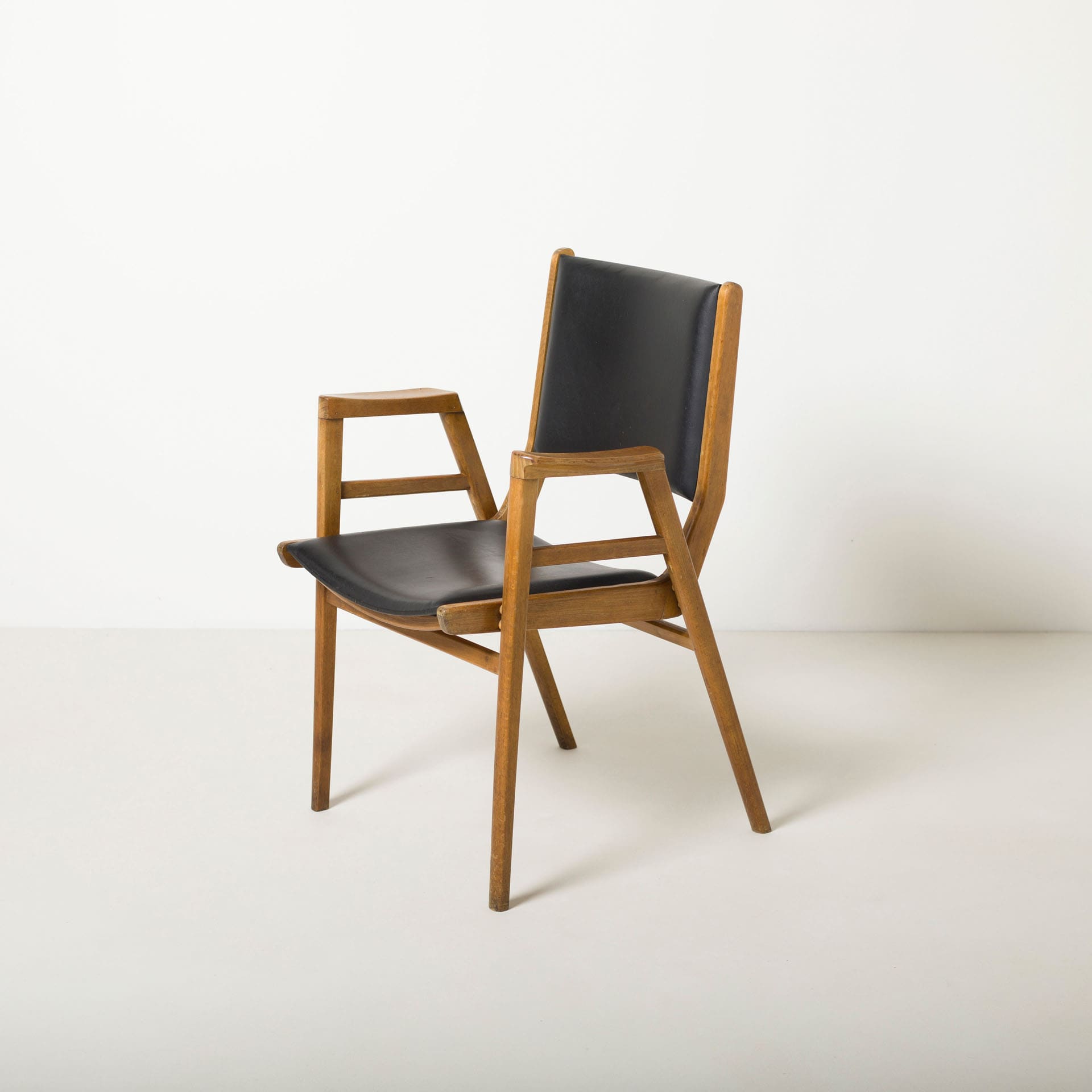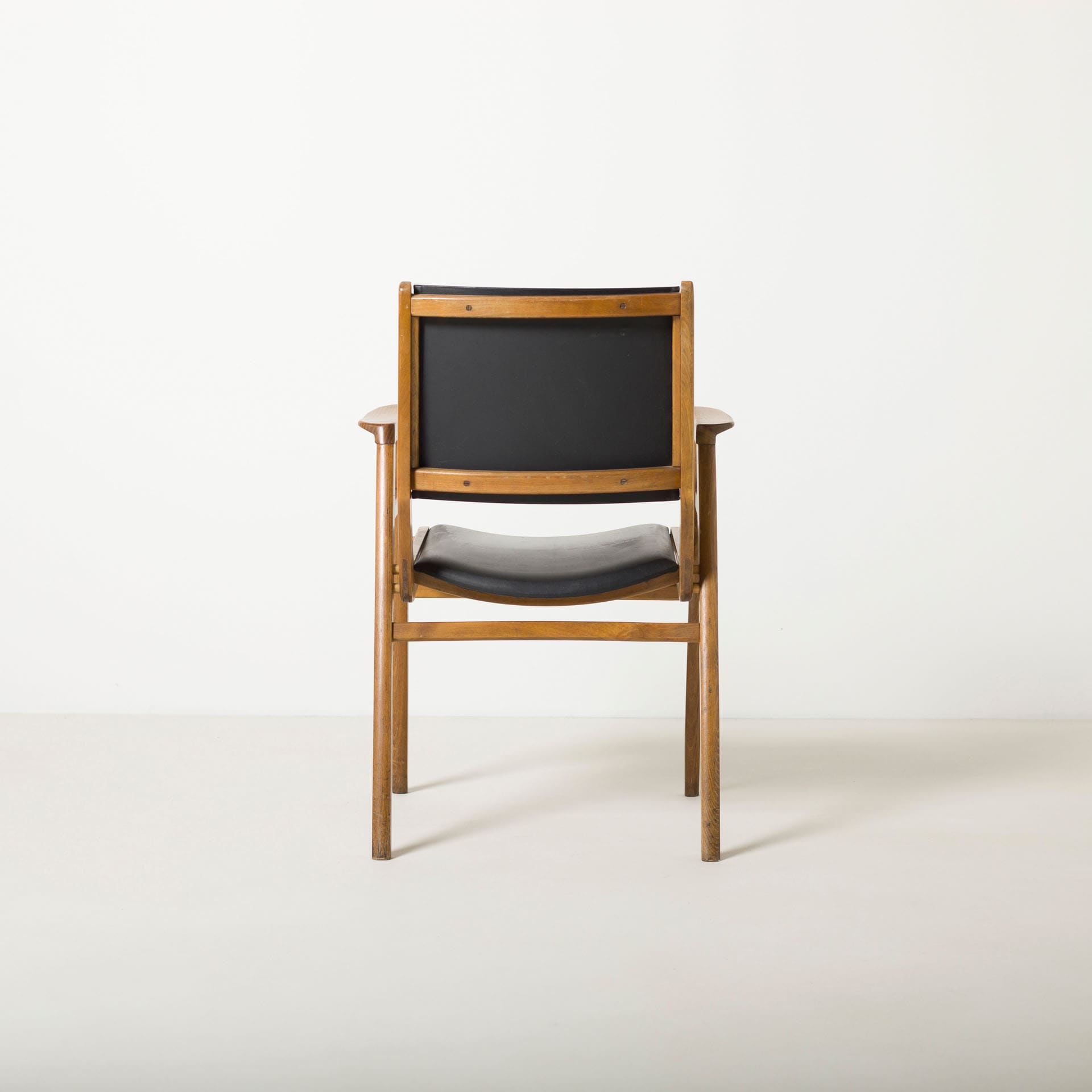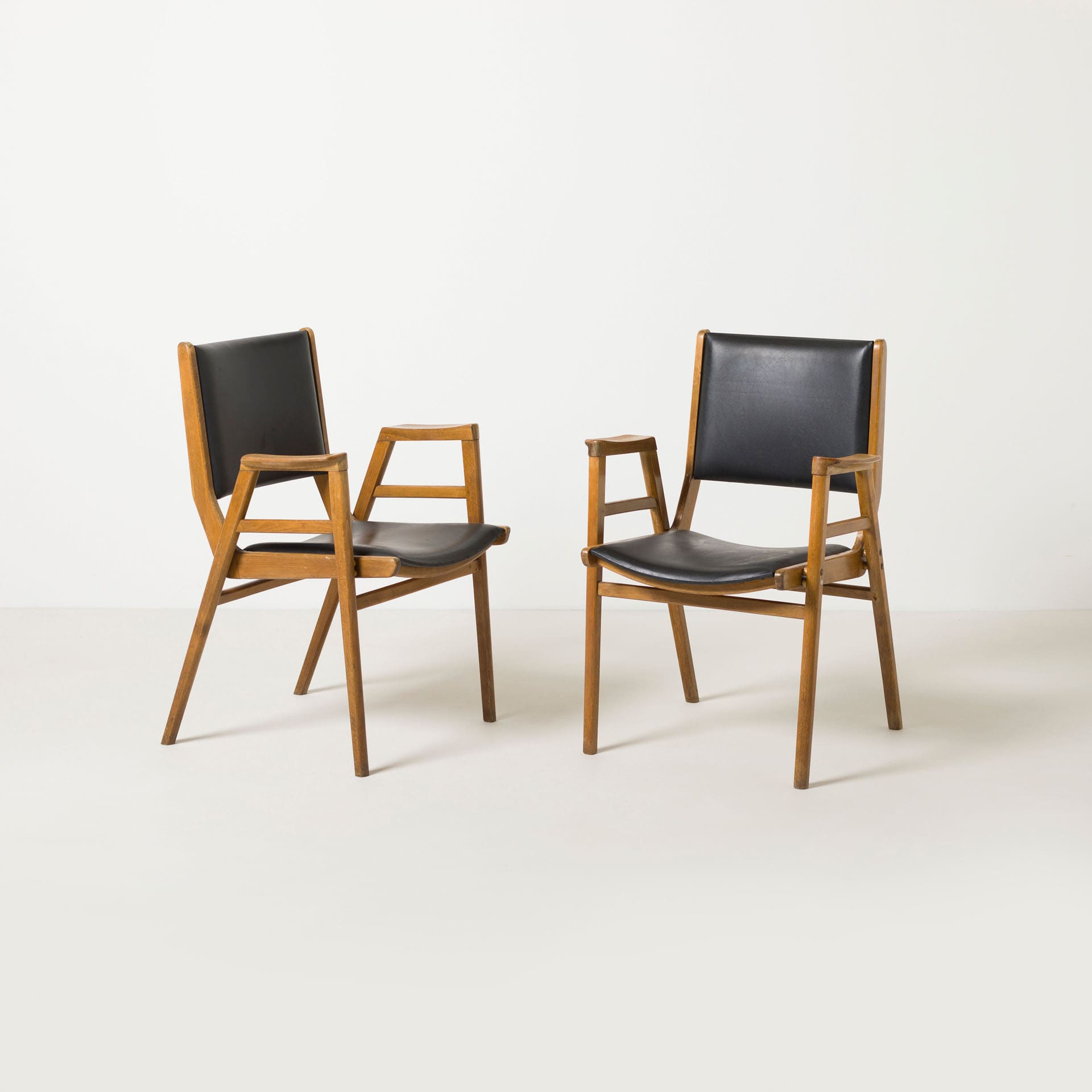 Prezentowana para krzeseł wykonana została z drewna bukowego. Konstrukcja jest klarowna i proporcjonalna, z charakterystycznym układem podłokietników i oparcia, który nadaje bryle architektoniczną dyscyplinę. Delikatnie rozchylone nogi oraz subtelnie profilowane elementy konstrukcyjne tworzą dynamiczną, a jednocześnie bardzo stabilną formę.