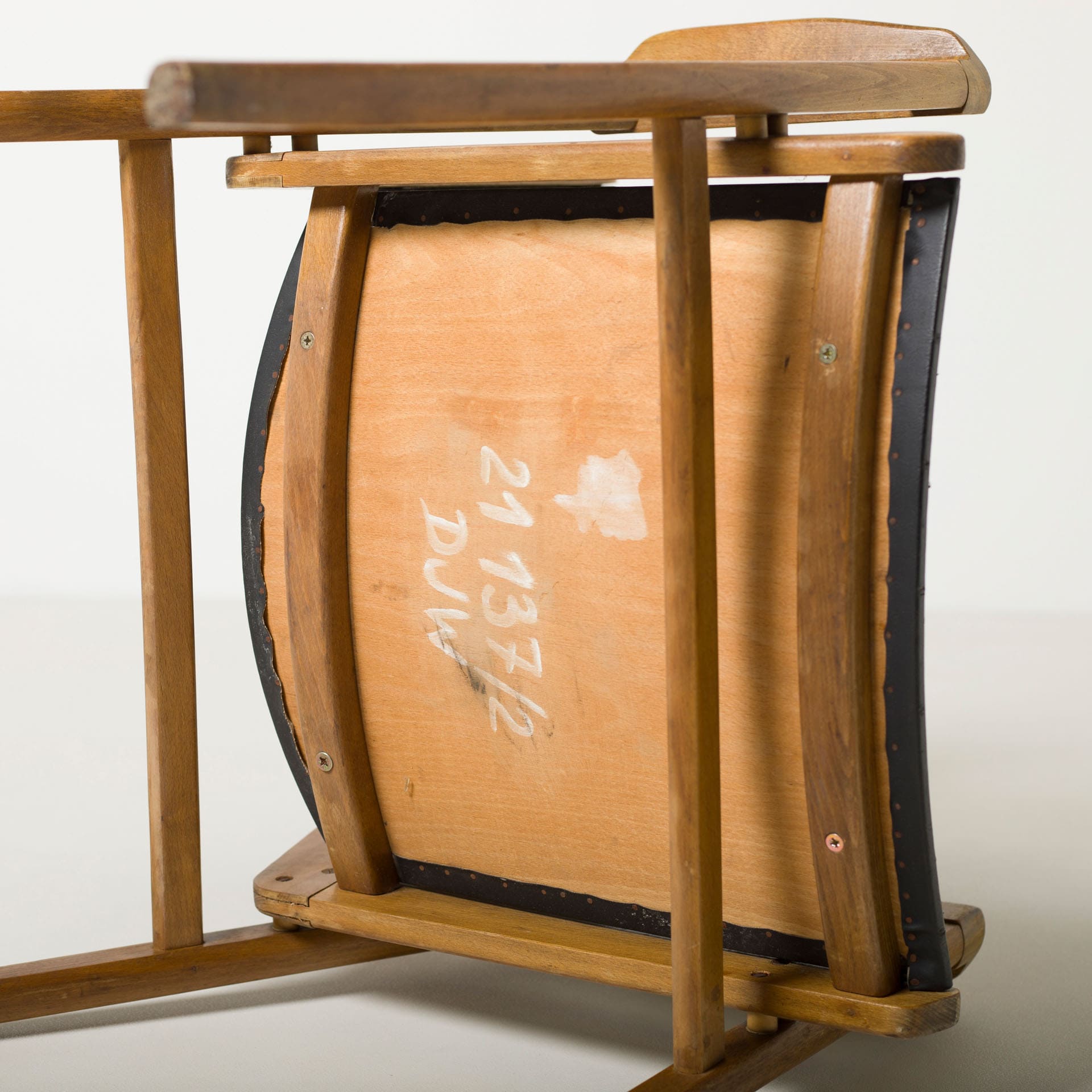 Siedziska i oparcia tapicerowane są czarną skórą ekologiczną, której neutralny charakter podkreśla naturalny rysunek drewna. Bukowa konstrukcja zachowała piękną patynę wynikającą z wieku i użytkowania.