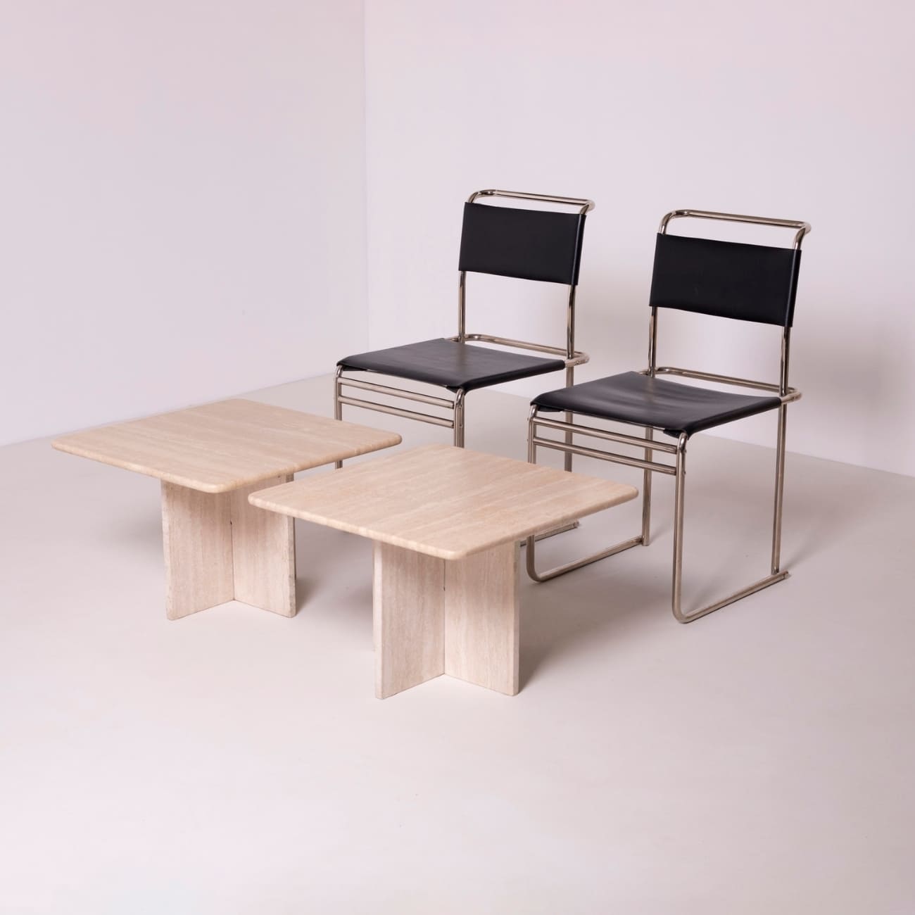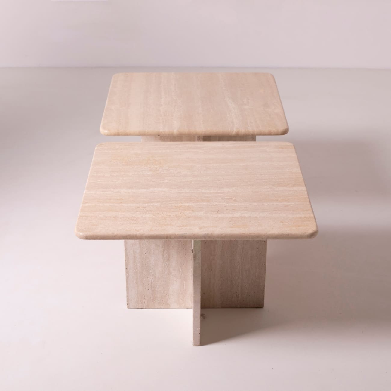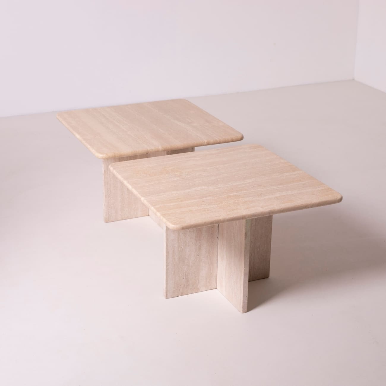 Para stolików kawowych z trawertynu zaprojektowanych we Włoszech w latach 80. XX wieku, reprezentujących nurt postmodernistycznego designu. Ich minimalistyczna, geometryczna forma zestawiona z naturalnym, ciepłym kamieniem tworzy harmonijny kontrast, typowy dla włoskiego wzornictwa tego okresu.