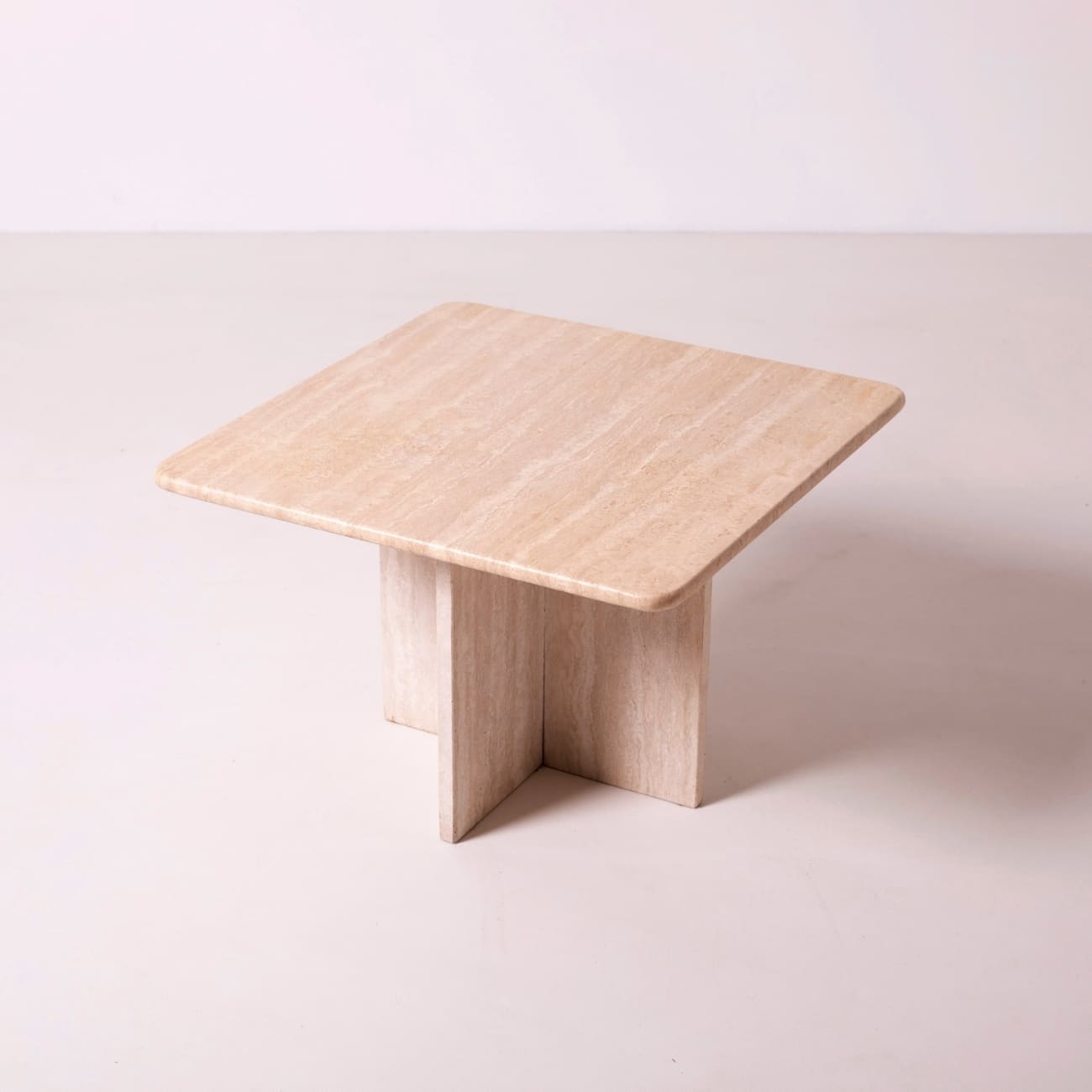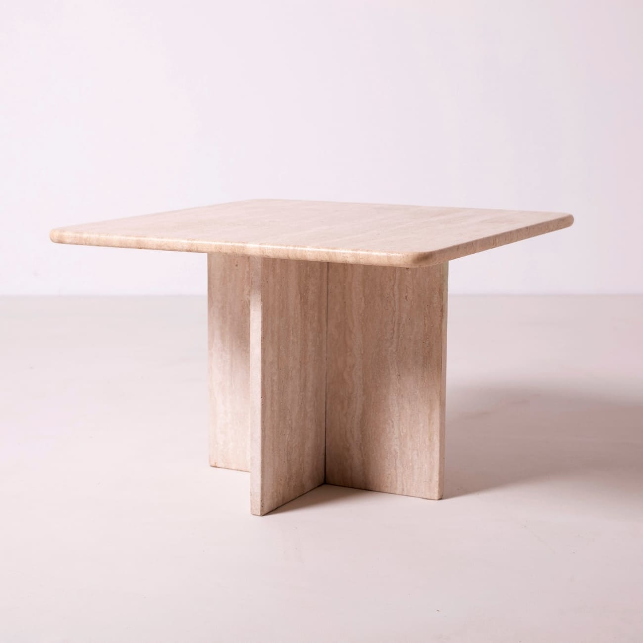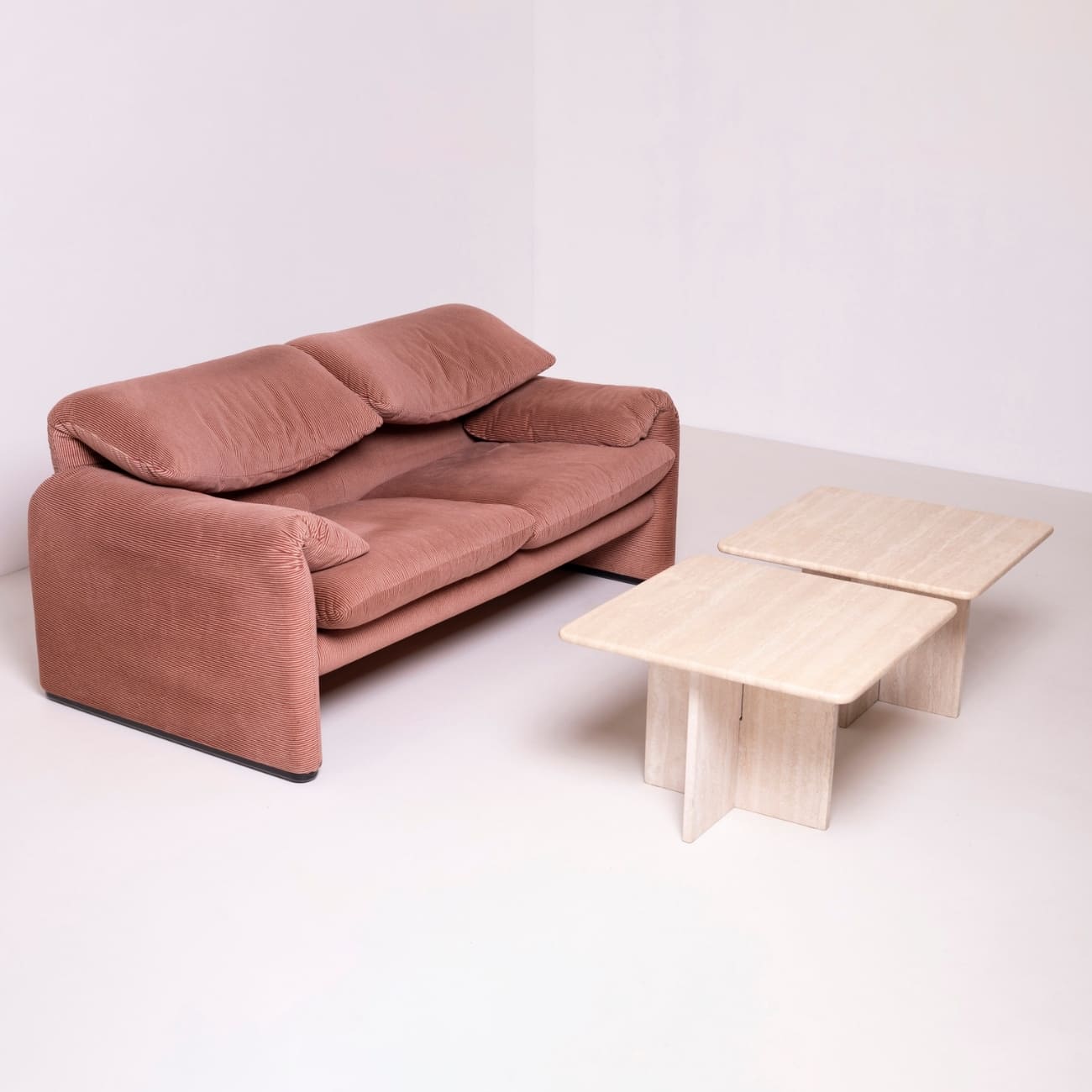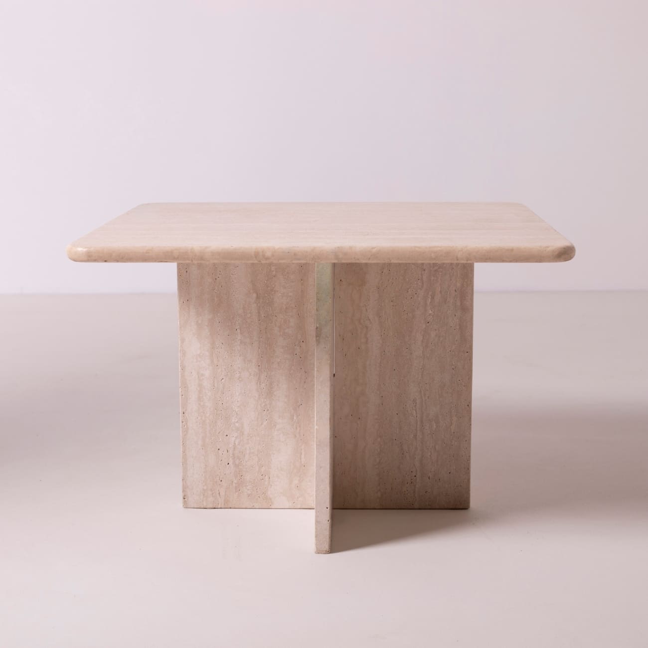 Para stolików kawowych z trawertynu zaprojektowanych we Włoszech w latach 80. XX wieku, reprezentujących nurt postmodernistycznego designu. Ich minimalistyczna, geometryczna forma zestawiona z naturalnym, ciepłym kamieniem tworzy harmonijny kontrast, typowy dla włoskiego wzornictwa tego okresu.