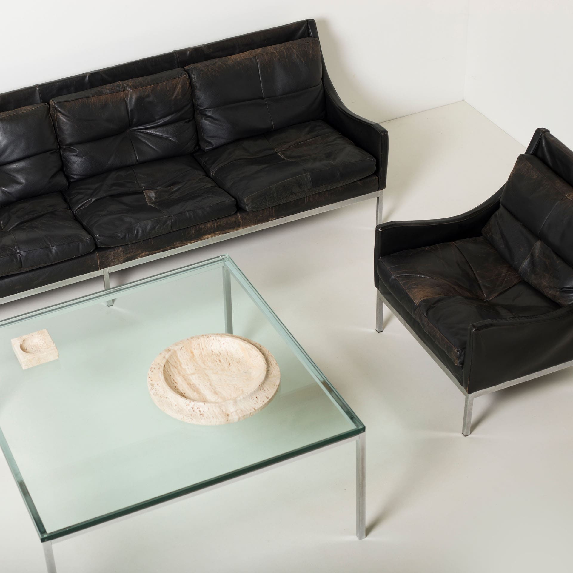 Fotele opierają się na zestawieniu chromowanej, lekkiej wizualnie konstrukcji z miękką skórzaną tapicerką. Charakterystyczna linia podłokietników oraz szerokie, nisko osadzone siedziska tworzą formę sprzyjającą wypoczynkowi. Proporcje bryły pozostają wyważone, a smukłe nogi nadają całości lekkości typowej dla modernistycznego wzornictwa środkowoeuropejskiego.