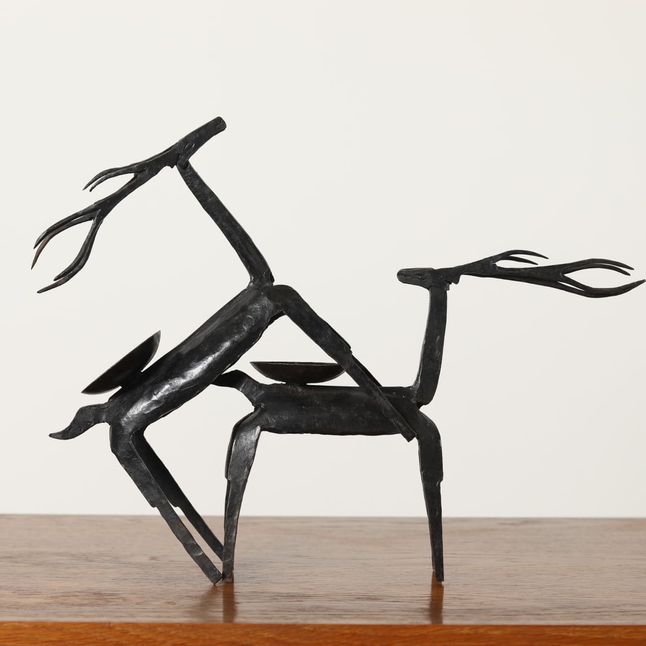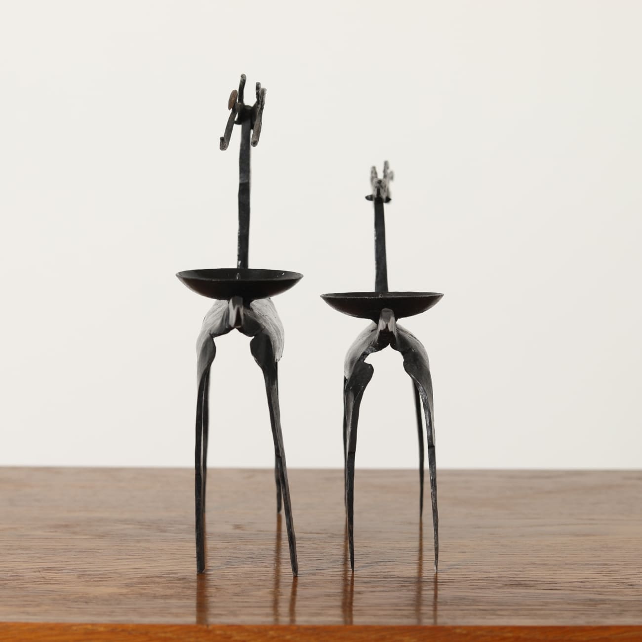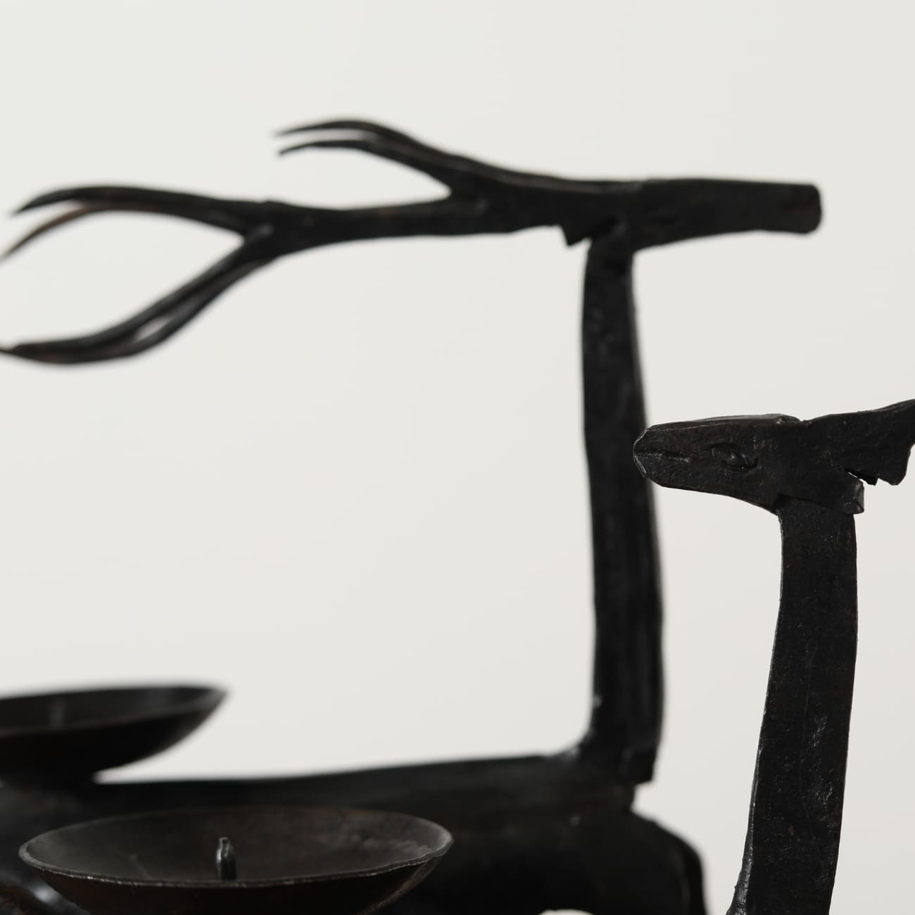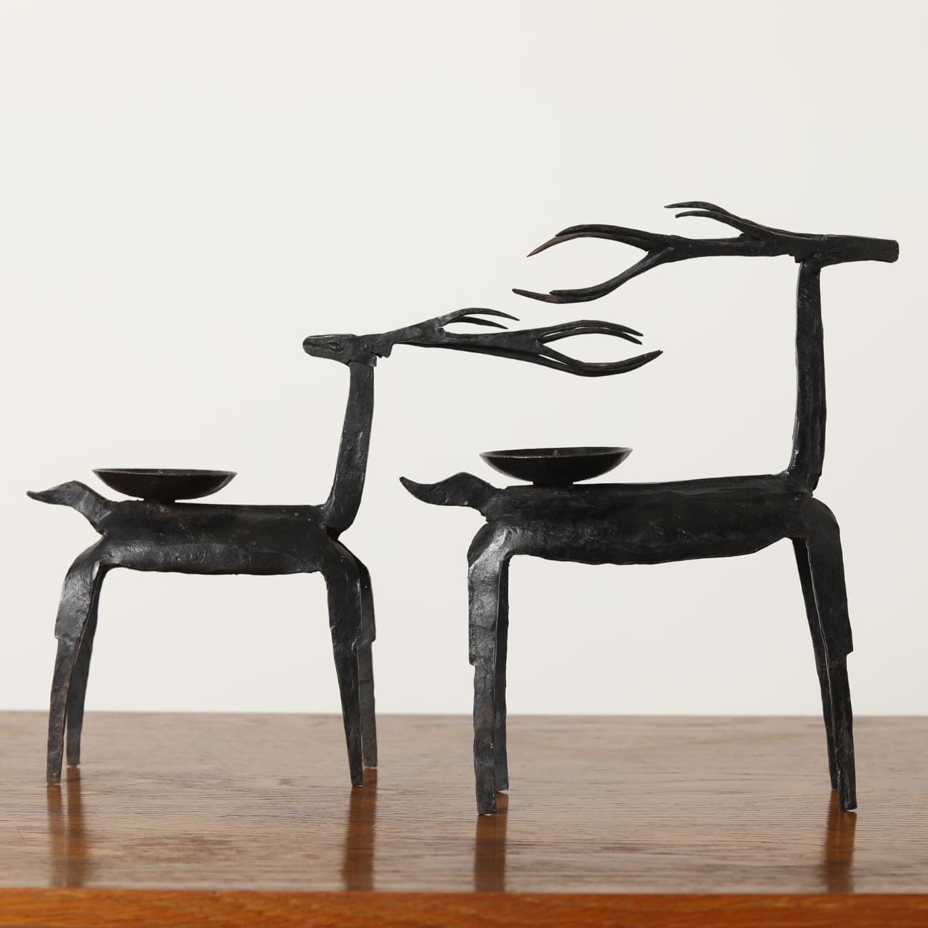 Prezentowana para wpisuje się w ten sposób myślenia. Wykonane z żelaza świeczniki łączą funkcję użytkową z uproszczoną interpretacją sylwetki jelenia. Forma została zredukowana do podstawowych linii, bez rozbudowanego detalu. Istotna pozostaje proporcja oraz relacja między elementami konstrukcyjnymi.