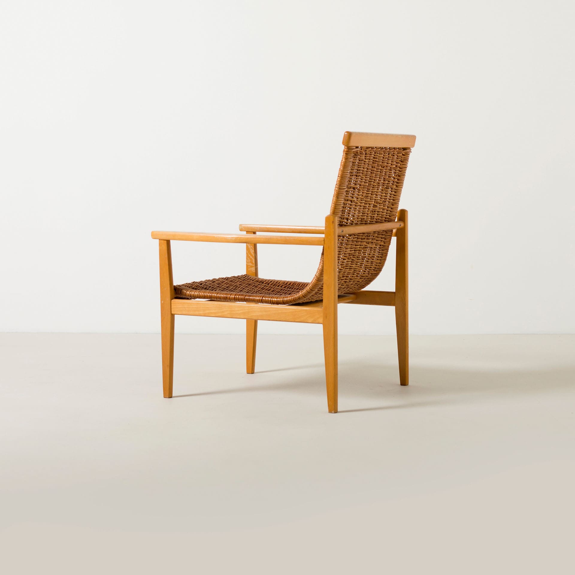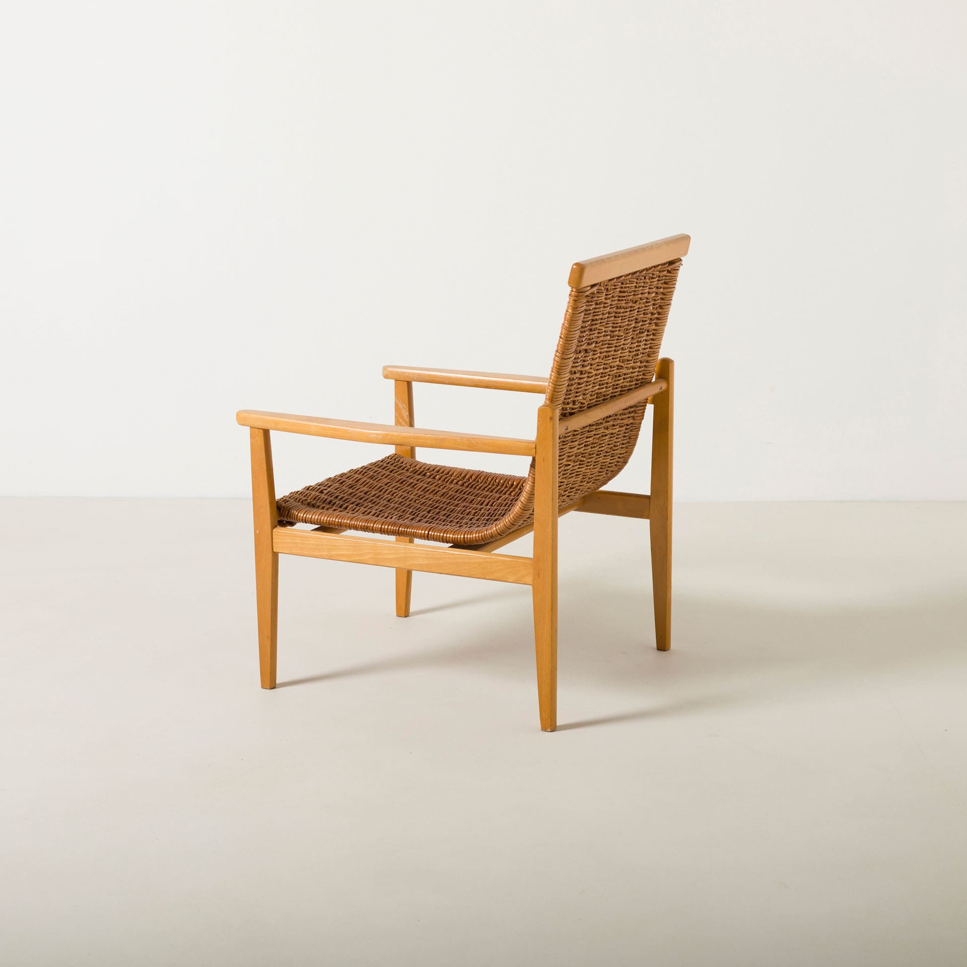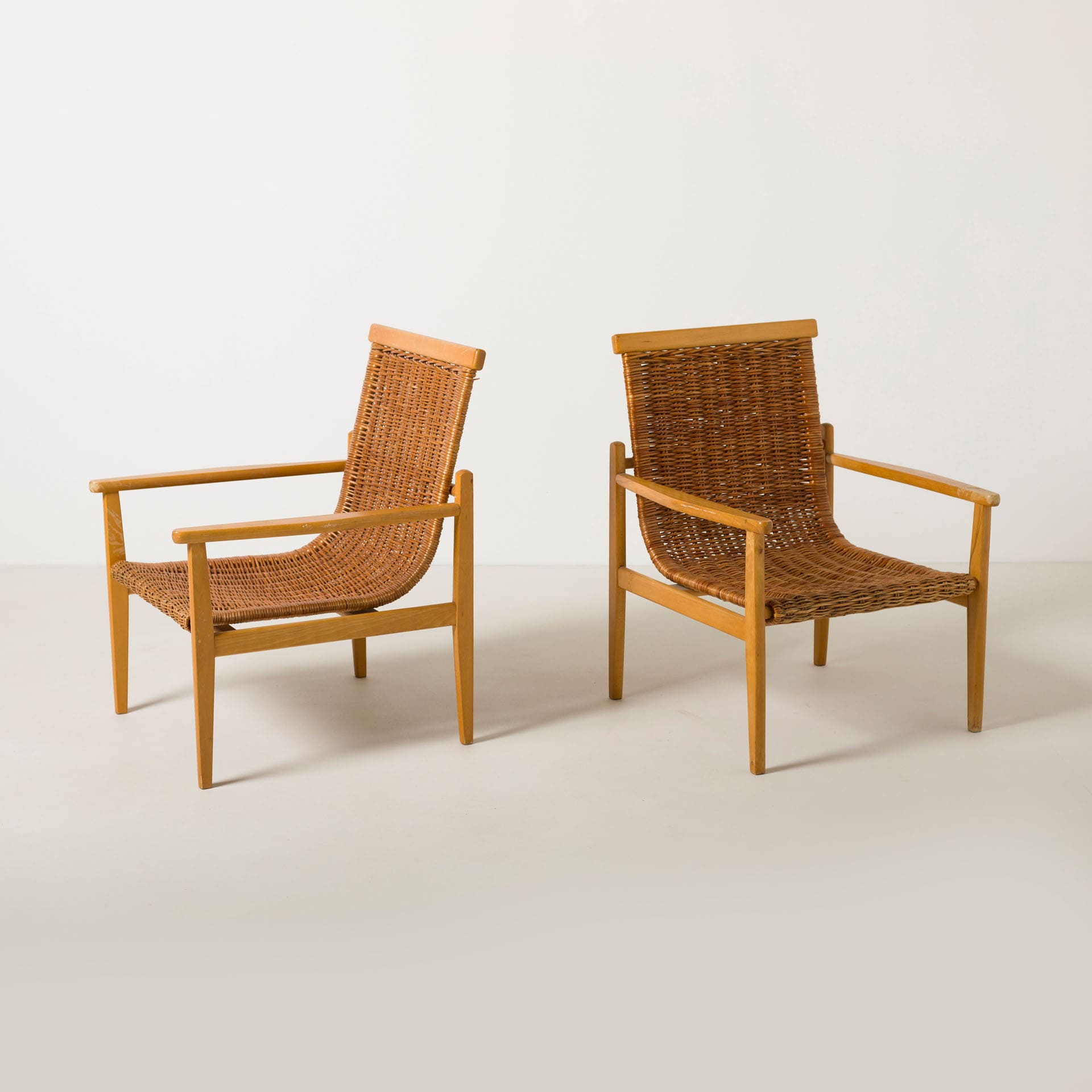 Prezentowana para foteli powstała w latach sześćdziesiątych i stanowi przykład harmonijnego połączenia tradycyjnych technik plecionkarskich z modernistyczną konstrukcją mebla. Konstrukcja wykonana została z drewna bukowego, które nadaje formie stabilność i naturalny charakter. Siedzisko i oparcie wykonano z ręcznie plecionej wikliny, tworzącej elastyczną i przewiewną powierzchnię.