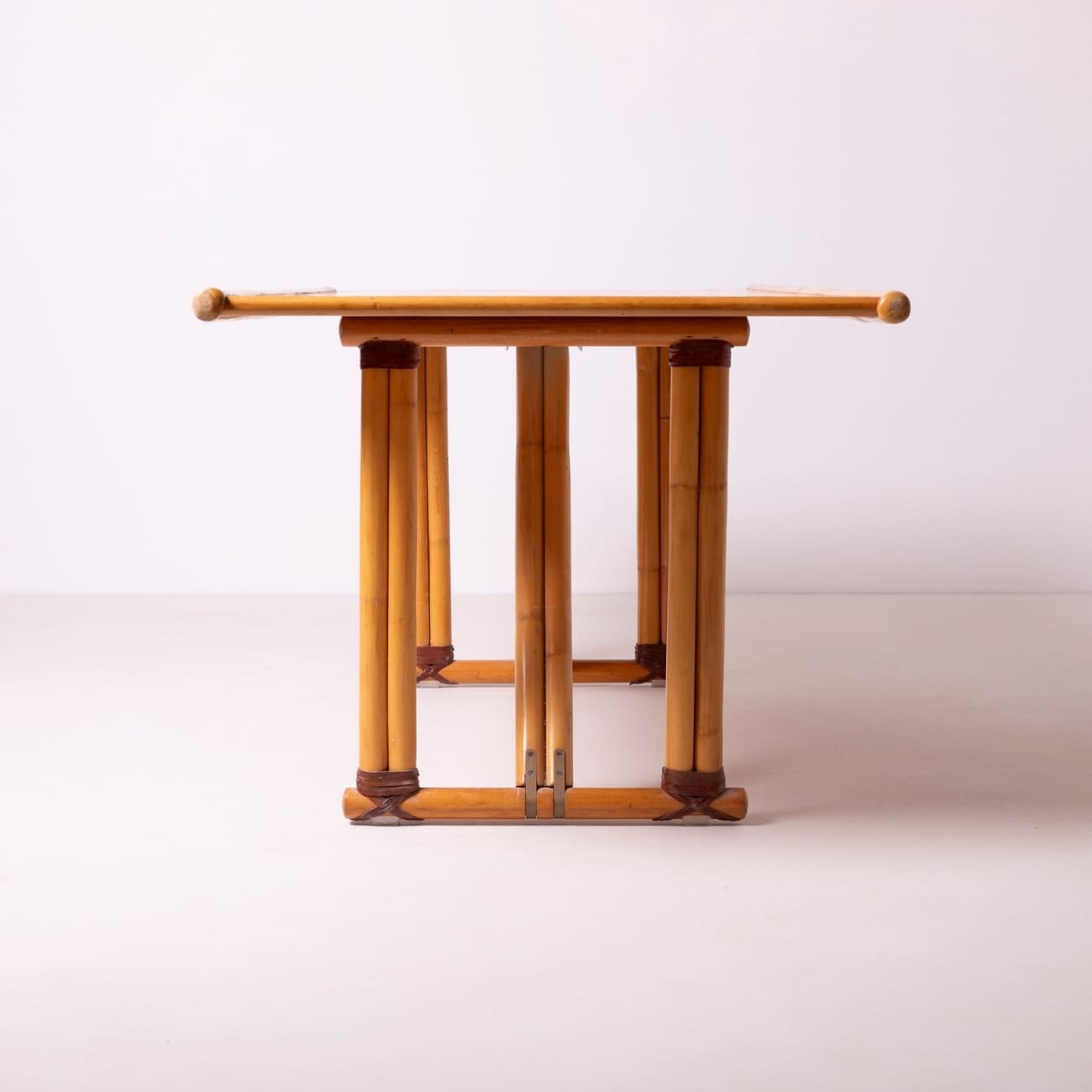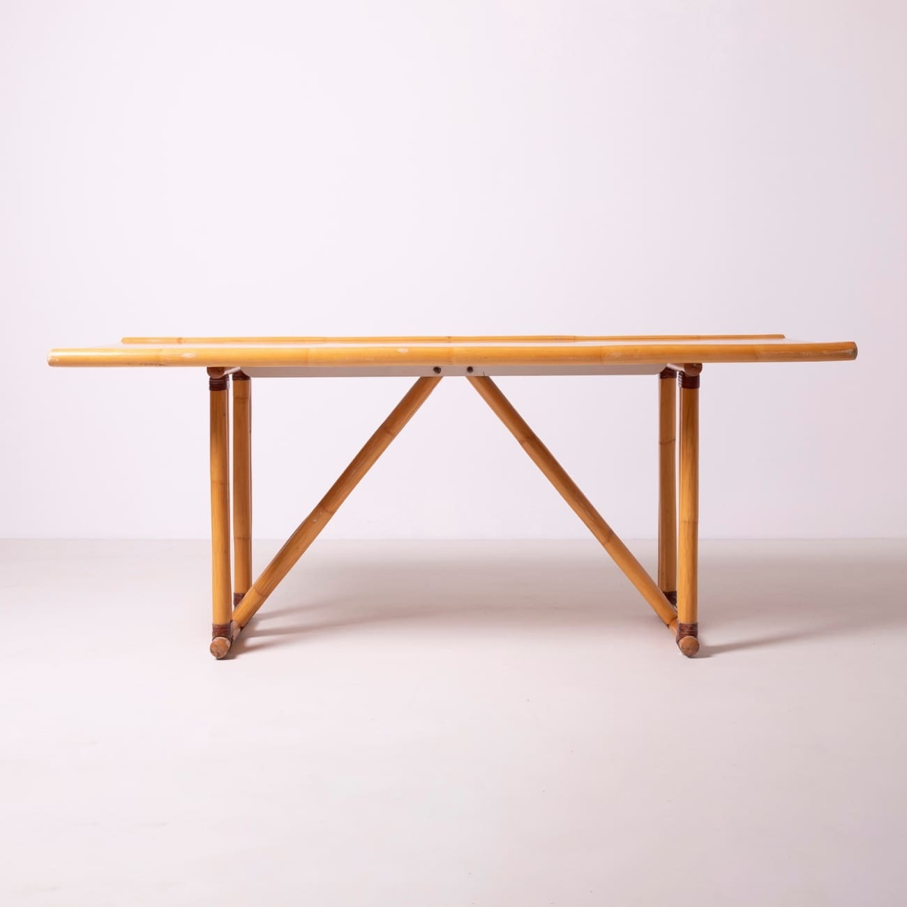 Wyjątkowy przykład włoskiego designu postmodernistycznego z lat 80. XX wieku — składany stół jadalny wykonany z bambusa. Projekt utrzymany w charakterystycznej dla epoki estetyce łączącej naturalne materiały z odważną formą i funkcjonalnością.