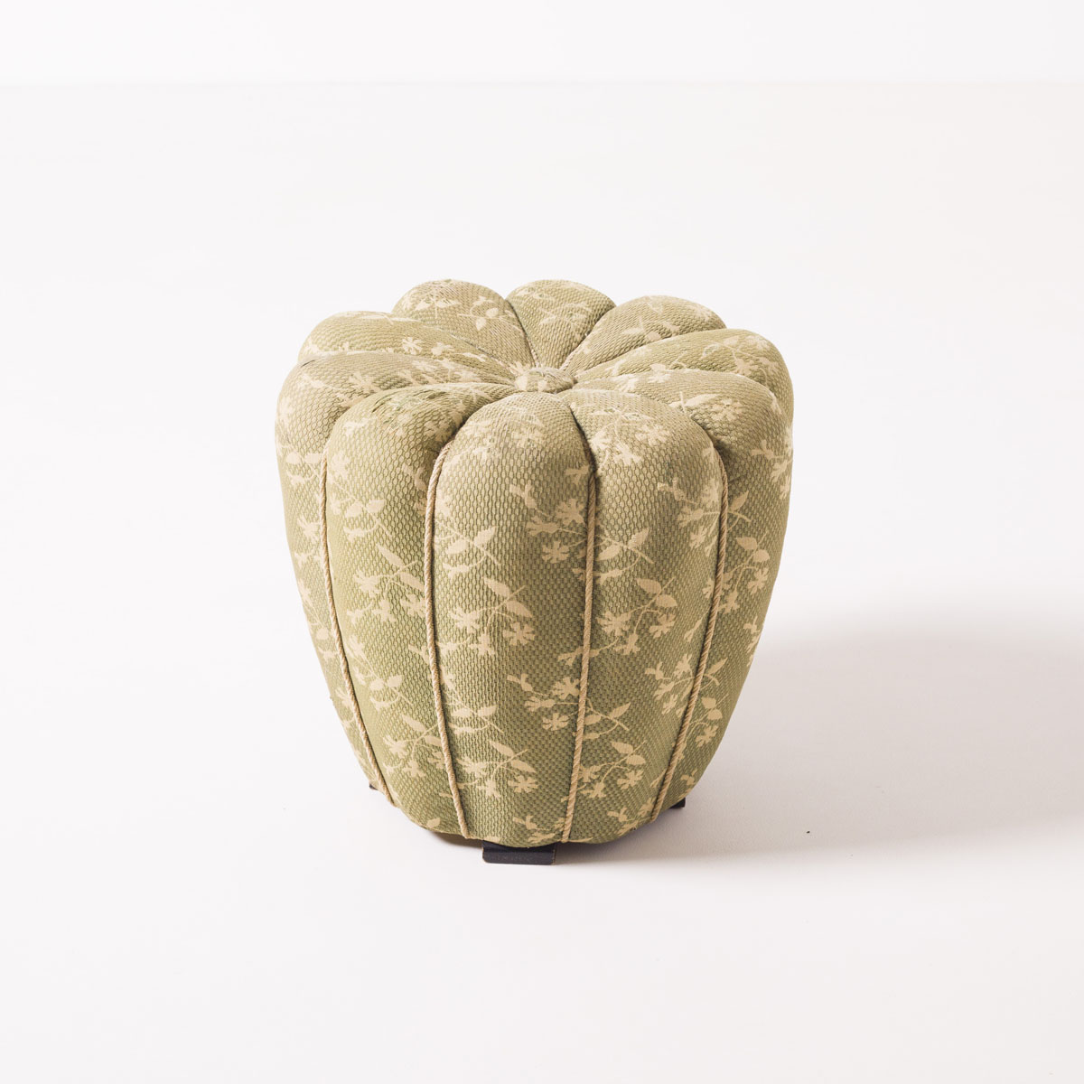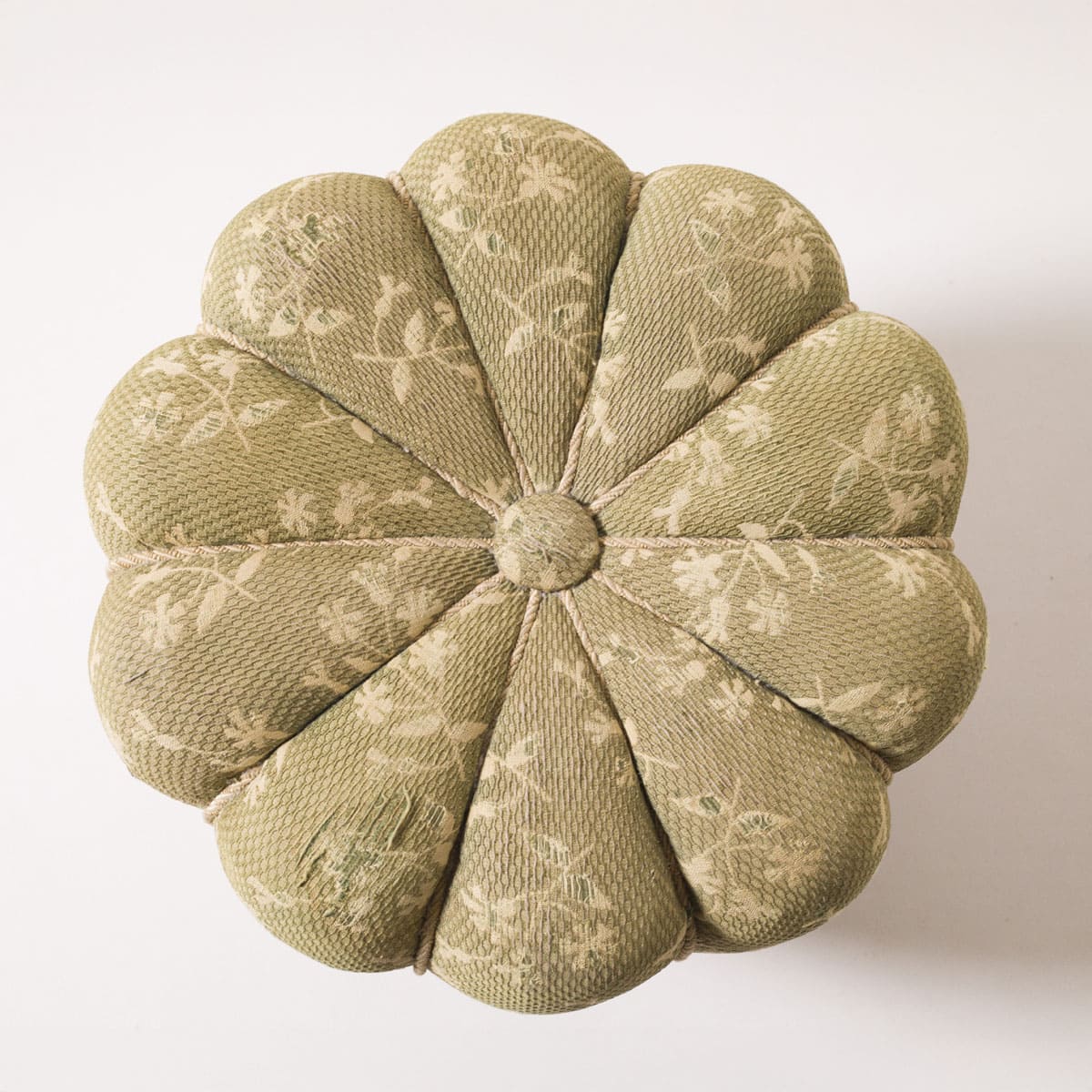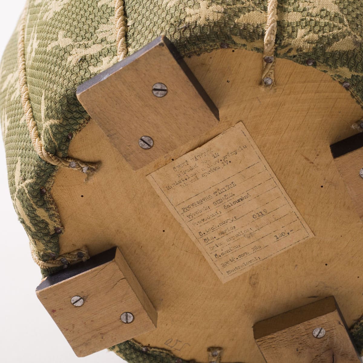 Stan zachowania: bardzo dobry, oryginalny. Drewno nosi naturalne ślady czasu, zgodne z wiekiem obiektu, bez ingerencji renowacyjnych. Tkanina pozostaje czysta, bez przetarć i ubytków strukturalnych. Puf zachował pełną funkcjonalność użytkową oraz autentyczność materiałową.