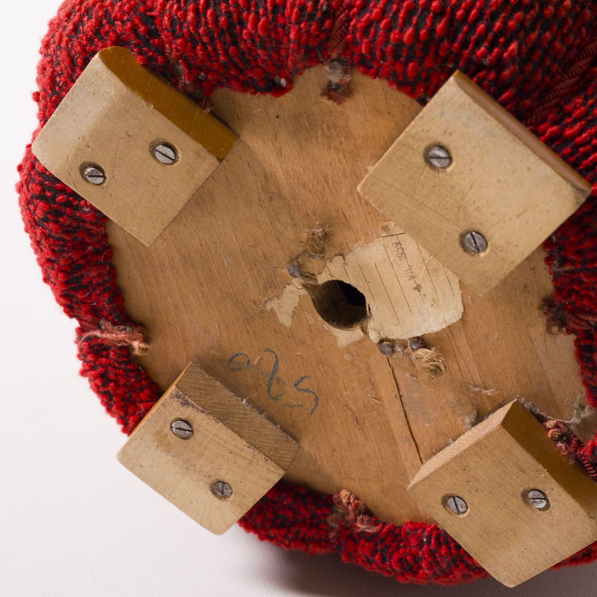 Stan zachowania: bardzo dobry, oryginalny. Drewno nosi naturalne ślady czasu, zgodne z wiekiem obiektu, bez ingerencji renowacyjnych. Tkanina pozostaje czysta, bez przetarć i ubytków strukturalnych. Puf zachował pełną funkcjonalność użytkową oraz autentyczność materiałową.