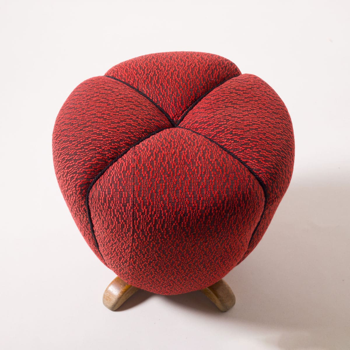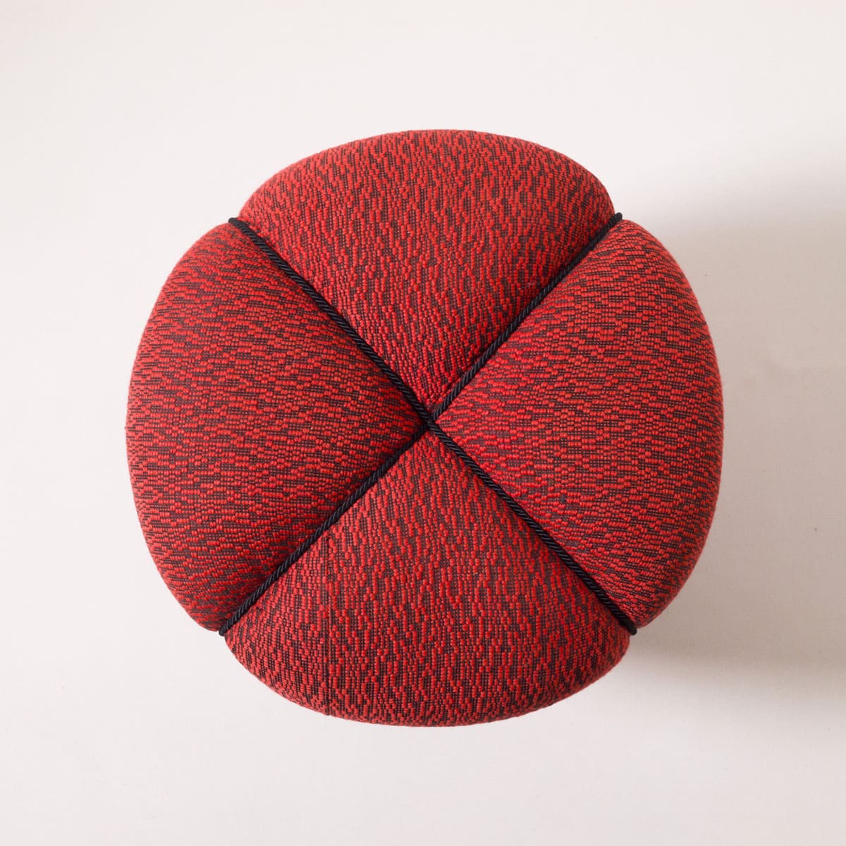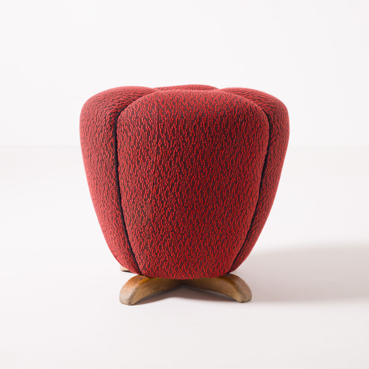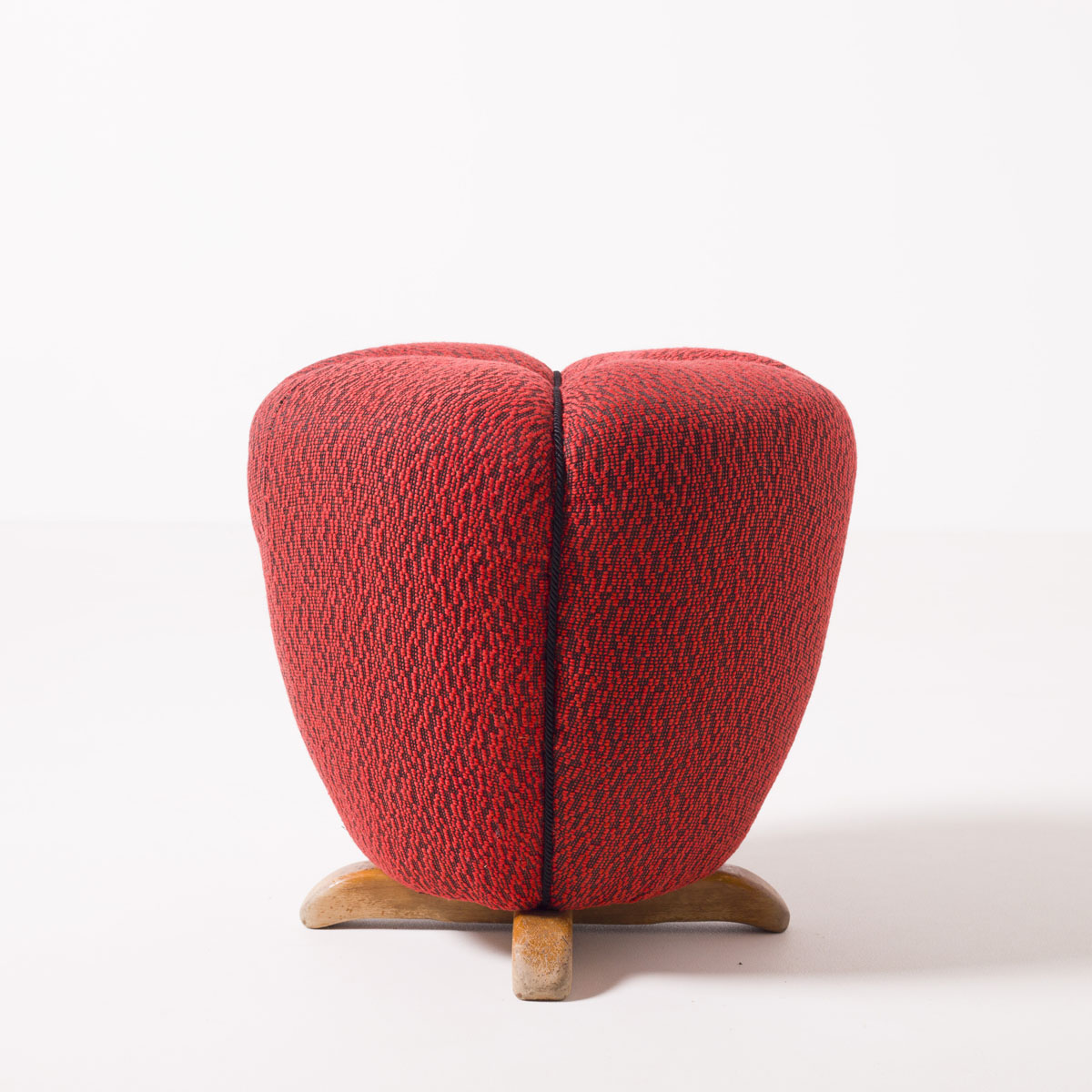 Forma obiektu oparta jest na czteropłatowej, symetrycznej bryle tapicerowanej, osadzonej na niewielkiej, drewnianej podstawie. Kształt nie jest dekoracyjny w tradycyjnym sensie, lecz wynika z konstrukcji i sposobu napięcia tapicerki. Jest to mebel, który został zaprojektowany jako element większego zestawu wypoczynkowego, pełniący funkcję pomocniczą, siedziska lub podnóżka, ale jednocześnie posiadający wyraźną autonomię formalną.