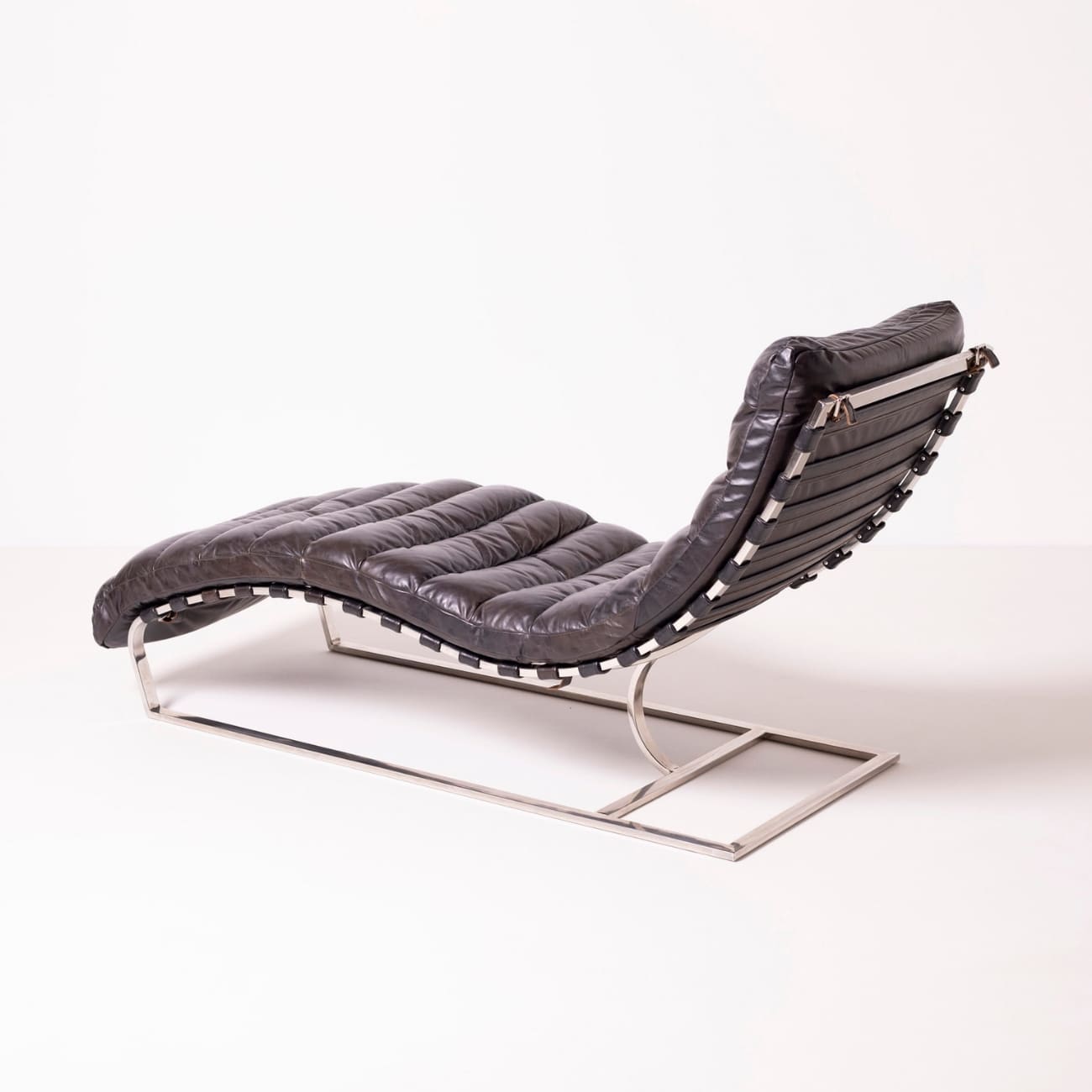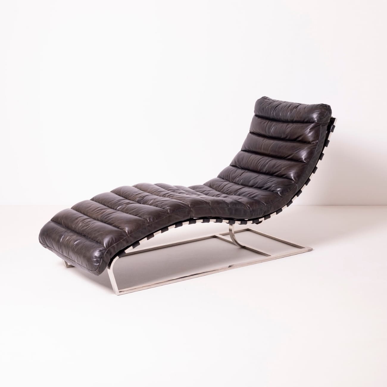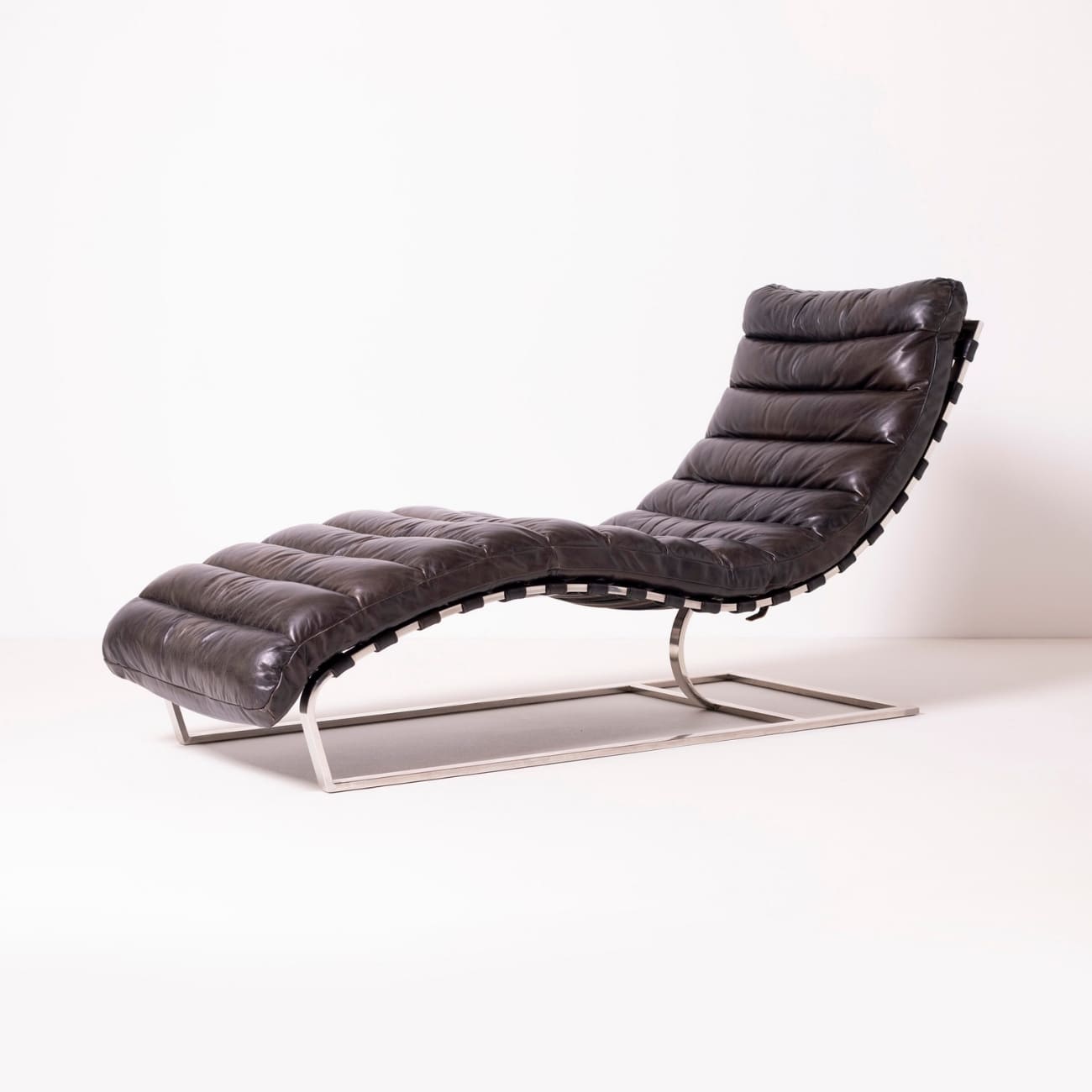Prezentowana leżanka Oviedo to nowoczesna interpretacja klasyki w stylu Mid-Century, wyprodukowana w Stanach Zjednoczonych około 2010 roku. Mebel wykonano z ciemnobrązowej skóry cielęcej oraz chromowanej stali, nawiązując stylistycznie do projektów Miesa van der Rohe.