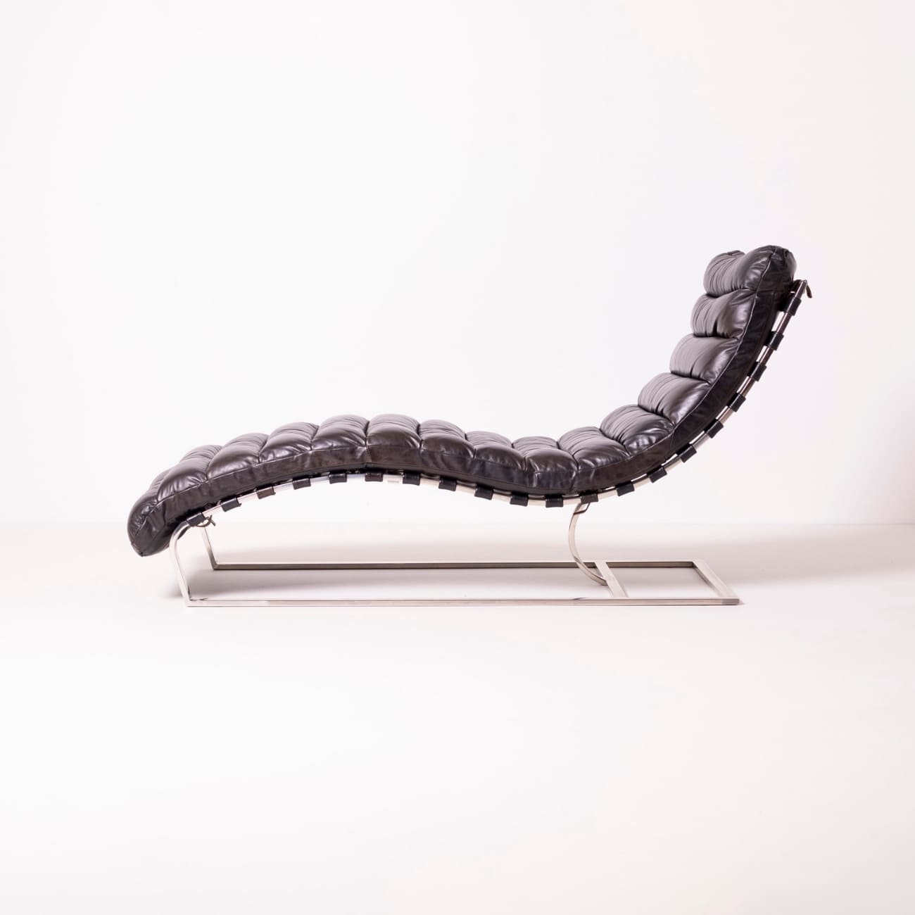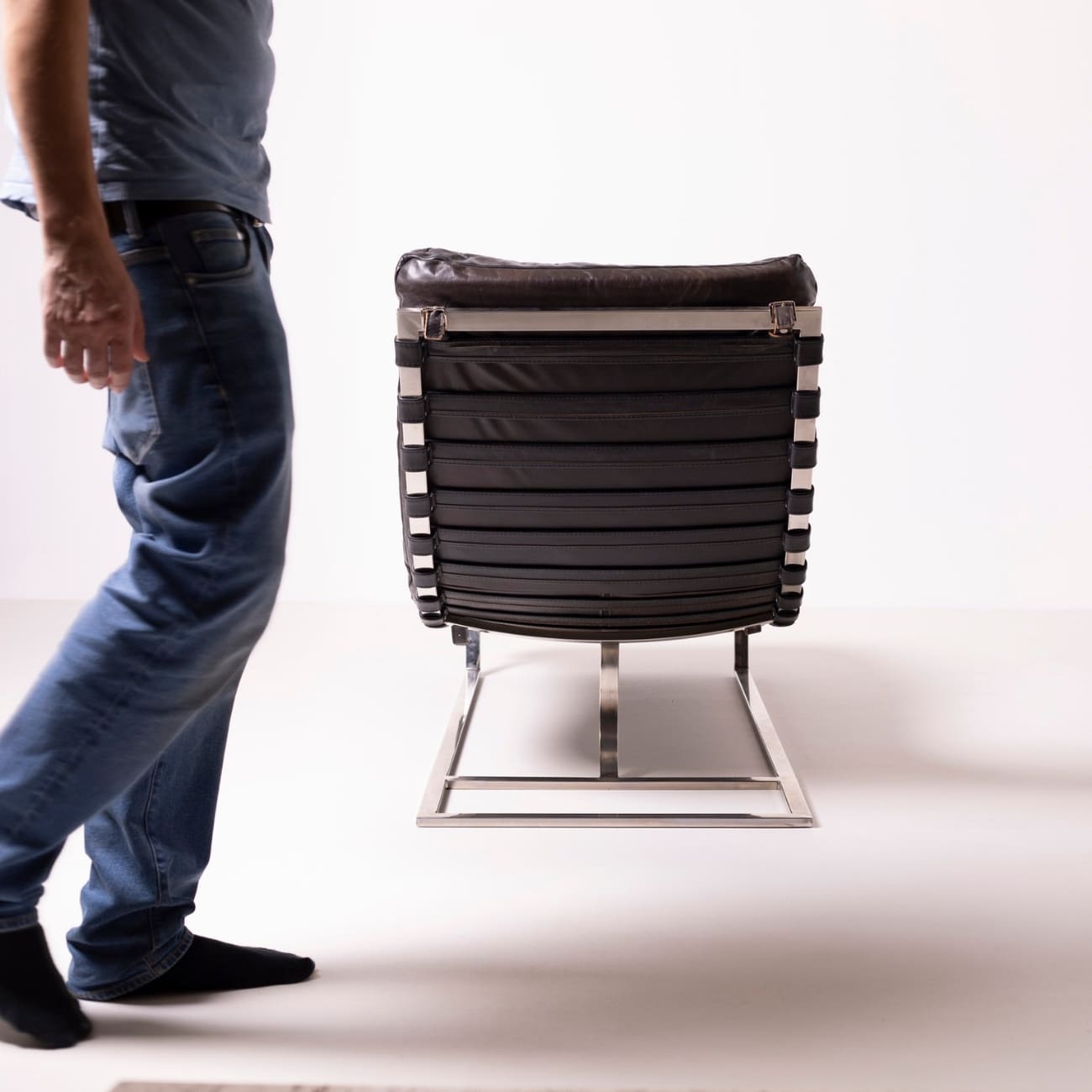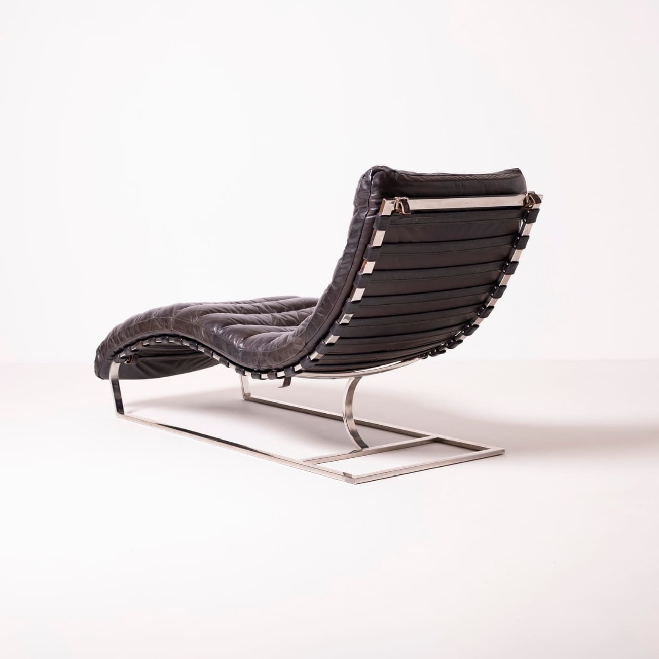 Prezentowana leżanka Oviedo to nowoczesna interpretacja klasyki w stylu Mid-Century, wyprodukowana w Stanach Zjednoczonych około 2010 roku. Mebel wykonano z ciemnobrązowej skóry cielęcej oraz chromowanej stali, nawiązując stylistycznie do projektów Miesa van der Rohe.