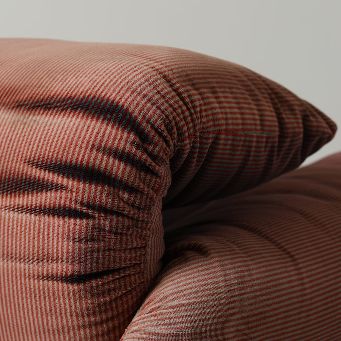 Forma opiera się na zwartej, miękkiej strukturze o zaokrąglonych krawędziach. Siedzisko, podłokietniki i oparcie tworzą jednolitą masę, w której ukryty mechanizm nie zakłóca proporcji. Podział na dwa miejsca porządkuje kompozycję i stabilizuje odbiór wizualny.
