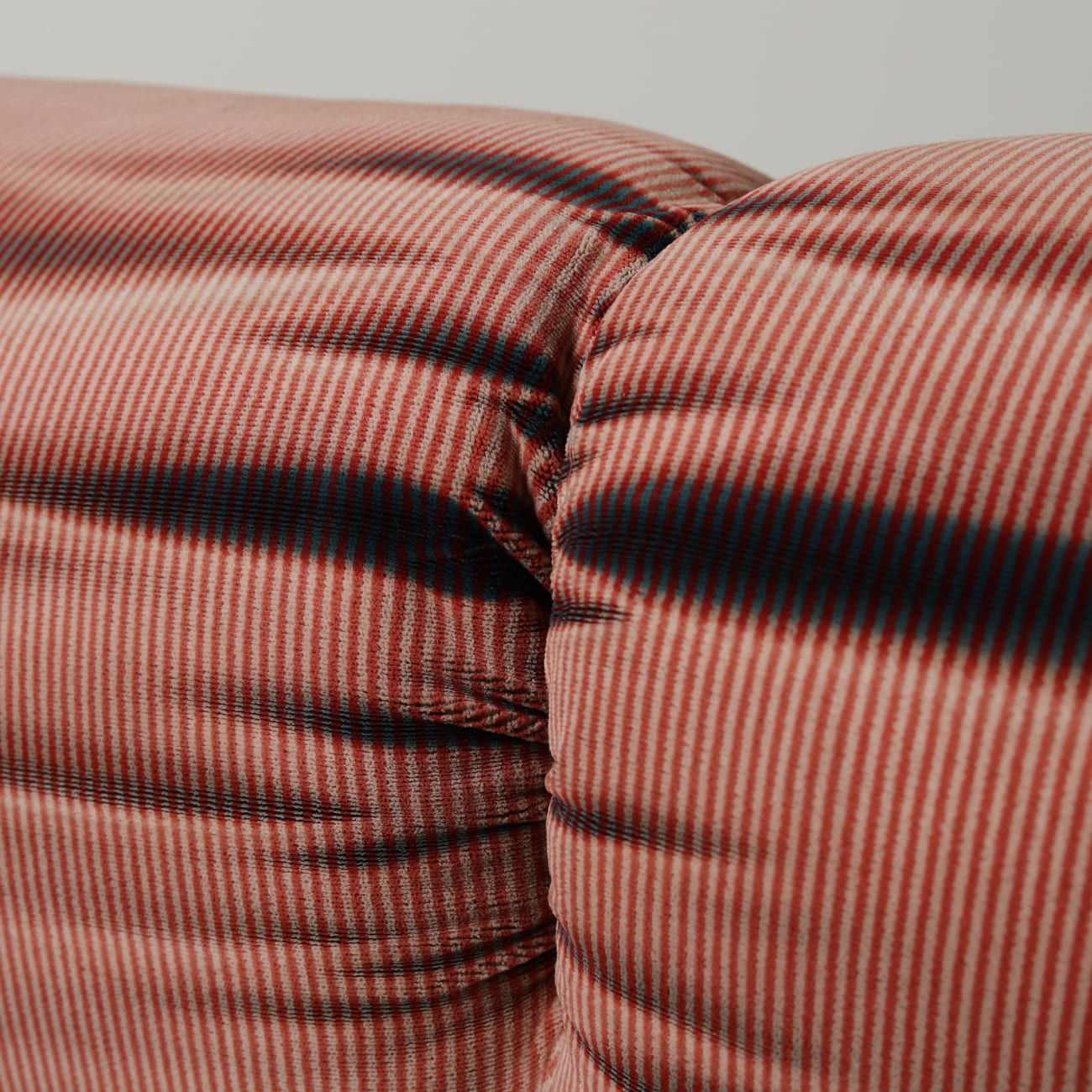 Oryginalna tkanina w pasy, utrzymana w tonacjach burgundu i fioletu, uległa naturalnej zmianie barwy pod wpływem światła. W tylnej partii oraz w górnej strefie oparcia widoczne jest przejście w kierunku przygaszonego różu. Zmiana ta wynika z ekspozycji i stanowi trwały zapis użytkowania.