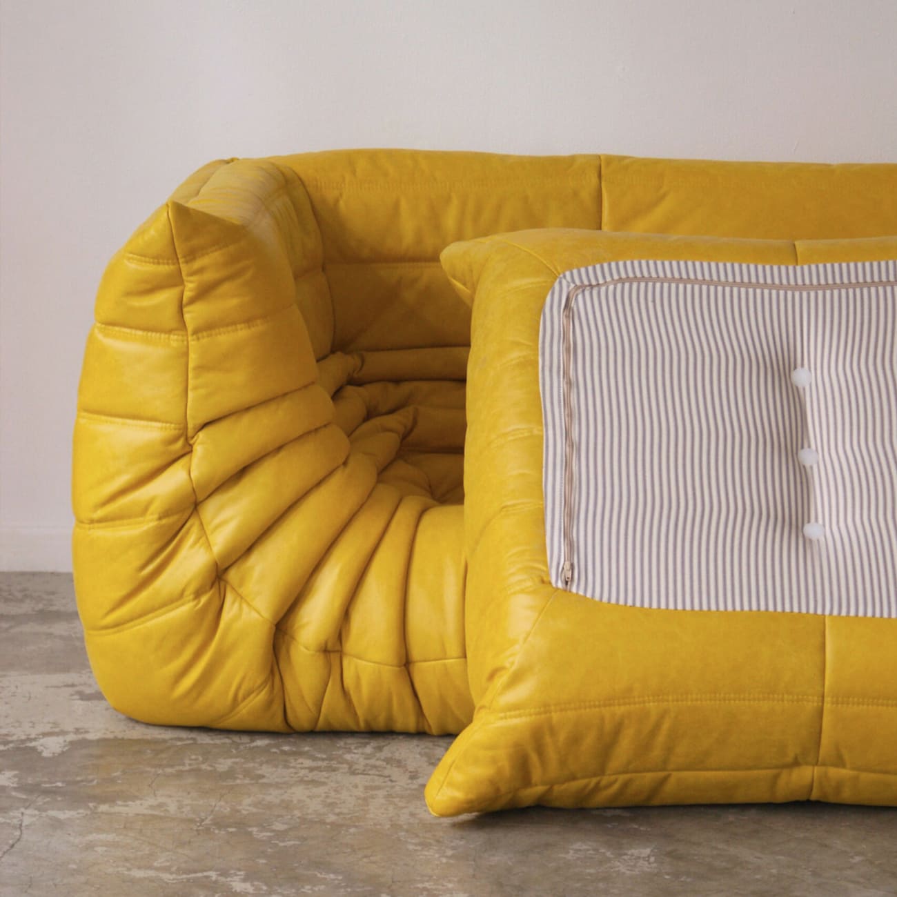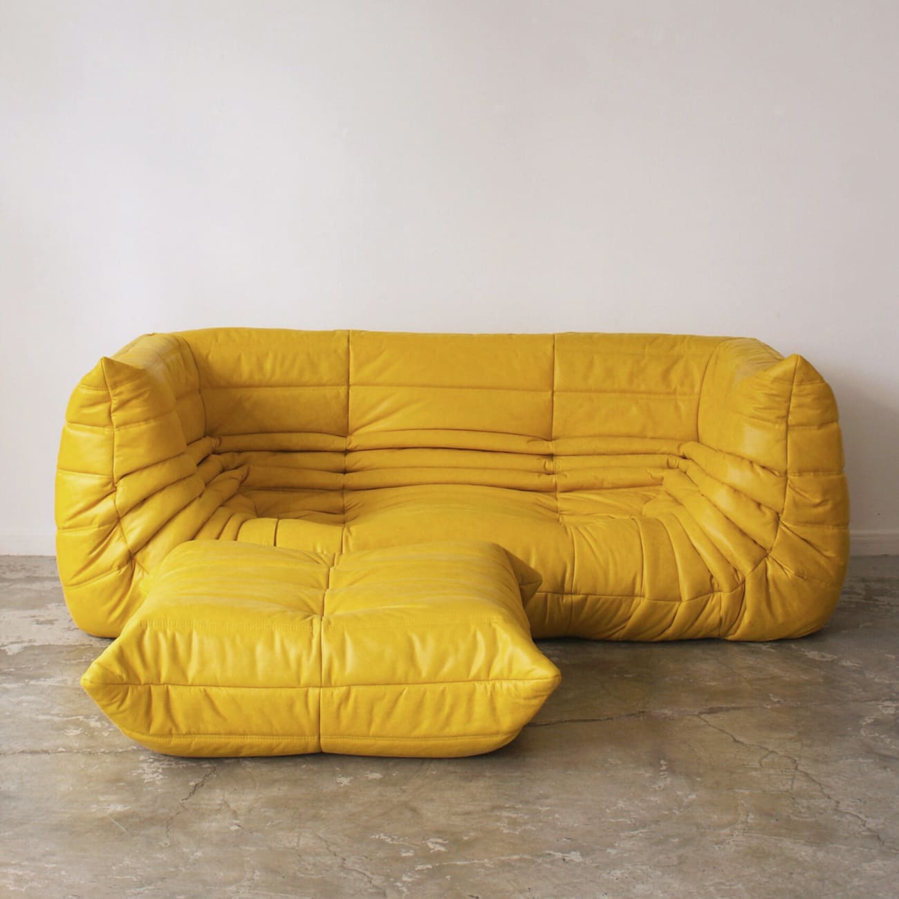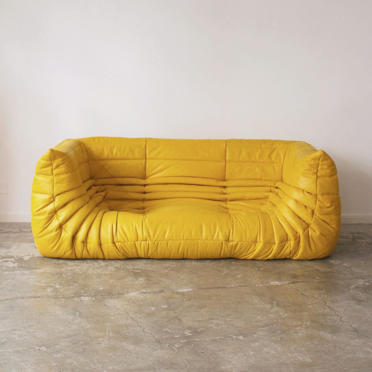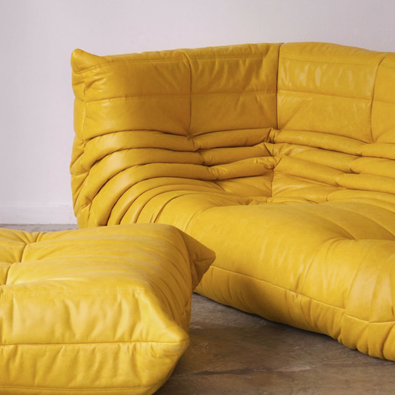 Sofa Togo z podnóżkiem, yellow leather, proj. Michel Ducaroy, Ligne Roset, Francja, 2006.