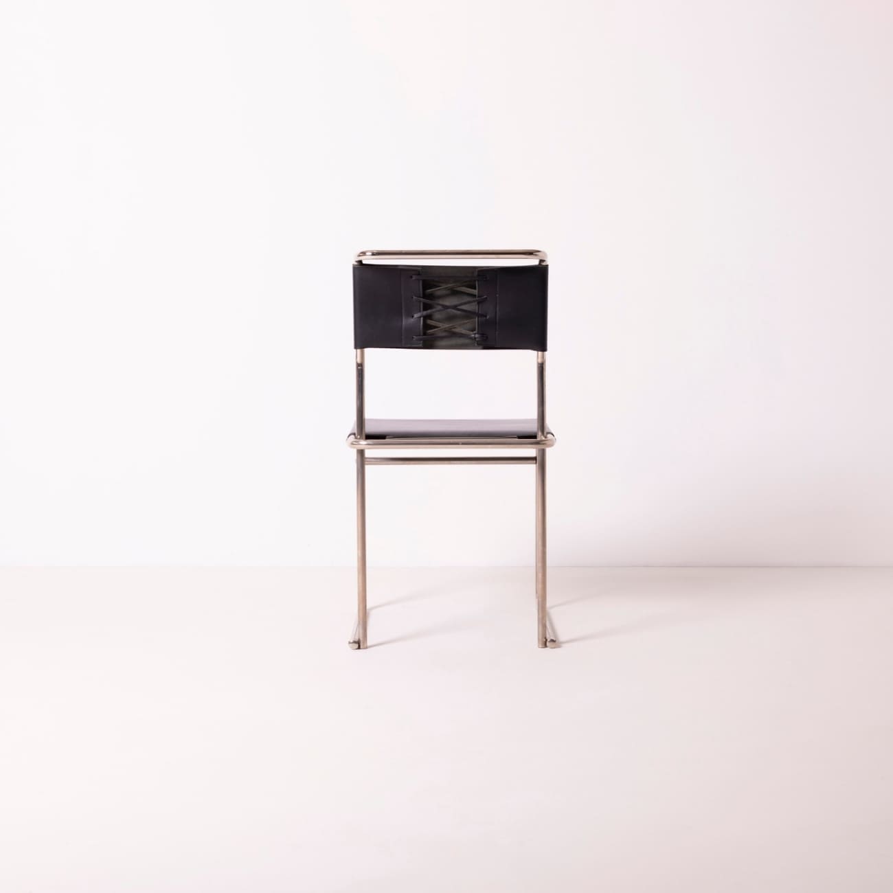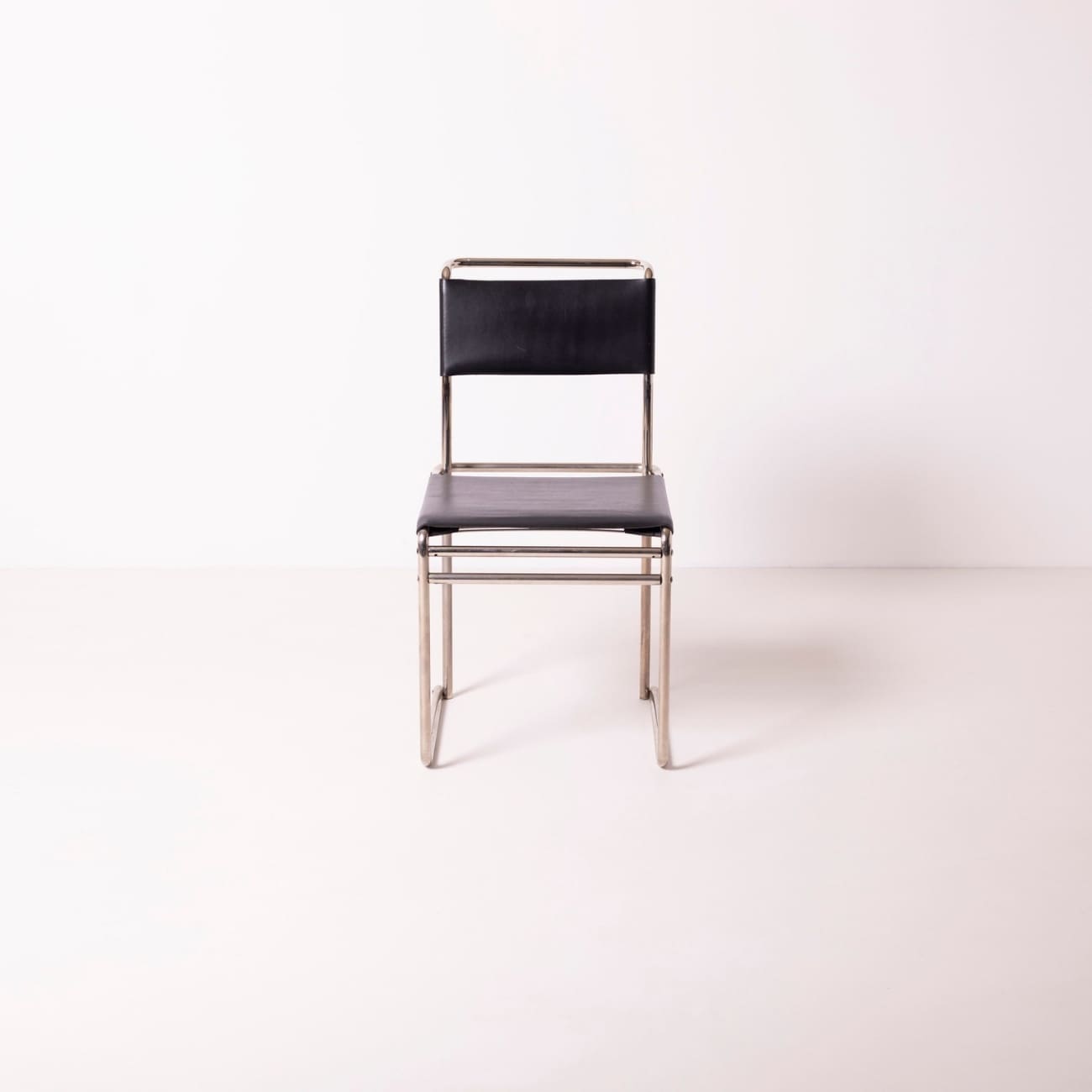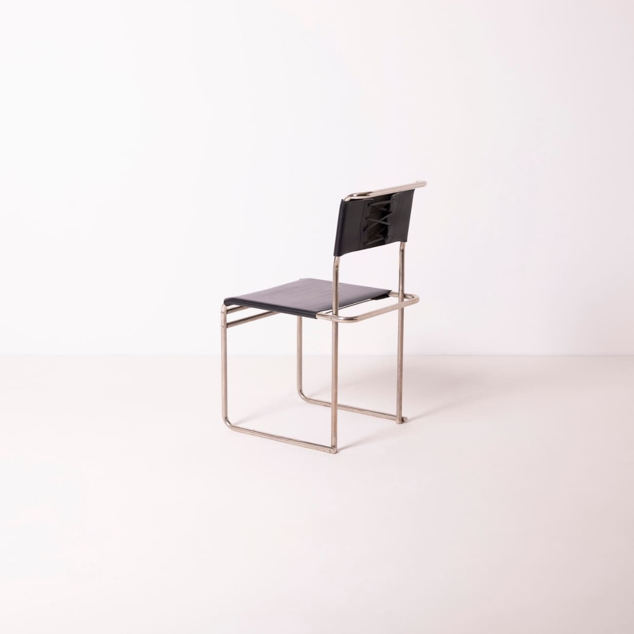 Kultowe krzesło Tecta B40, zaprojektowane przez Marcela Breuera w duchu Bauhausu, stanowi przykład połączenia nowoczesnej estetyki z wysoką funkcjonalnością. Prezentowany egzemplarz pochodzi z Niemiec, z lat 90. XX wieku, i wykonany jest z niklowanej giętej stali oraz czarnej skóry, co nadaje mu elegancki i ponadczasowy charakter.