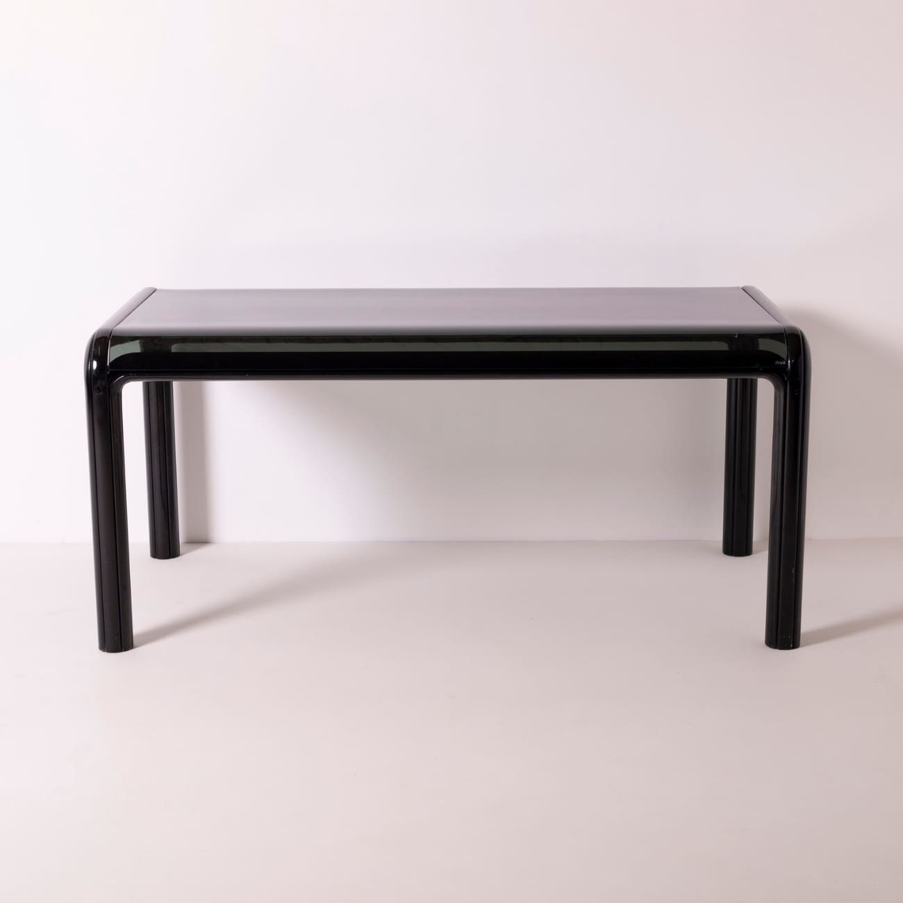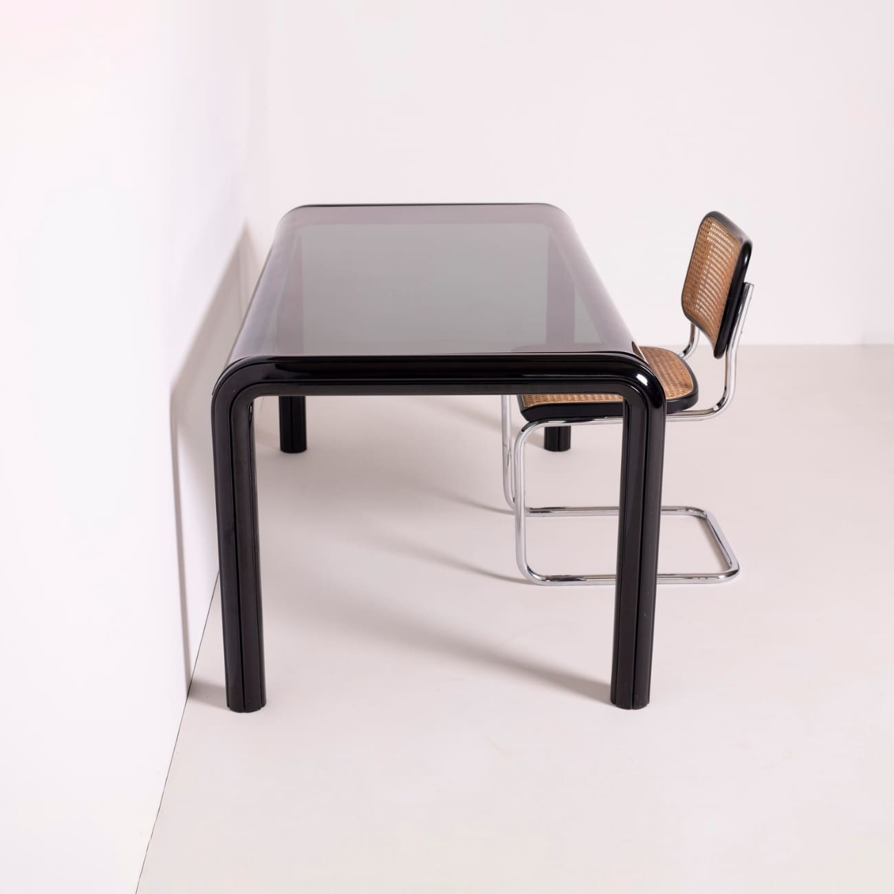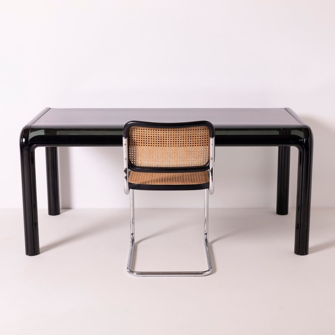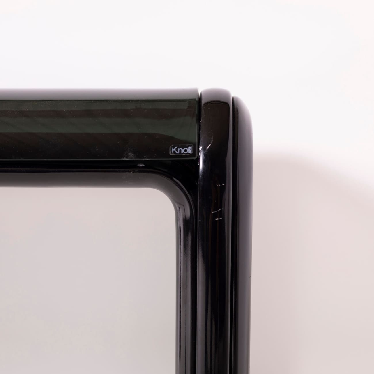 Projekt Gae Aulenti dla Knoll w latach 80. uchwycił elegancję włoskiego modernizmu, łącząc lekkość formy z przemysłową precyzją materiałów. Rama stołu wykonana z czarnego, malowanego aluminium tworzy kontrast z przyciemnianym szkłem hartowanym, które nadaje powierzchni wyrafinowaną przejrzystość.