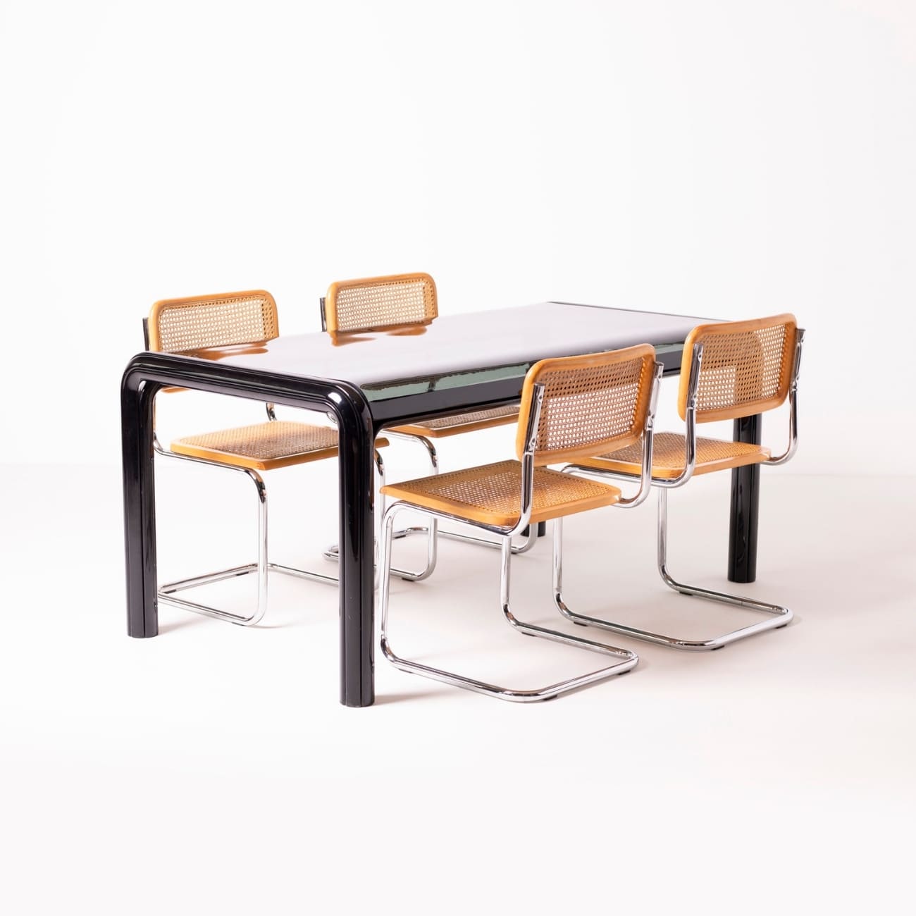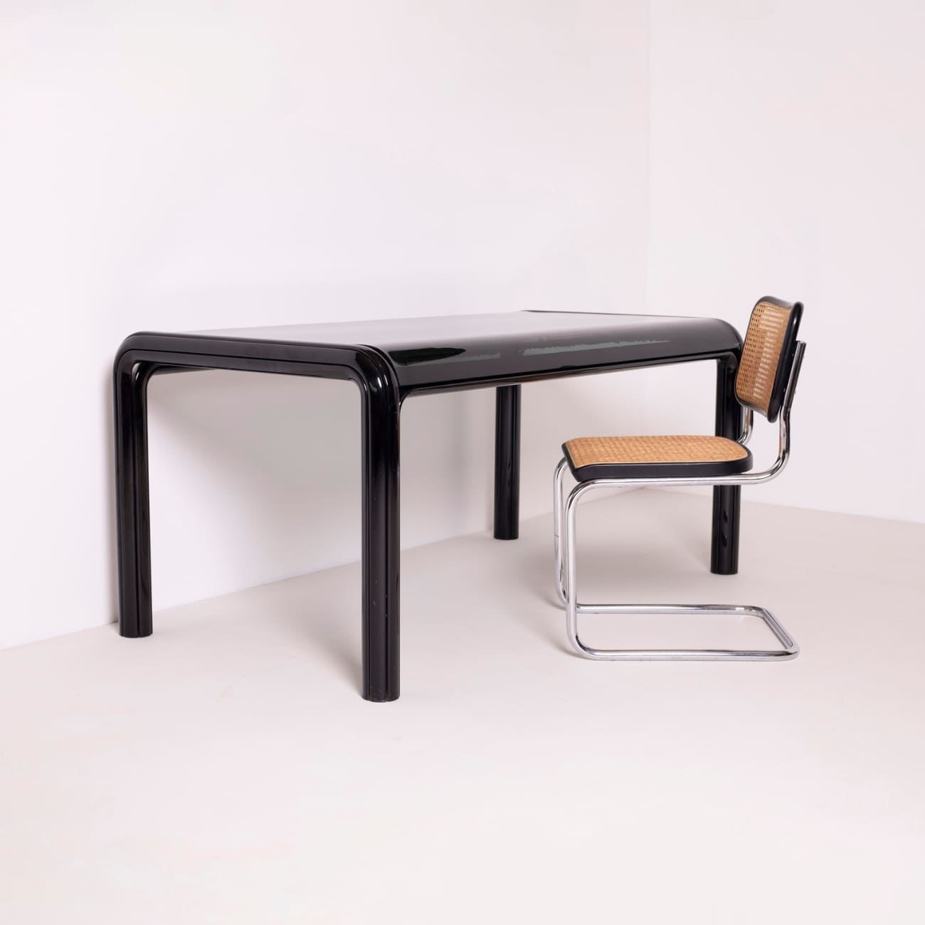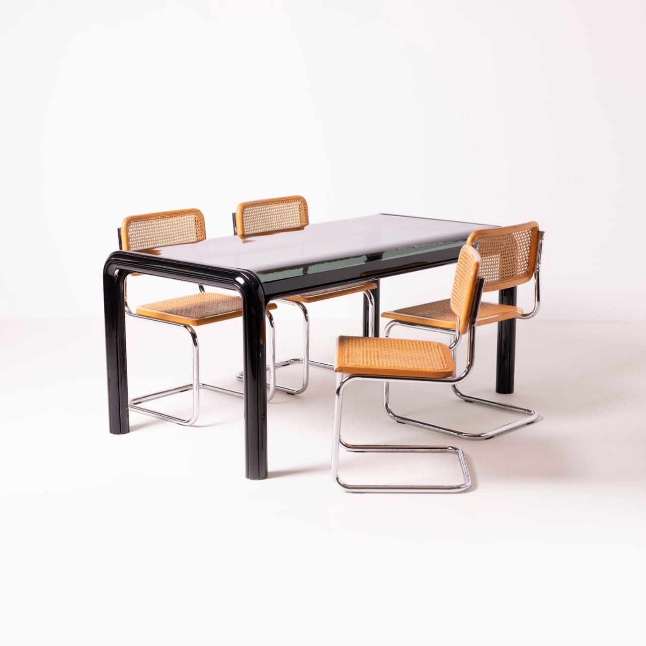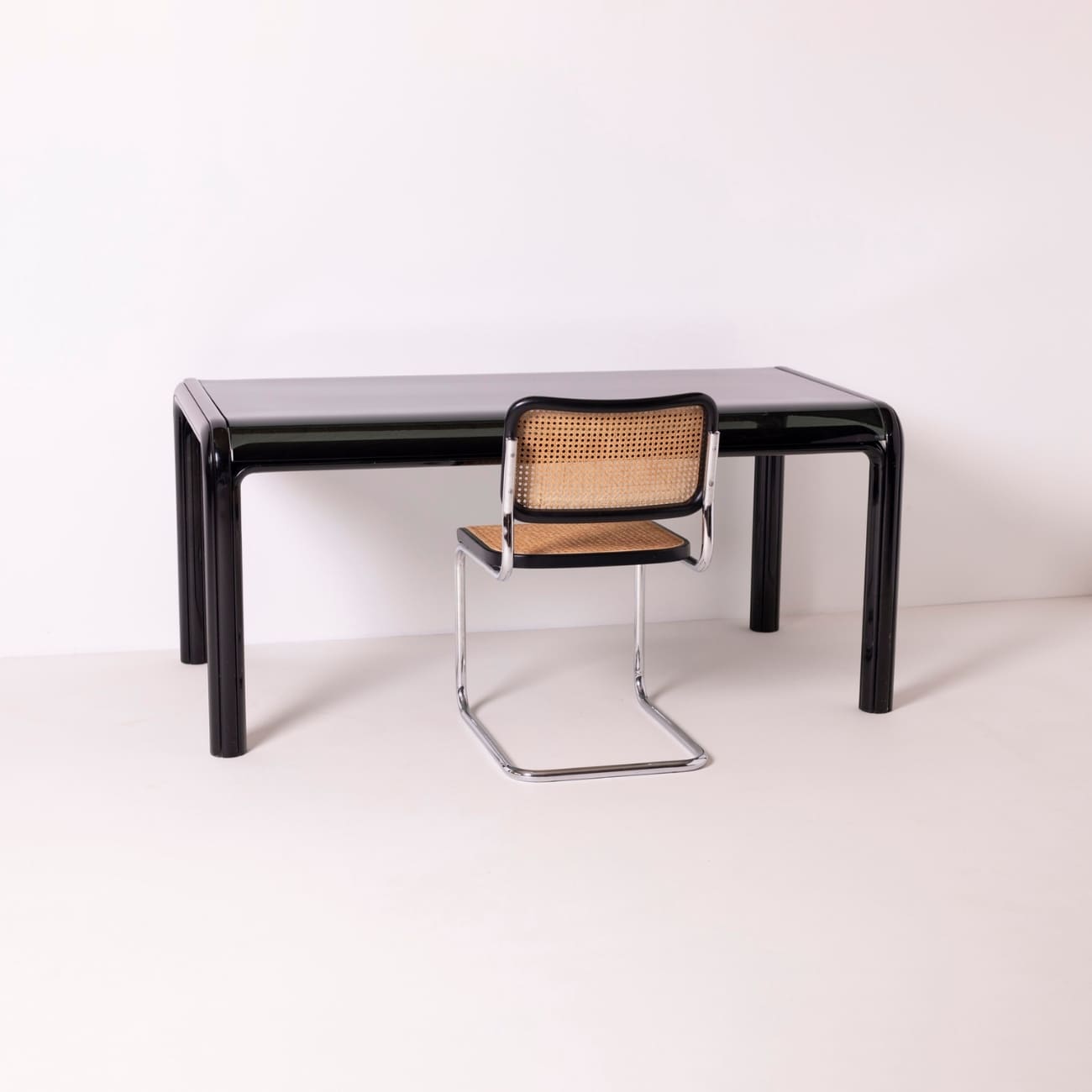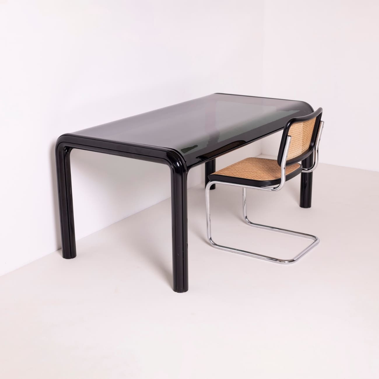 Projekt Gae Aulenti dla Knoll w latach 80. uchwycił elegancję włoskiego modernizmu, łącząc lekkość formy z przemysłową precyzją materiałów. Rama stołu wykonana z czarnego, malowanego aluminium tworzy kontrast z przyciemnianym szkłem hartowanym, które nadaje powierzchni wyrafinowaną przejrzystość.