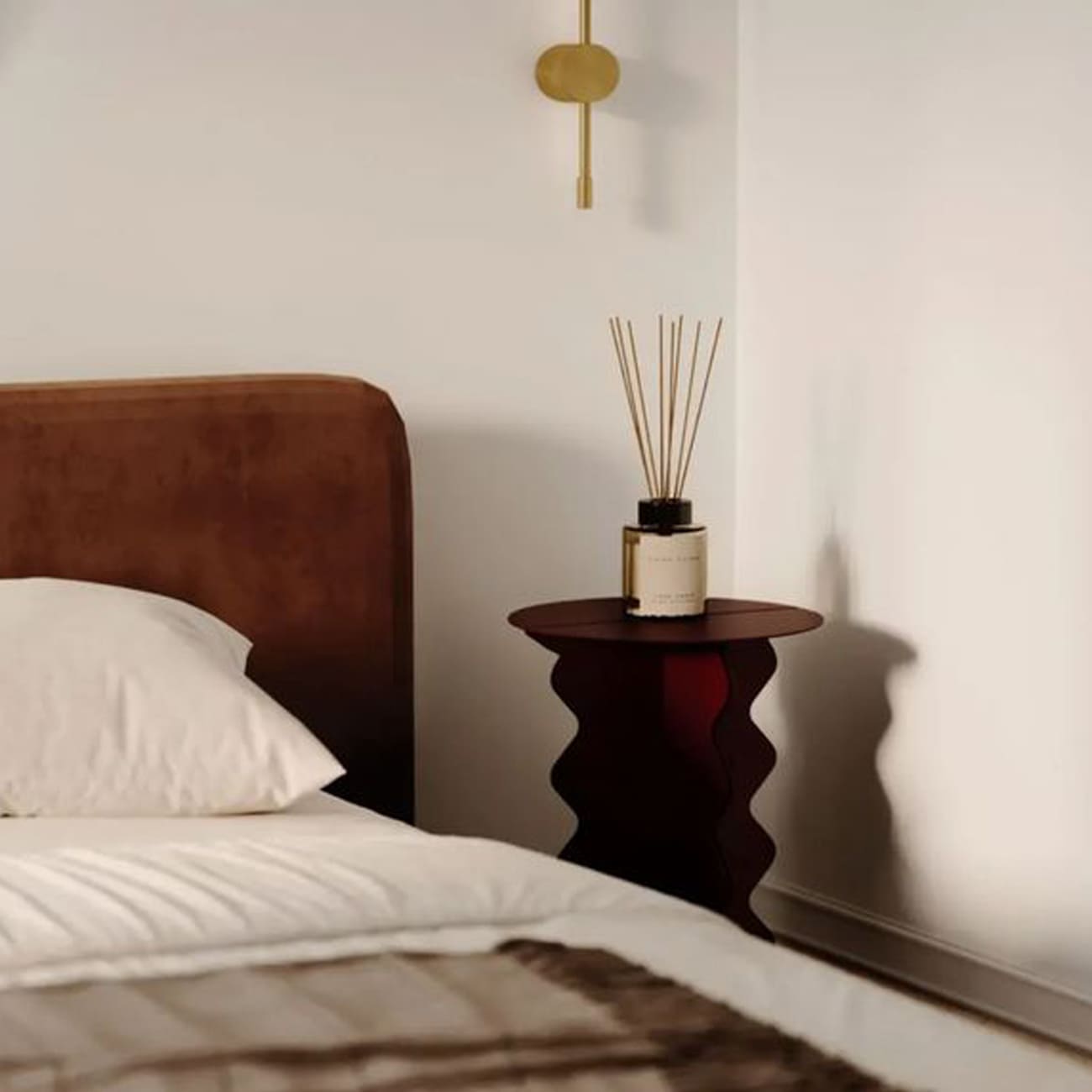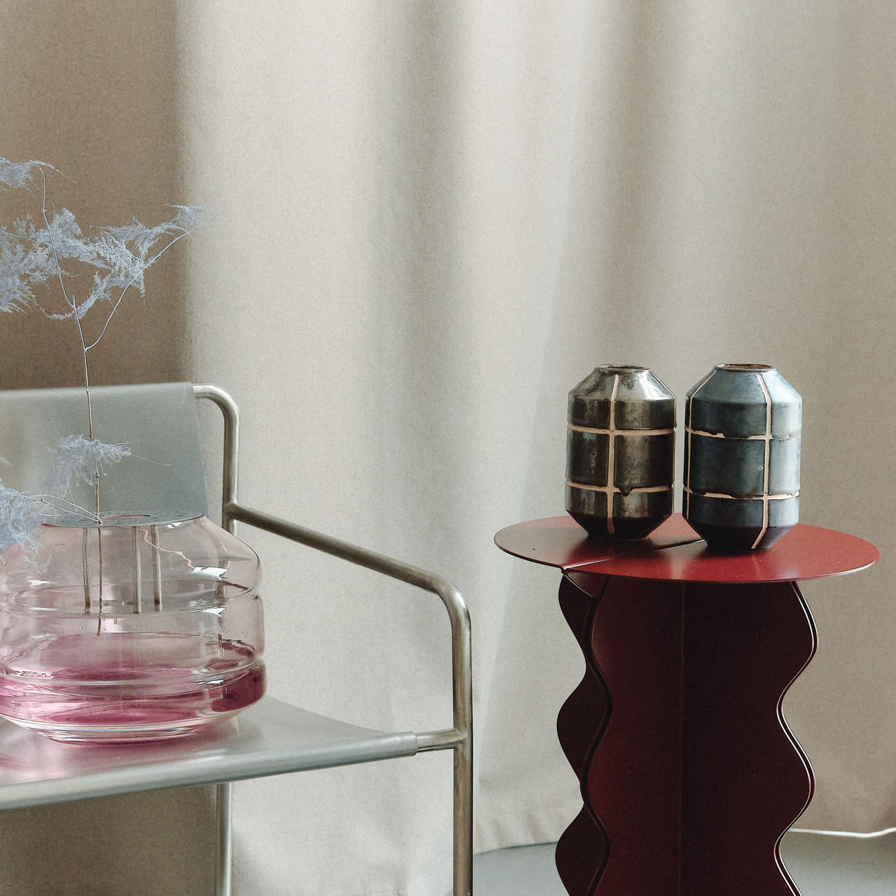 Hvylya S to najmniejszy stolik z kolekcji, zaprojektowany jako kompaktowy akcent o wyraźnej, falującej sylwetce. Jego proporcje pozwalają pracować w przestrzeniach, które wymagają lekkiej, mobilnej formy: przy sofie, obok fotela, w korytarzu lub w strefach, gdzie liczy się precyzyjnie dobrany detal. Podstawa wycinana jest z jednej tafli stali i układa się w rytm, tworząc z niego charakter rzeźbiarskiego elementu, nie tylko mebla użytkowego.