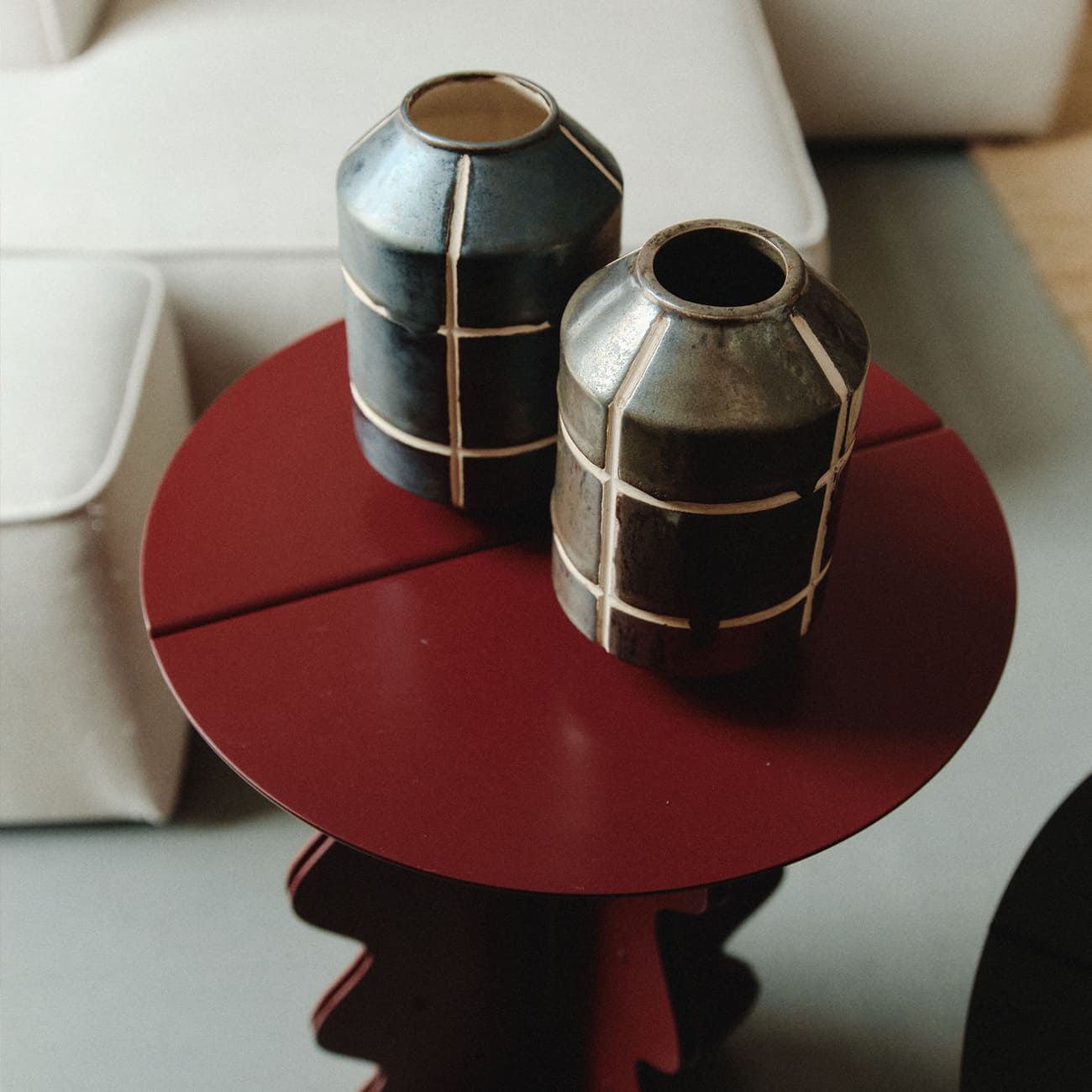 Stal malowana proszkowo ma jednolitą, matową powierzchnię odporną na ścieranie i zachowuje stabilność koloru przy codziennym użytkowaniu. W tej wersji stolik działa jak punkt ciężkości kompozycji — niewielki, ale wizualnie silny, porządkujący otoczenie i tworzący miejsce dla przedmiotów codziennego użytku.