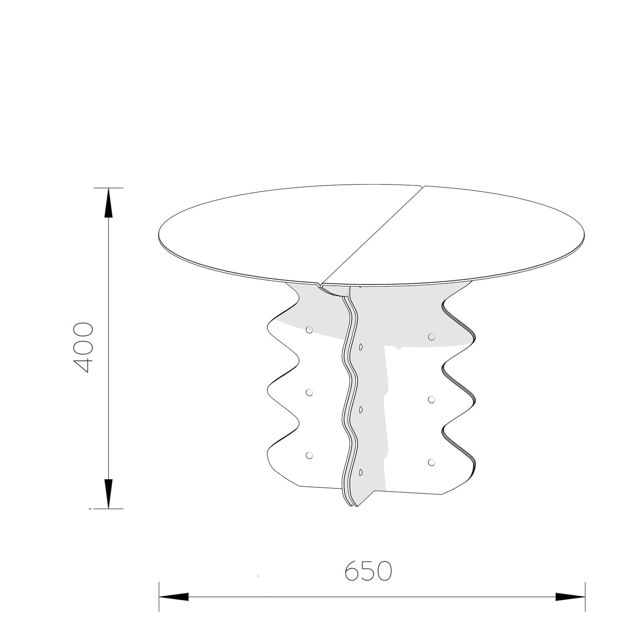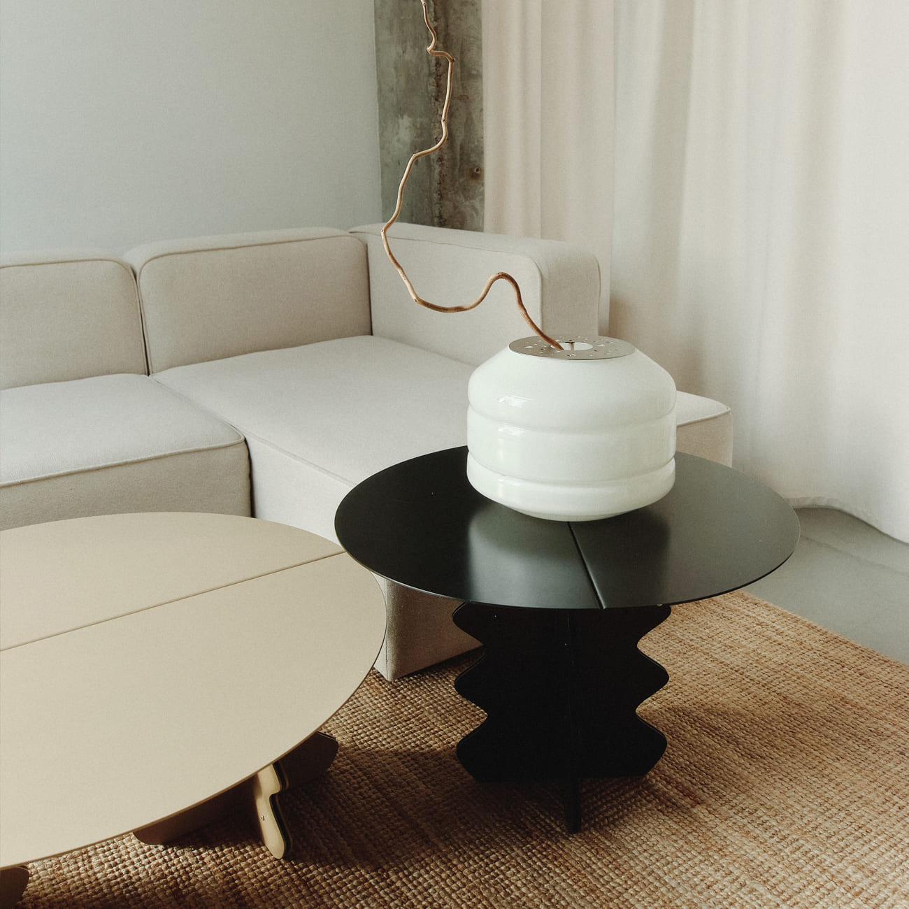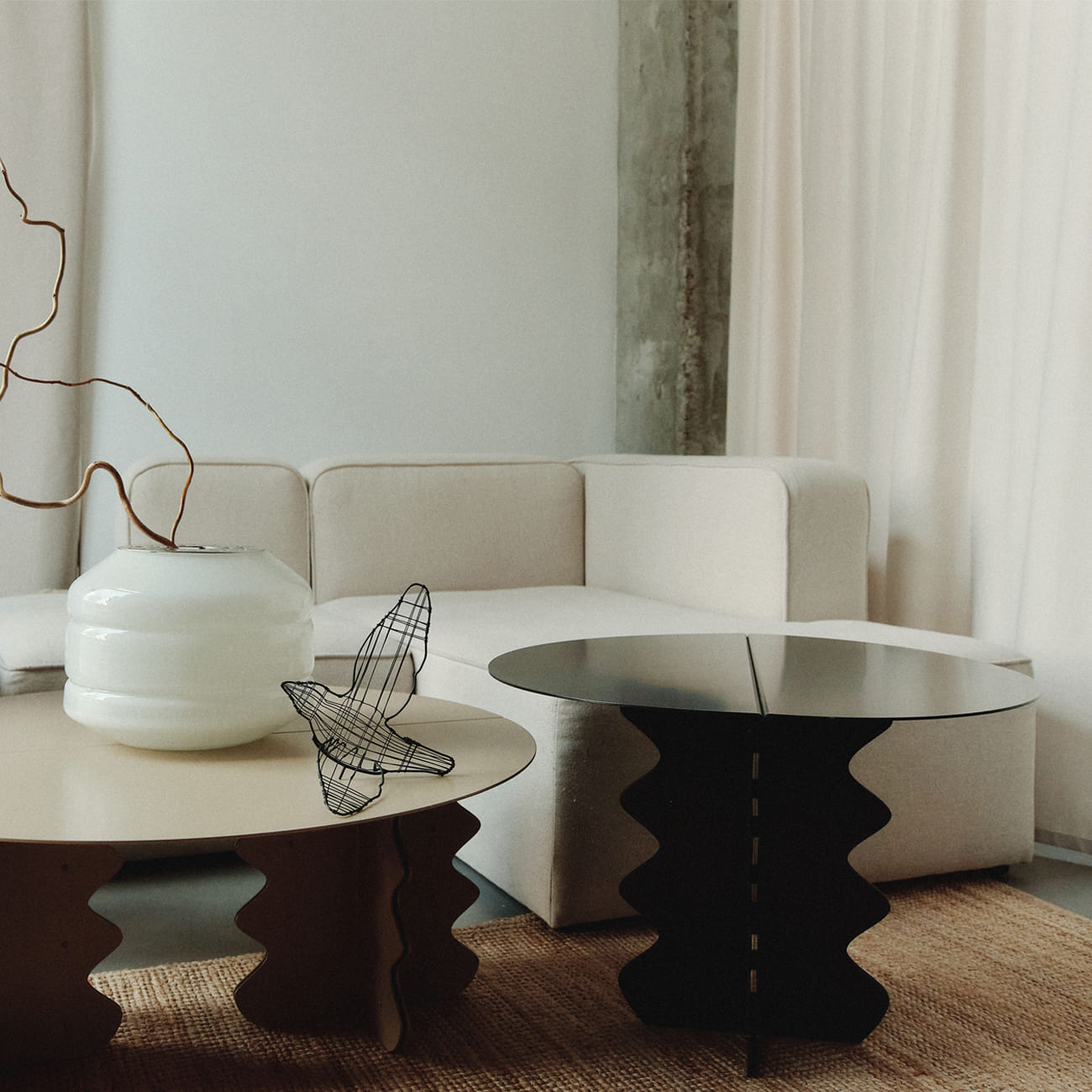 Hvylya M zajmuje pozycję środkową w rodzinie Hvylya. Jego skala pozwala już pracować jako stolik centralny, ale nadal zachowuje lekkość formy charakterystyczną dla mniejszych modeli. Falująca podstawa tworzy wyraźną oś wizualną, która porządkuje przestrzeń wokół, a okrągły blat nadaje całości spokojny, wyważony profil. W tej wersji wyraźnie widać założenie projektowe Julii Kononenko, dla której rytm i proporcja są sposobem na budowanie mebla o rzeźbiarskiej obecności, ale nieprzytłaczającego wnętrza.