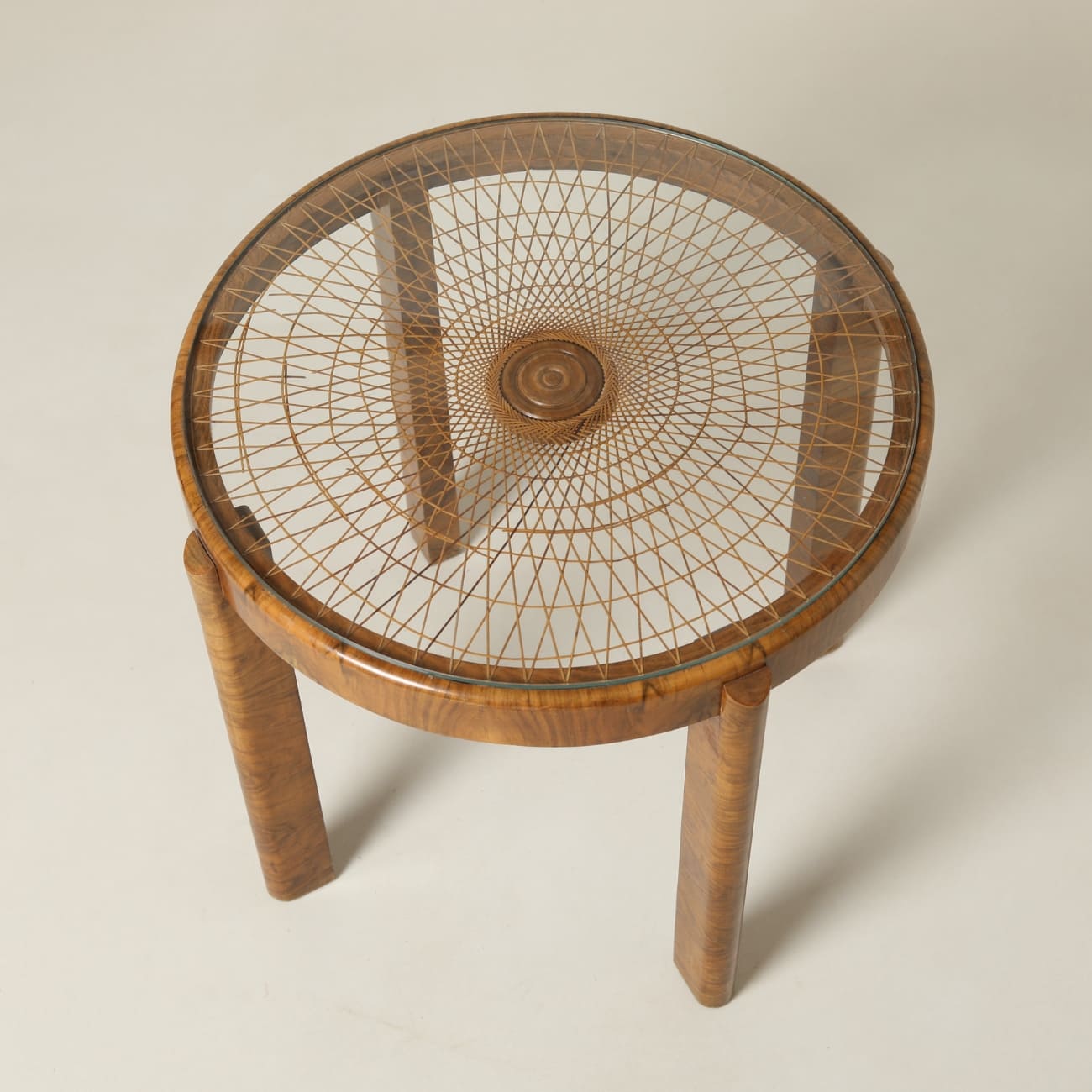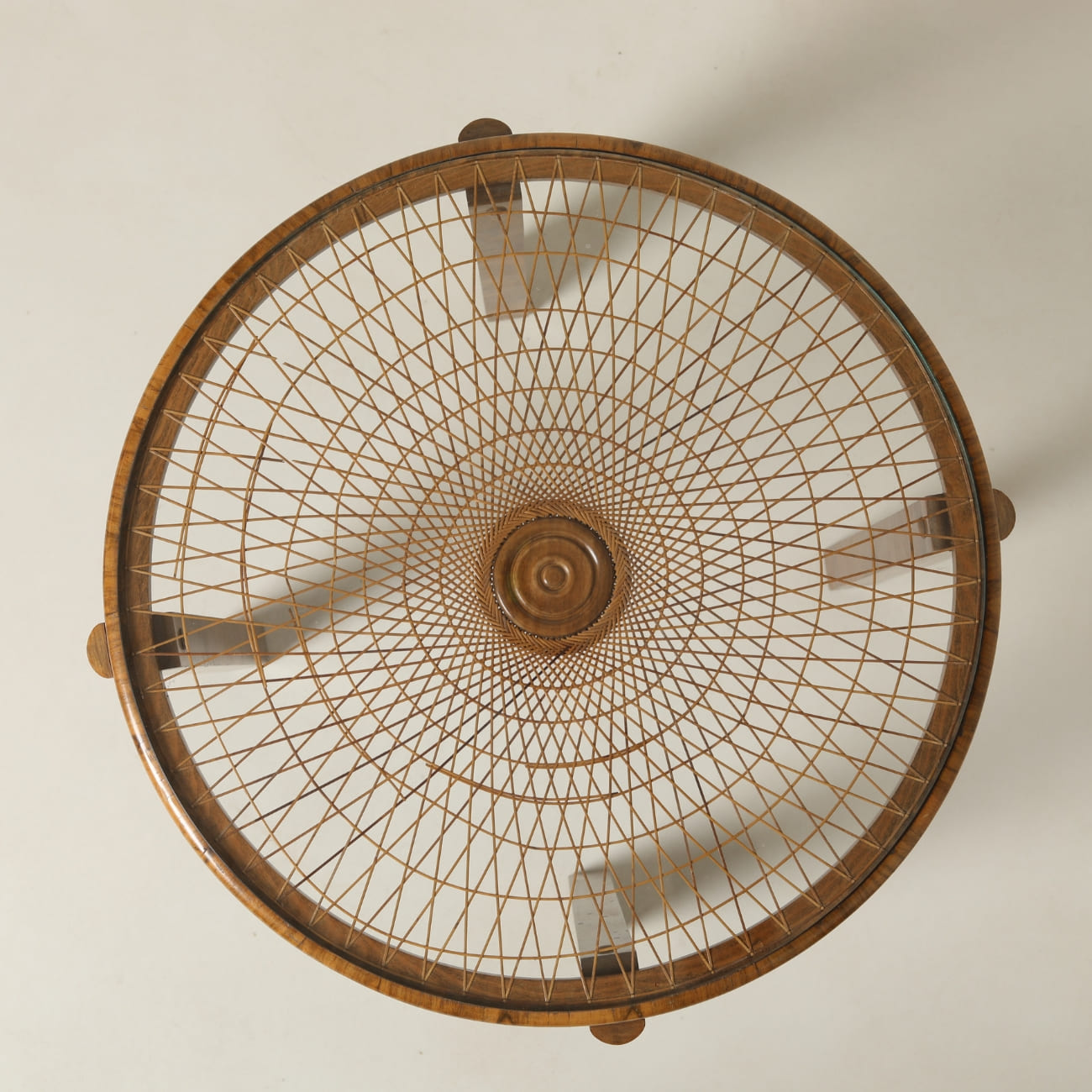 Każdy z użytych materiałów pełni odrębną funkcję. Drewno buduje konstrukcję i wprowadza wizualne ciepło. Rattan tworzy promienisty układ blatu, nadając mu rytm i głębię. Szkło porządkuje powierzchnię użytkową i zabezpiecza delikatną strukturę plecionki. Takie rozwiązanie było stosowane w polskim designie jako sposób łączenia trwałości z lekkością odbioru.