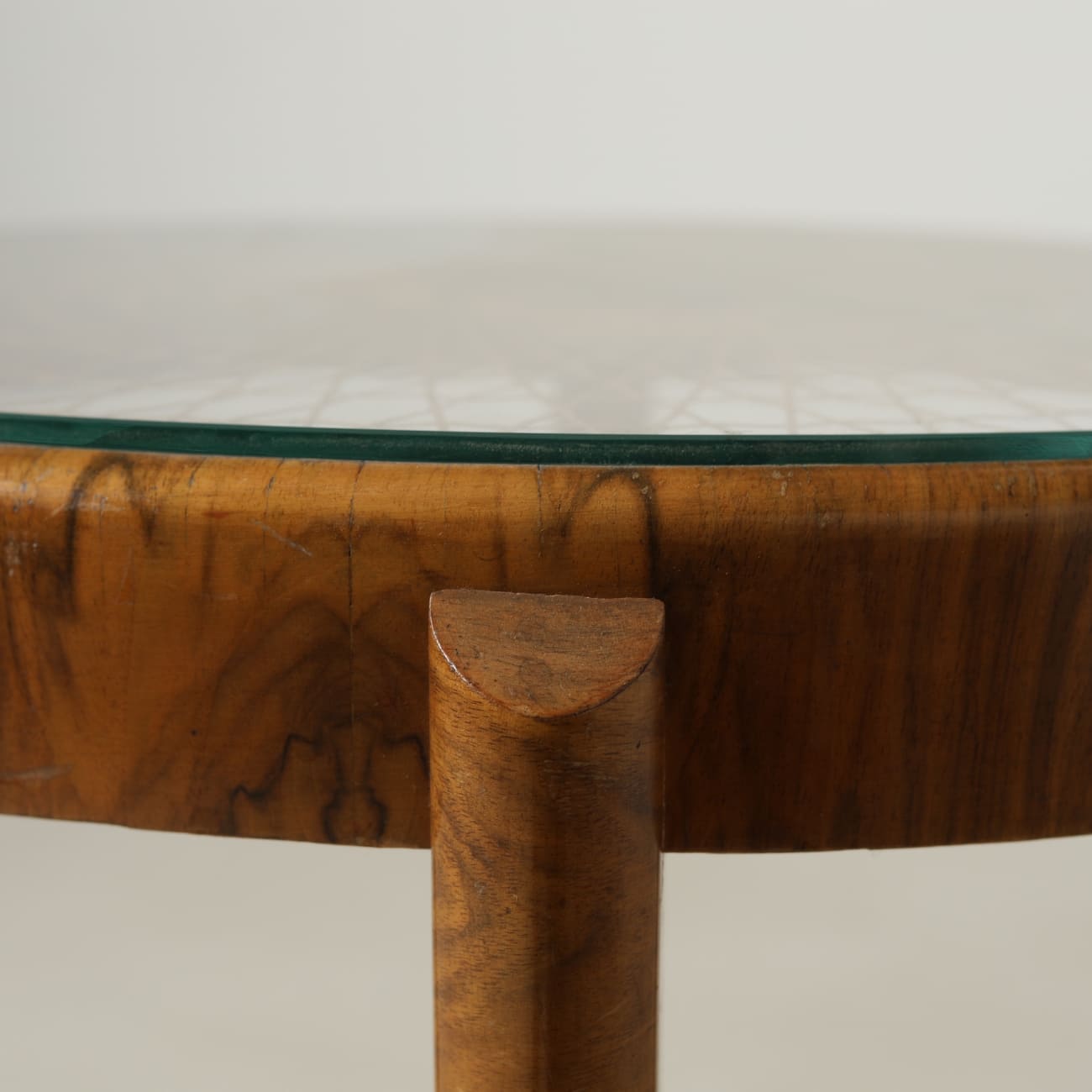 Zestawienie orzecha włoskiego, rattanu i szkła wskazuje na sposób myślenia obecny w polskim wzornictwie połowy XX wieku, w którym dążono do zachowania jakości materiału i czytelności formy mimo zmieniających się warunków produkcji. W tym czasie istotną rolę odgrywało rzemiosło oraz umiejętność pracy z ograniczonymi zasobami przy jednoczesnym utrzymaniu wysokiego poziomu wykonania.