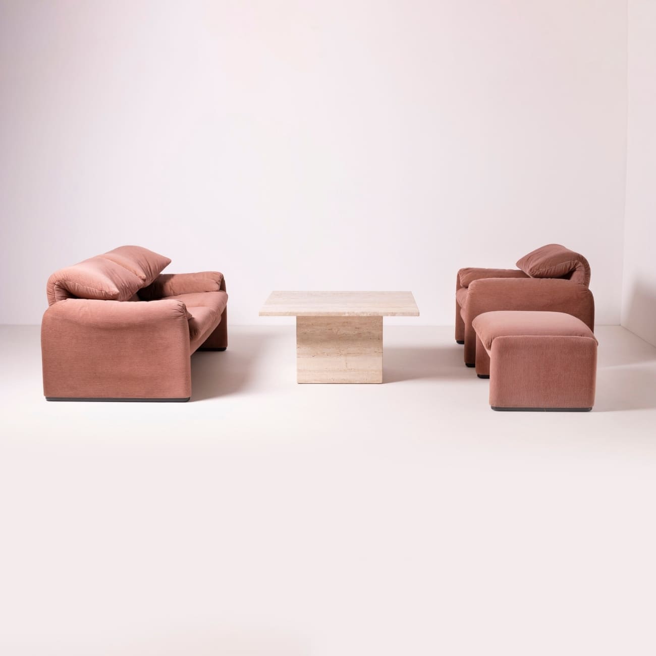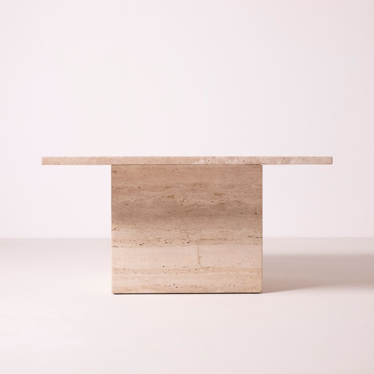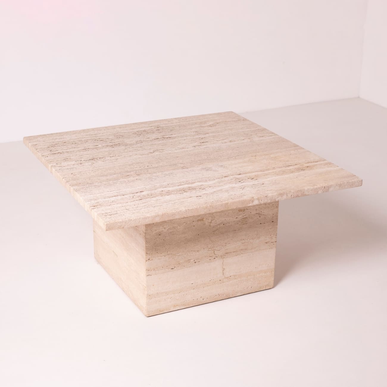Ten stolik kawowy z trawertynu został wykonany we Włoszech w latach 80. XX wieku i reprezentuje estetykę postmodernistycznego wzornictwa. Naturalny kamień o ciepłej tonacji tworzy harmonijną, minimalistyczną formę, typową dla włoskiego designu tego okresu.