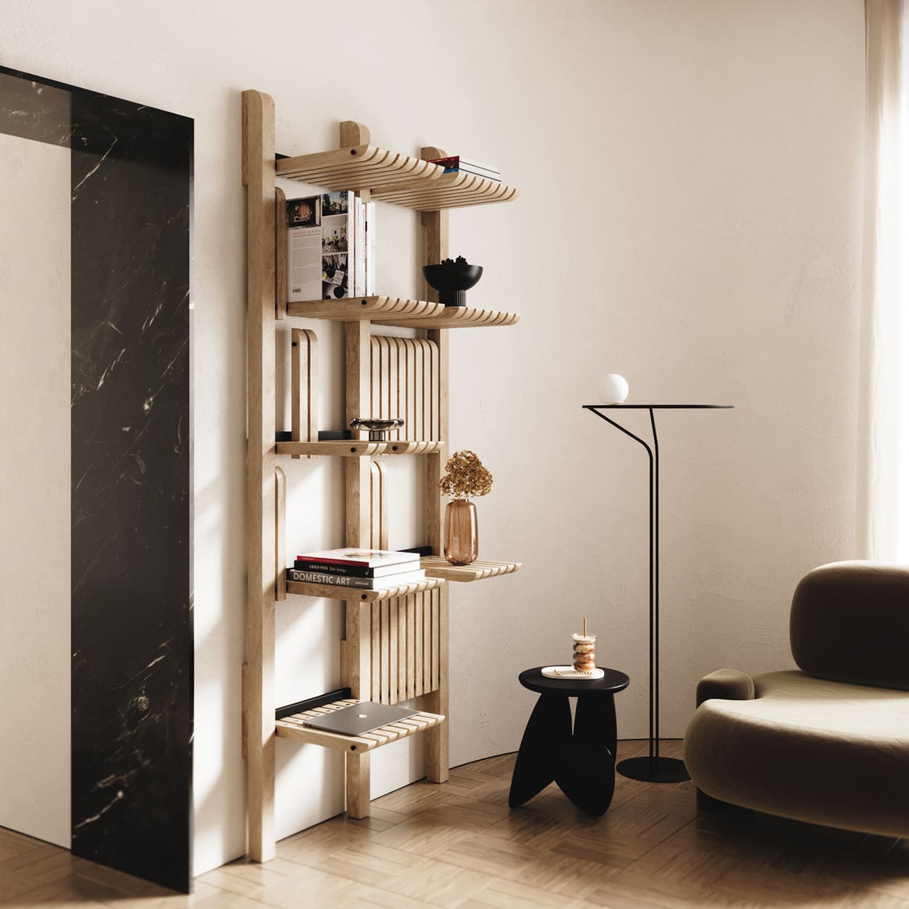 System został zaprojektowany tak, aby zachowywać swój architektoniczny wyraz niezależnie od skali. W węższych konfiguracjach działa jak pionowy akcent organizujący przestrzeń, w szerszych – jak rzeźbiarska ściana wewnętrzna. Mechanizm ukrytych magnesów powoduje, że lamele pozostają w pozycji pionowej, a po opuszczeniu stają się stabilnymi płaszczyznami użytkowymi. Ruchome lamele dają możliwość szybkiej zmiany podziałów i akcentów, dlatego system pozostaje użyteczny w wielu typach przestrzeni — od mieszkań w kamienicach i współczesnych apartamentów po wnętrza komercyjne, takie jak butiki, pracownie, hotele, kameralne biura, restauracje.