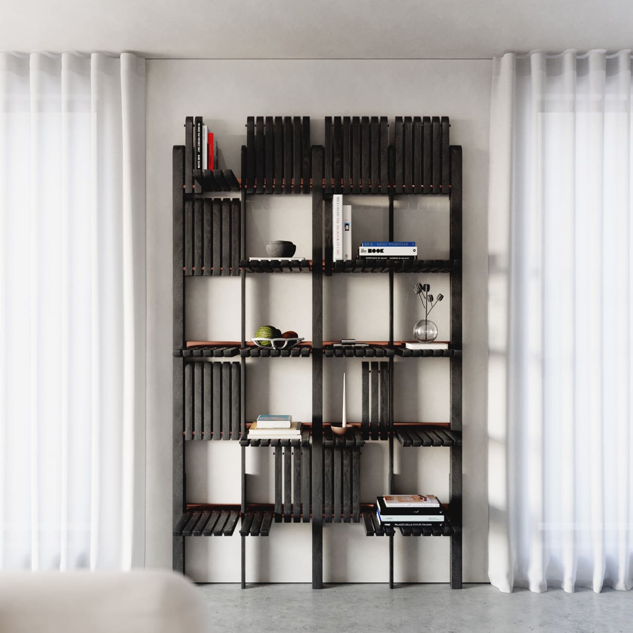 System regałów modułowych Gate 1500, jesion bejcowany na czarno, proj. Artem Zakharchenko, Ukraina, 2017.