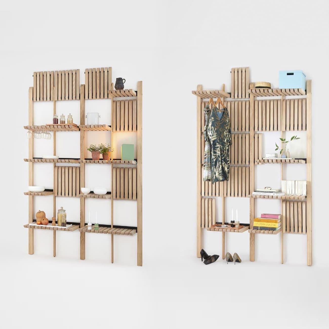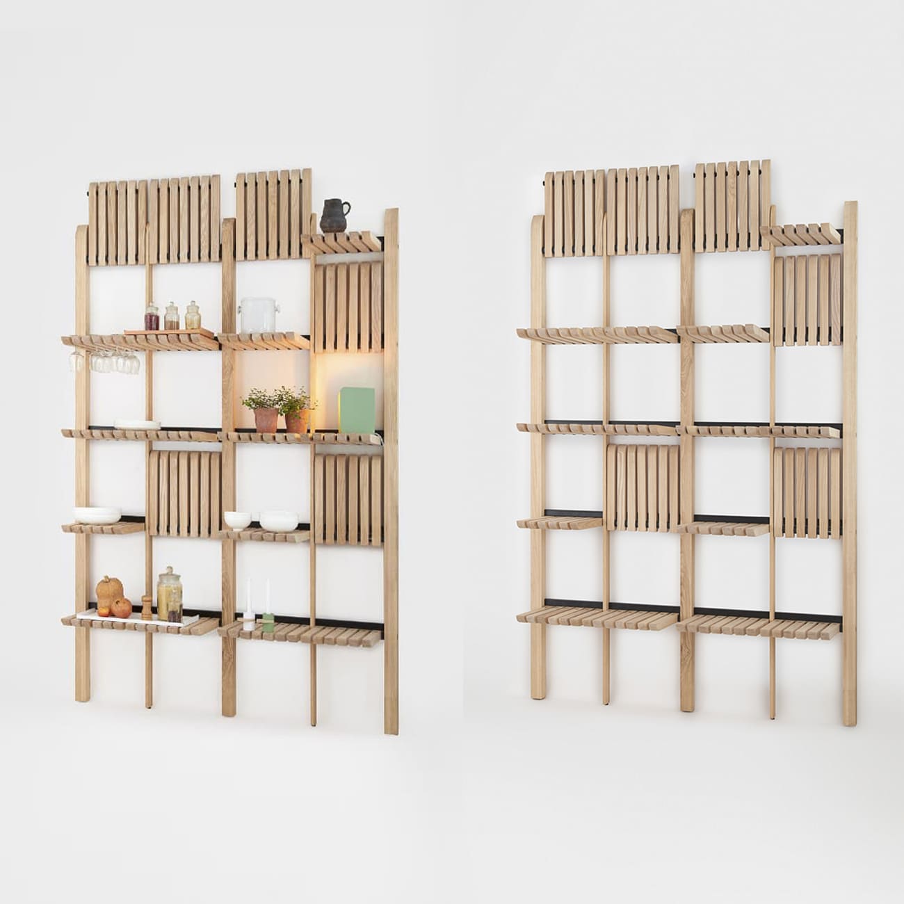 System regałów modułowych Gate 1500, jesion bejcowany orzechowy, proj. Artem Zakharchenko, Ukraina, 2017.