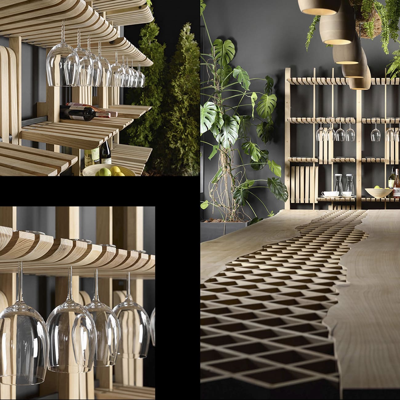 System został zaprojektowany tak, aby zachowywać swój architektoniczny wyraz niezależnie od skali. W węższych konfiguracjach działa jak pionowy akcent organizujący przestrzeń, w szerszych – jak rzeźbiarska ściana wewnętrzna. Mechanizm ukrytych magnesów powoduje, że lamele pozostają w pozycji pionowej, a po opuszczeniu stają się stabilnymi płaszczyznami użytkowymi. Ruchome lamele dają możliwość szybkiej zmiany podziałów i akcentów, dlatego system pozostaje użyteczny w wielu typach przestrzeni — od mieszkań w kamienicach i współczesnych apartamentów po wnętrza komercyjne, takie jak butiki, pracownie, hotele, kameralne biura, restauracje.