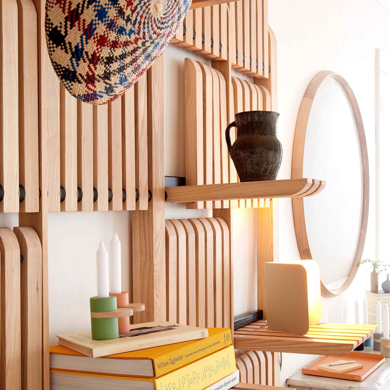 System Gate to konstrukcja modułów ściennych, pomyślana jak mała architektura: klarowna w rytmie, powściągliwa w formie, a jednocześnie zdolna uporządkować przestrzeń jednym, zdecydowanym gestem. Drewniane lamele z litego jesionu, osadzone na stalowej ramie, tworzą układ, w którym pion i poziom nie rywalizują ze sobą, lecz doskonale współgrają. Każdy panel można unieść lub opuścić dotykiem, dzięki czemu struktura żyje w tempie domu, reagując na zmianę funkcji czy nastroju.