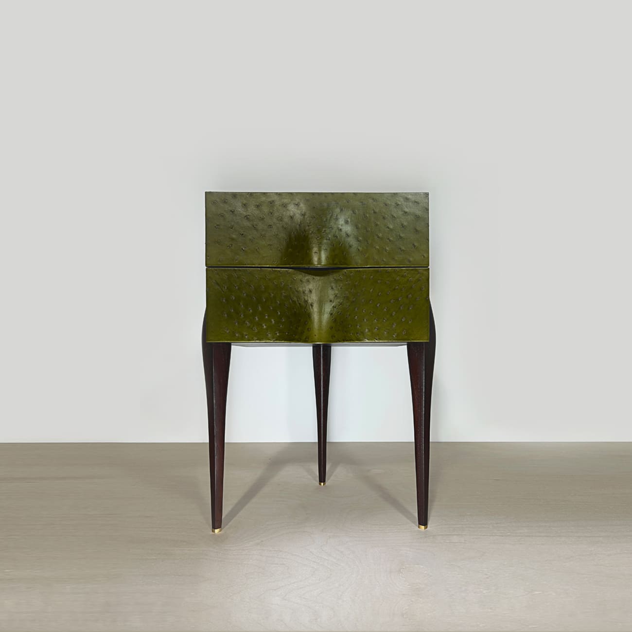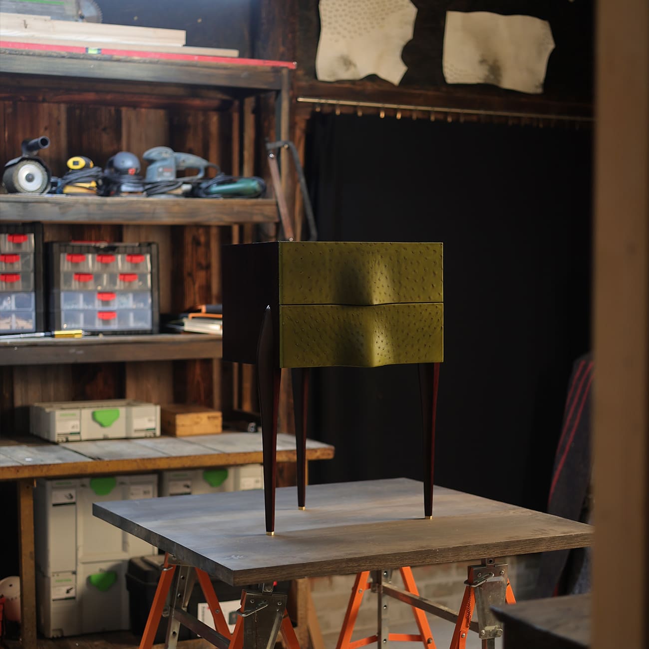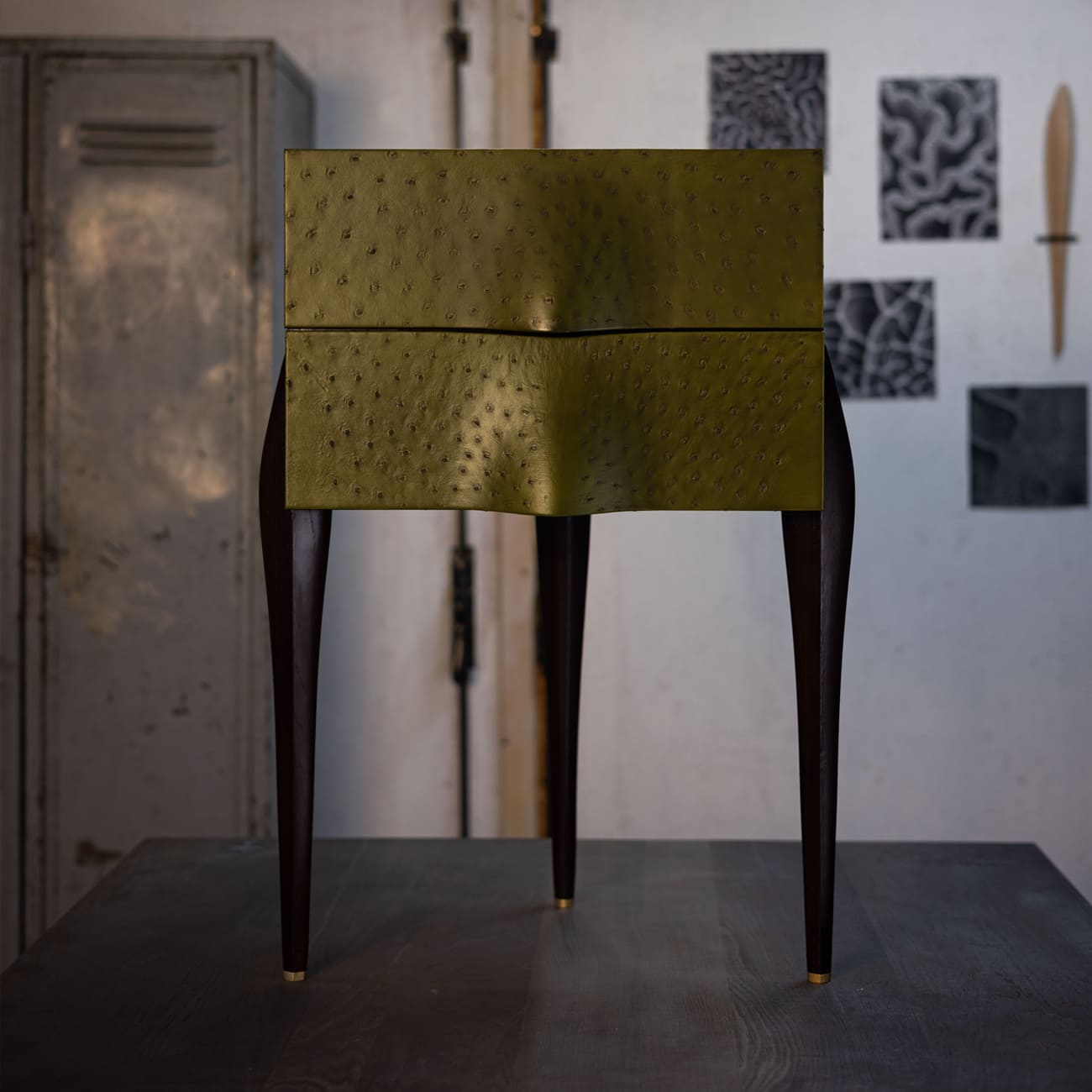 Szafka nocna Ostria Olive, dąb i pergamin strusi, proj. M. Palucki, Francja, 2024.